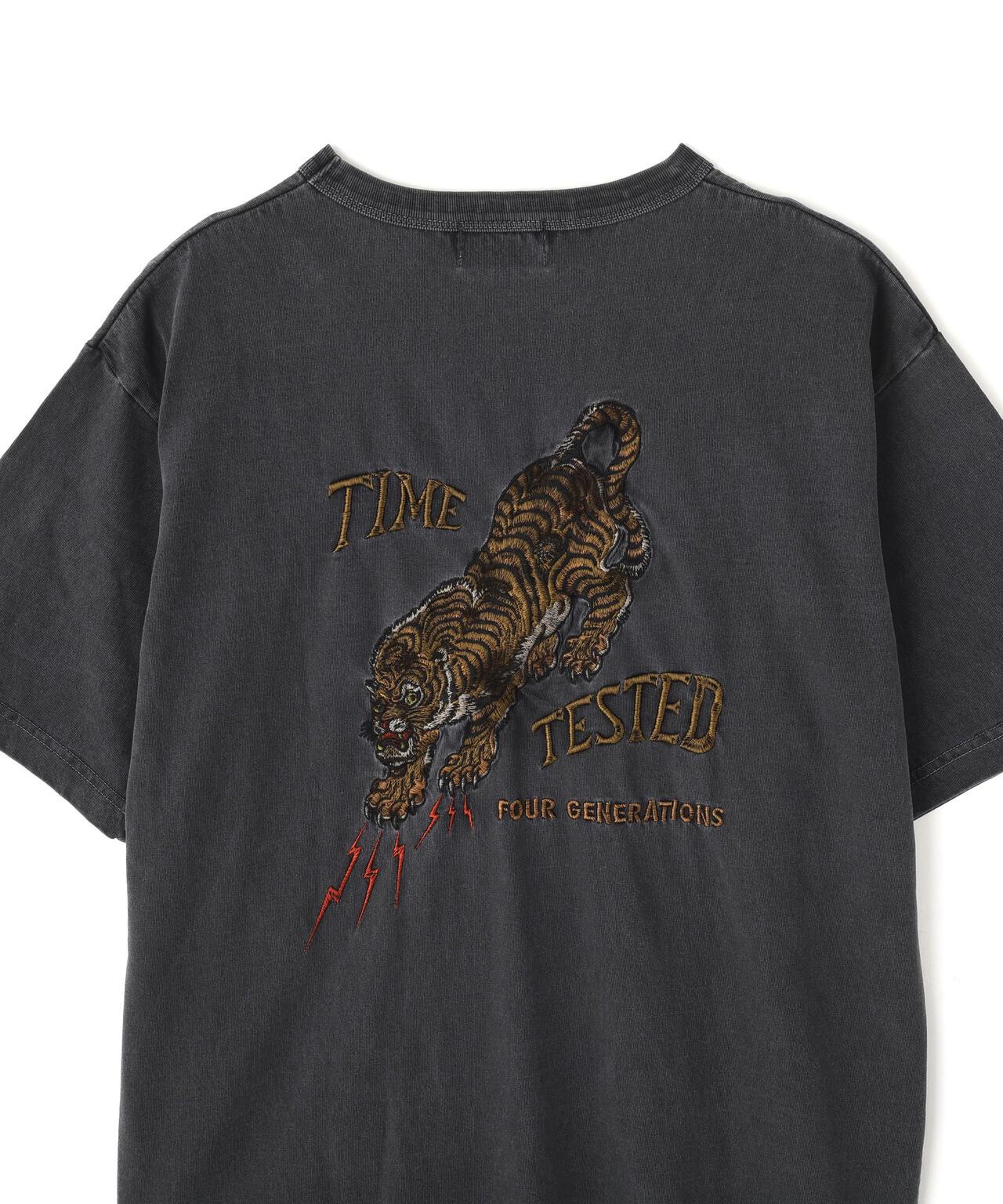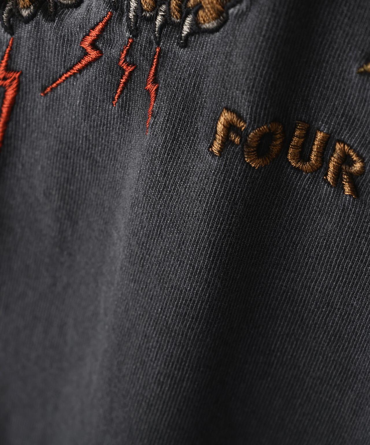 採用 7 盎司重磅紗體,具有堅實的厚度。它的特點是乾爽、挺括,體現了粗獷的美國品牌特色,同時具有隻有開口紗線才能提供的豐滿感。衣領採用了粘合頸規格,具有極佳的耐用性。通過縫製環繞衣身的帶狀衣領部分,使其成為不失堅韌的飾面。背面是在國內外享有盛譽的簽名畫家 BACK AND FORTH SIGNS.CO. 的 TSUBASA 先生👍繪製的圖案。他以汽車文化為背景的藝術作品被賦予了一種存在感。此外,大量採用的刺繡工藝也是該系列的一大亮點。