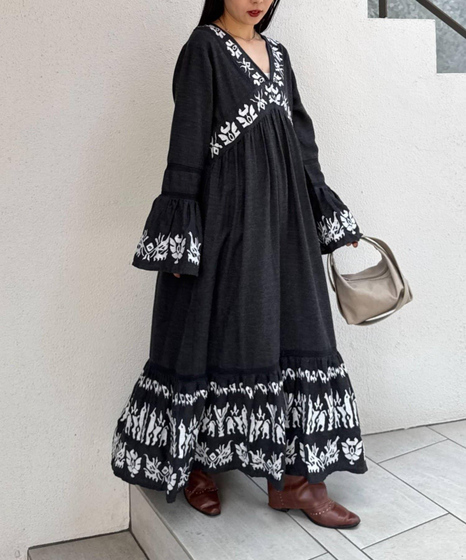精緻的刺繡和喇叭袖給人華麗的印象,這款連衣裙具有出色的存在感。