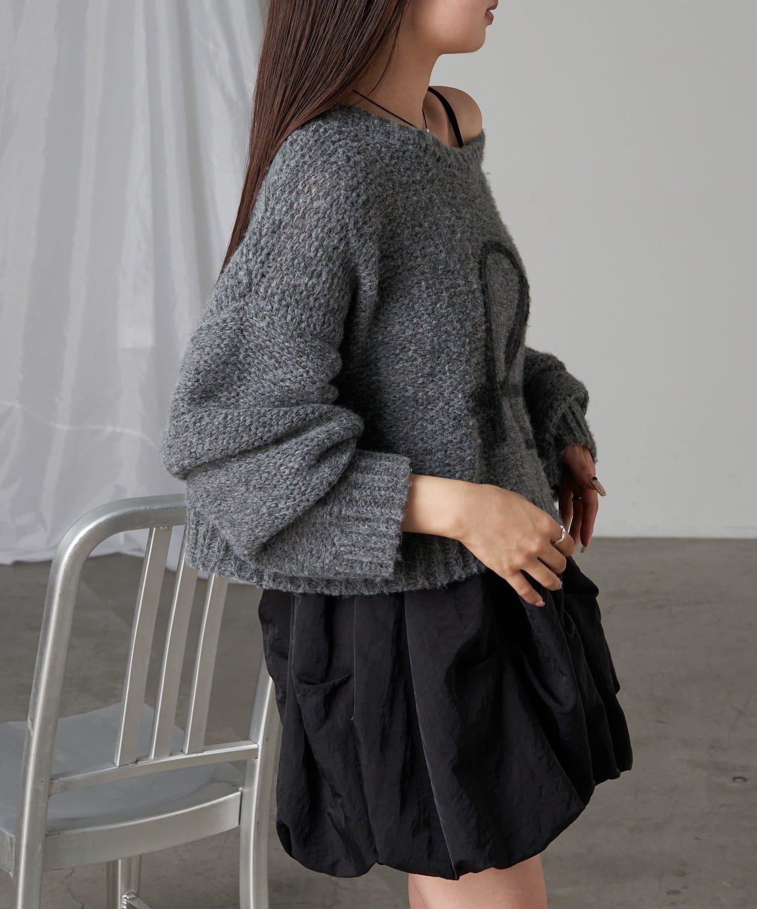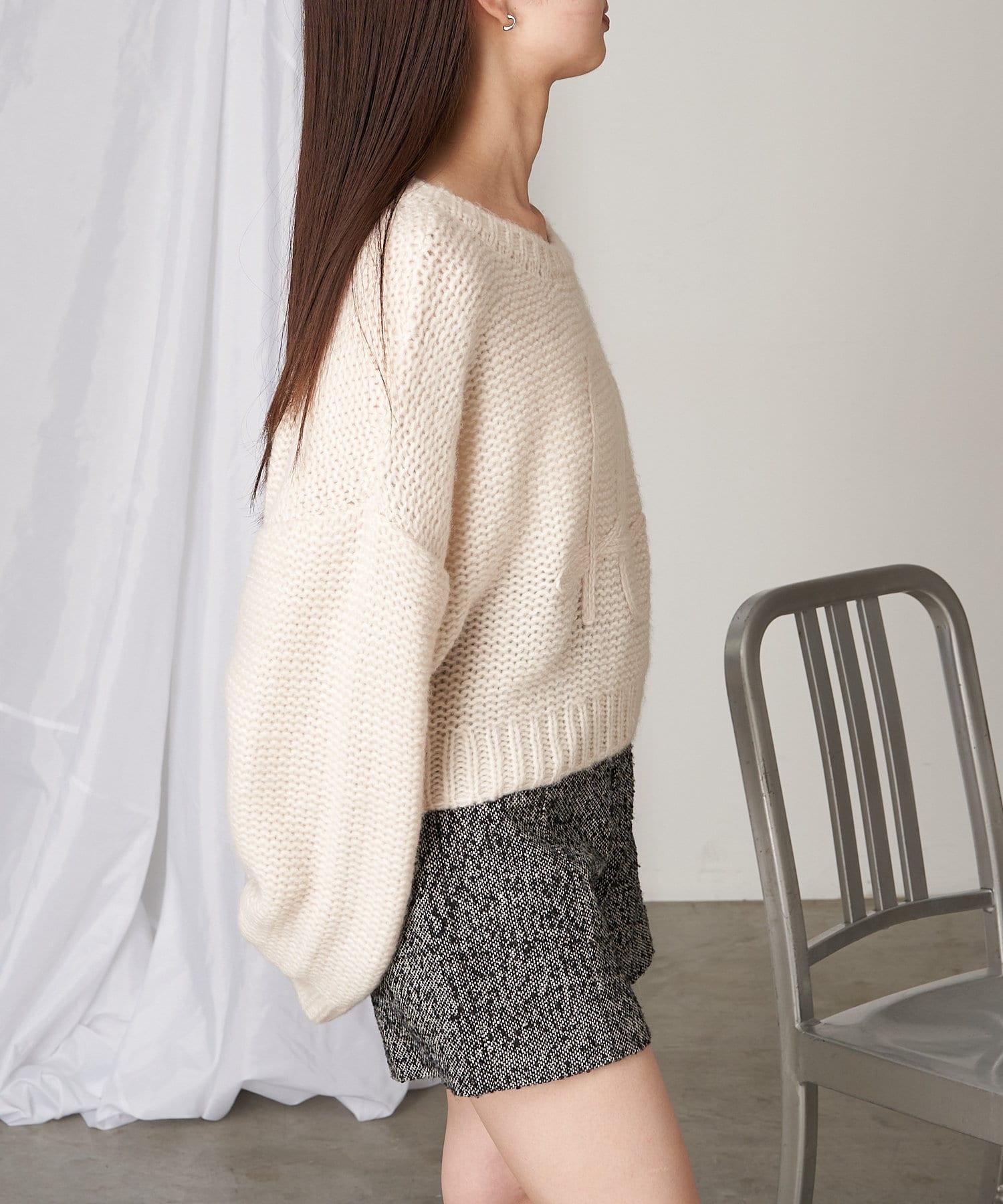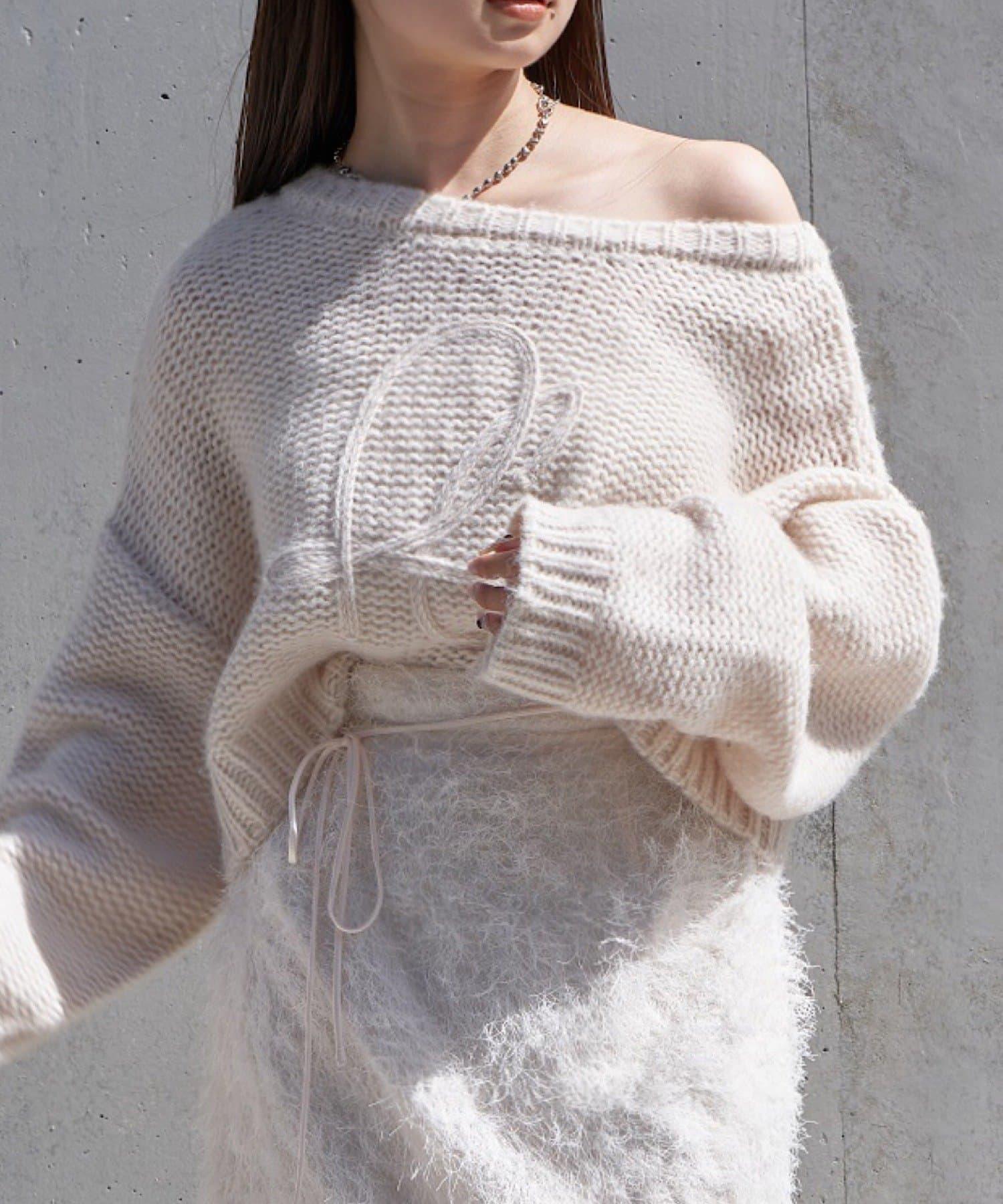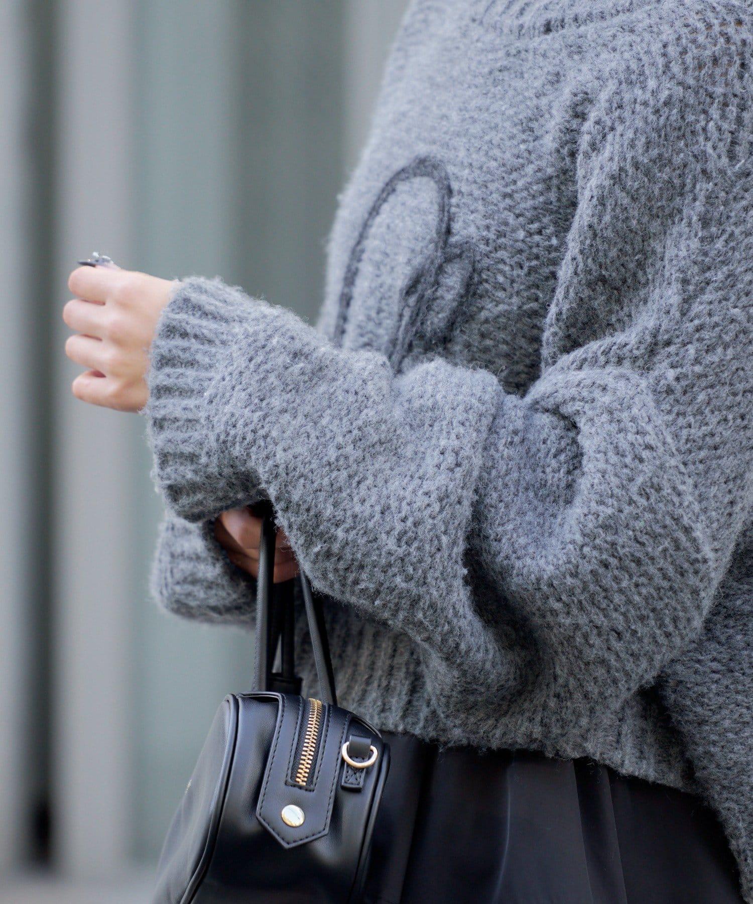 一款針織衫,可前後兩穿,也可單肩穿,讓頸部看起來更圓潤。