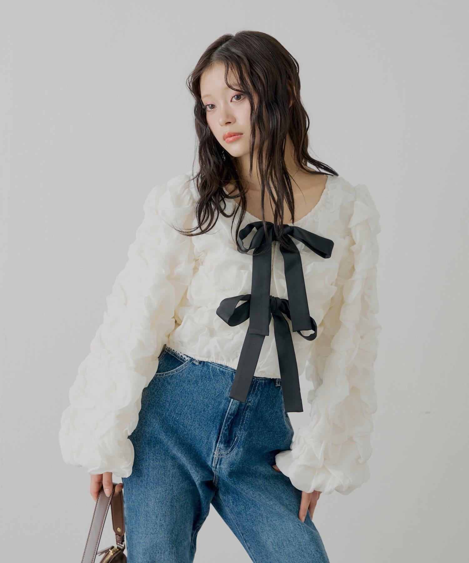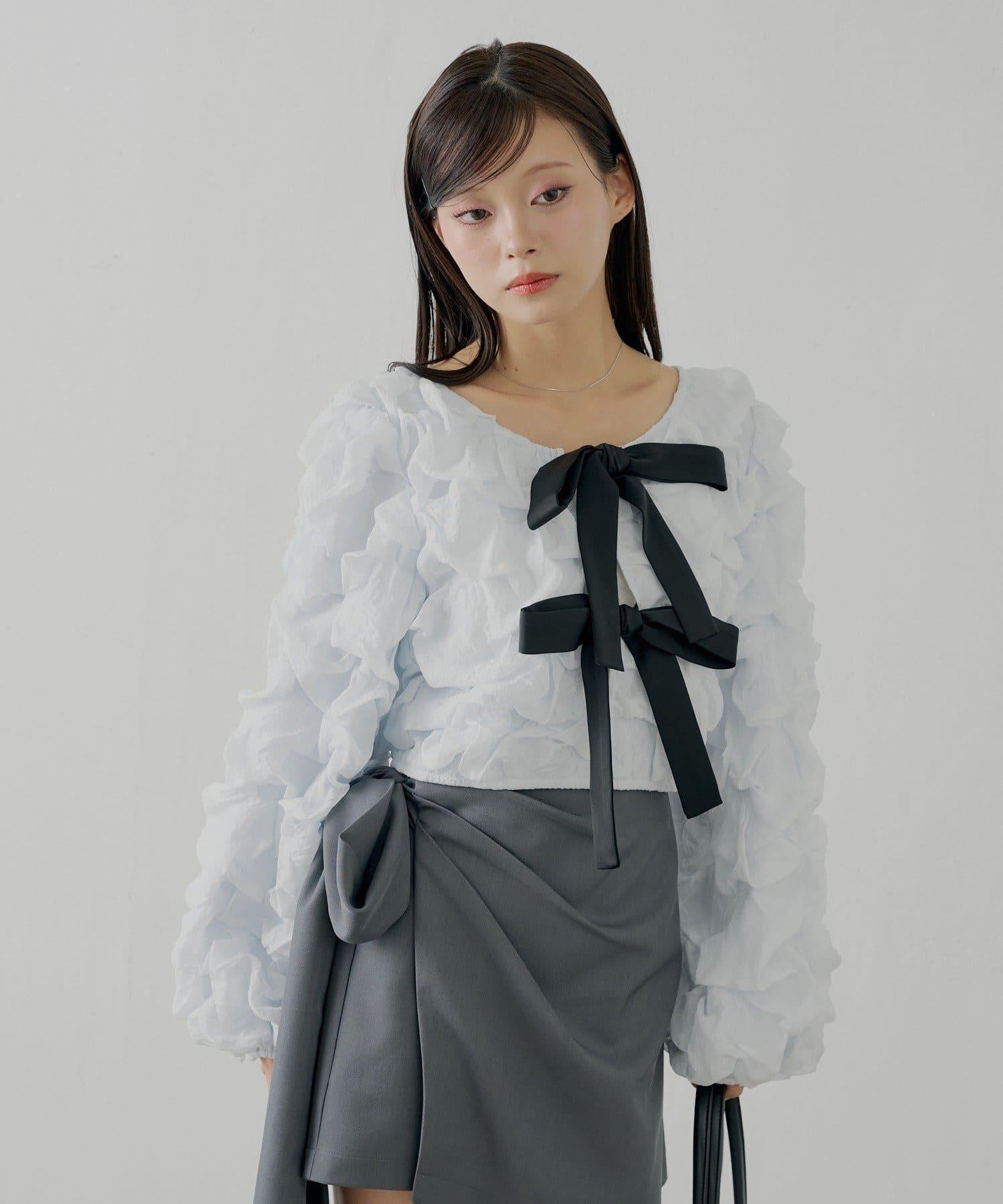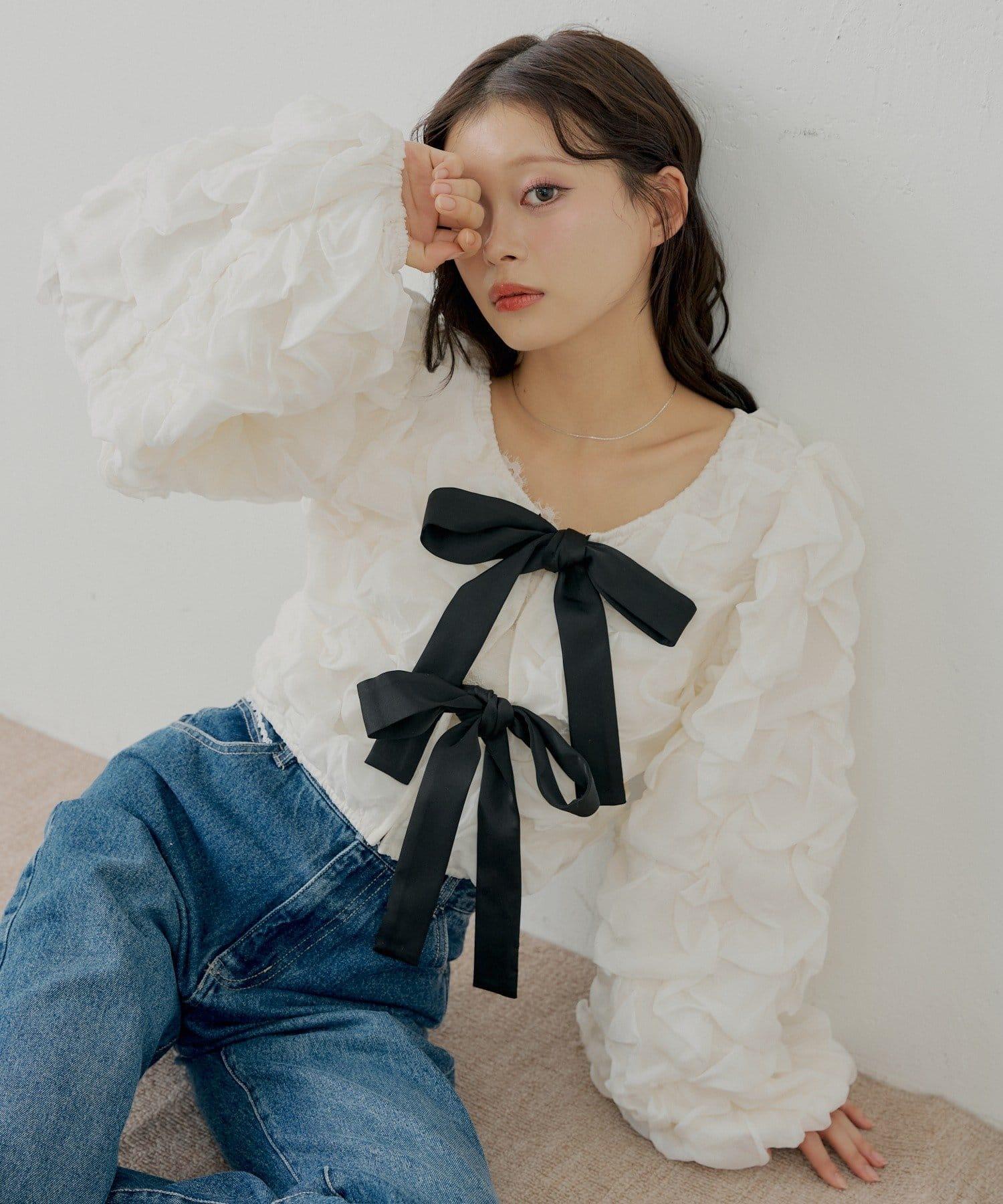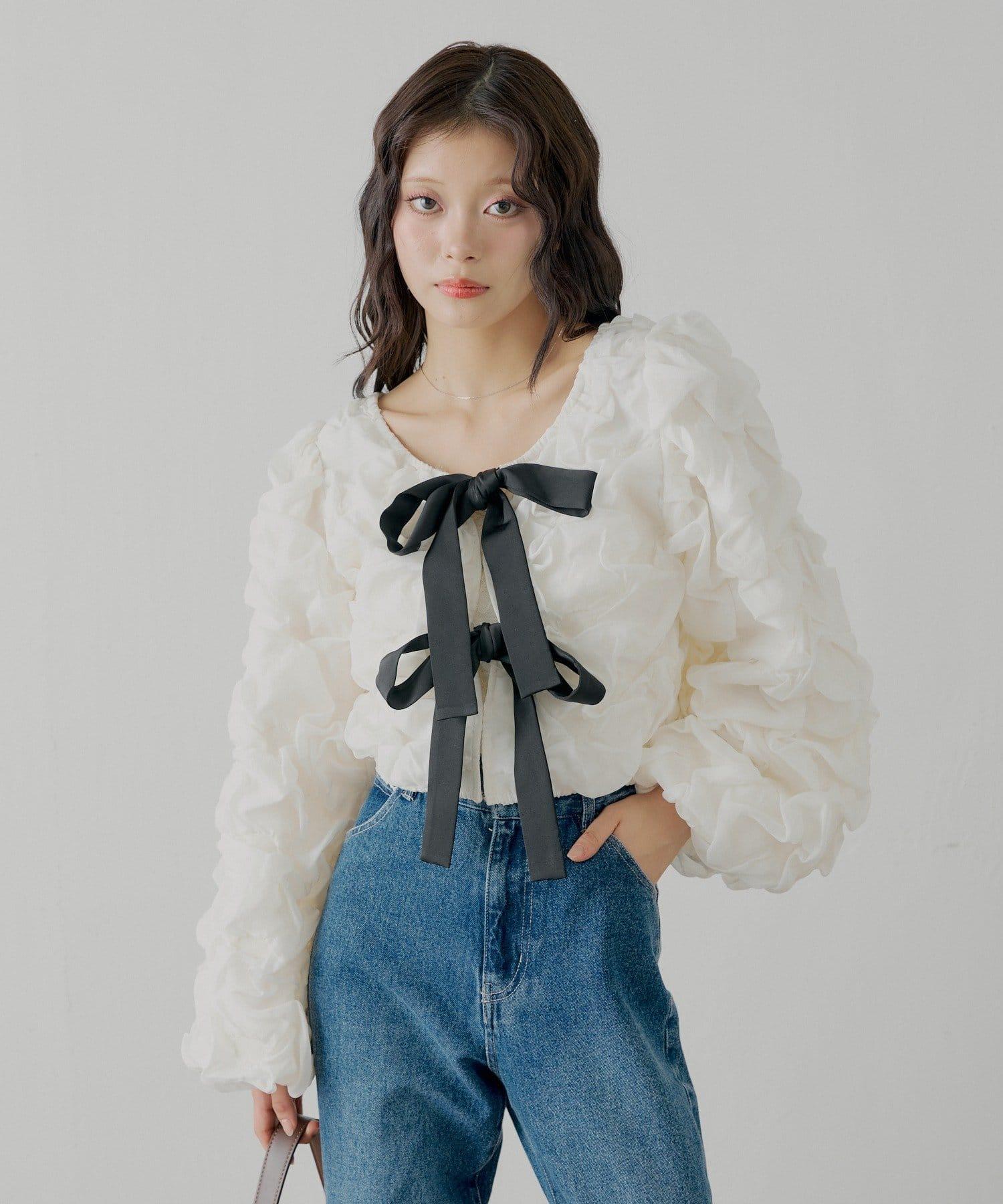 前後兩穿立體蝴蝶結泡泡紋理襯衫