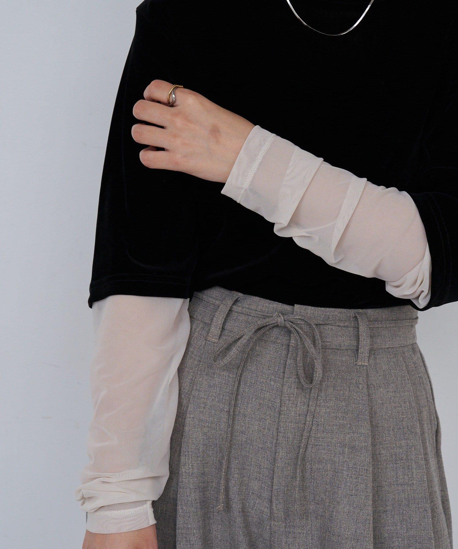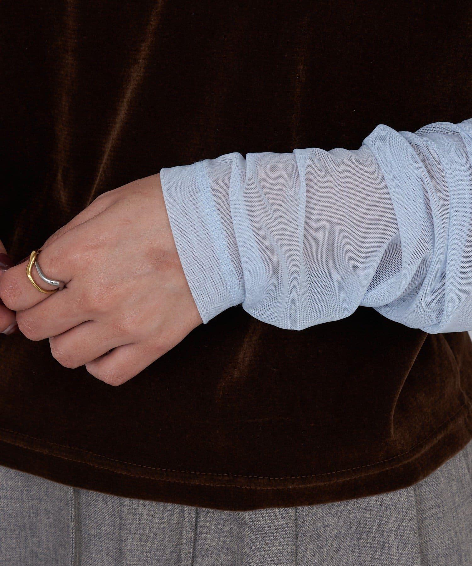 袖子和頸部採用半透明感的透視面料,以光亮平滑的絲絨面料為基礎。