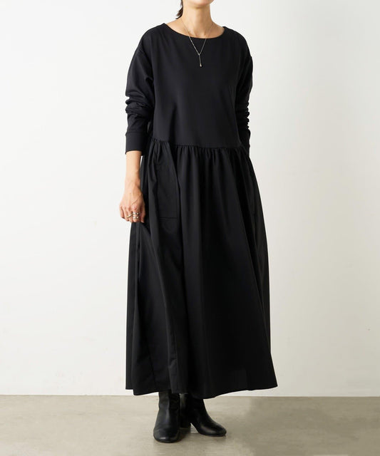 這是一款採用不對稱設計的長衫連衣裙,不同材質的混搭魅力十足。