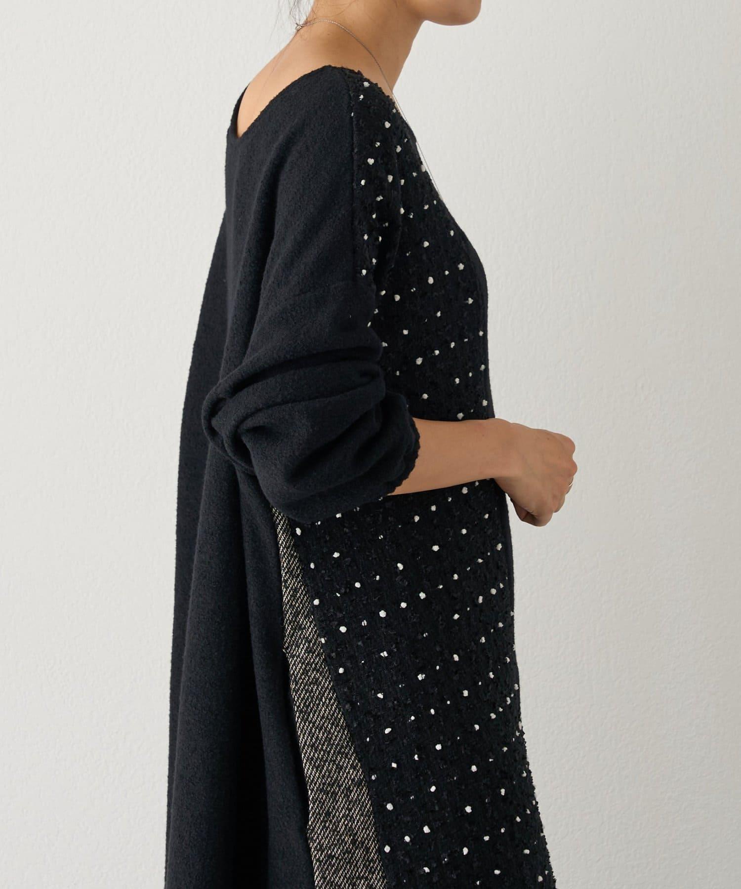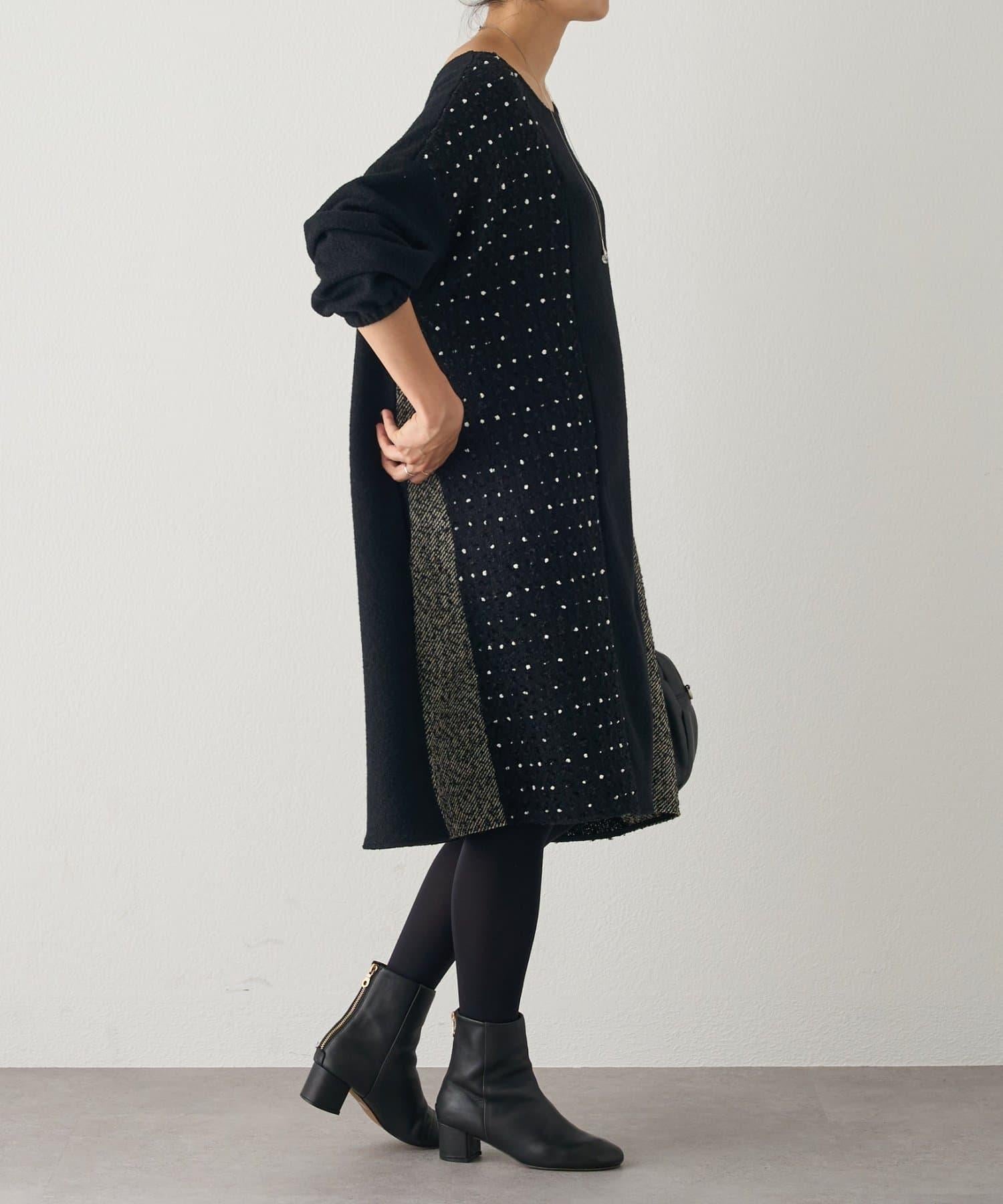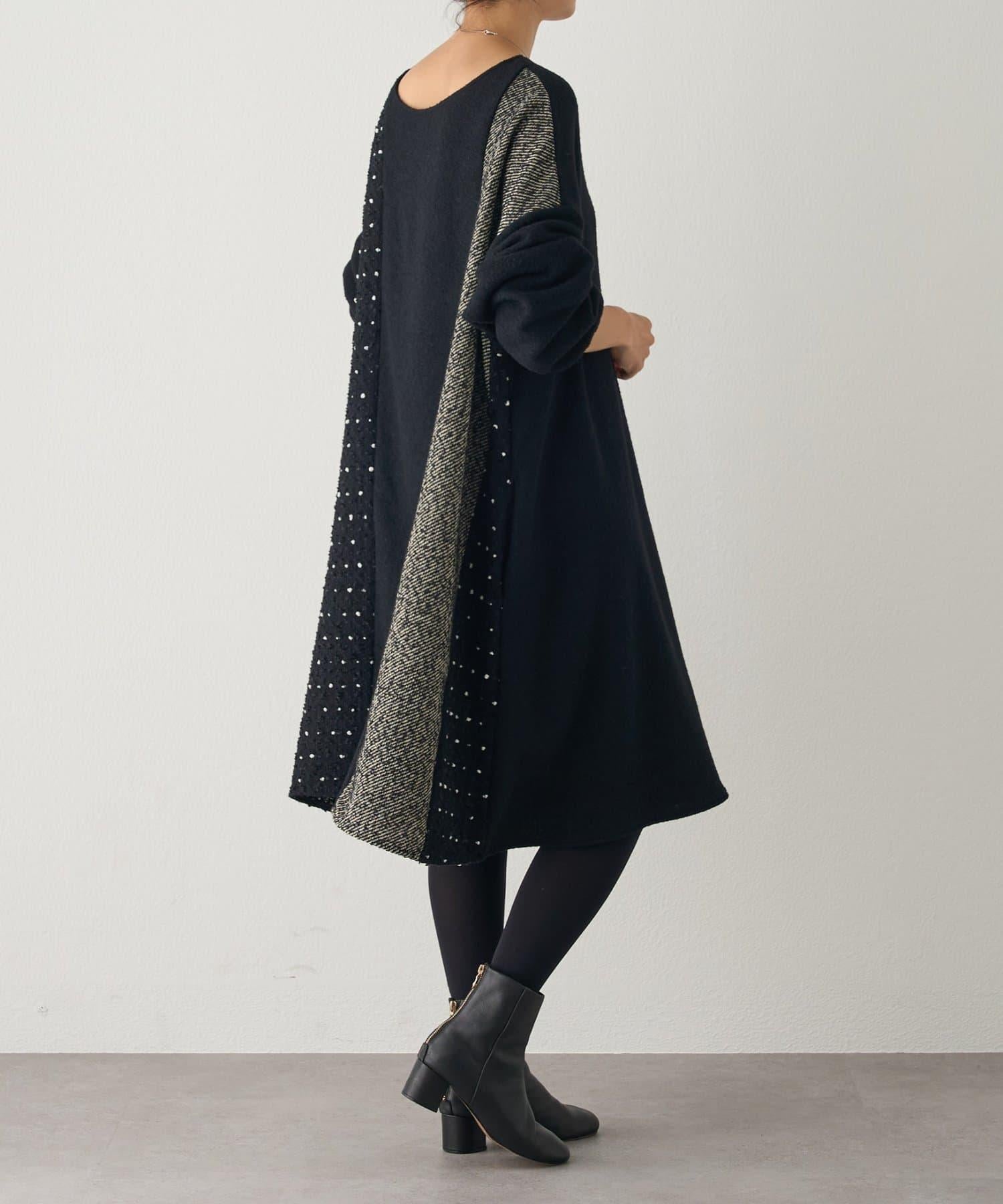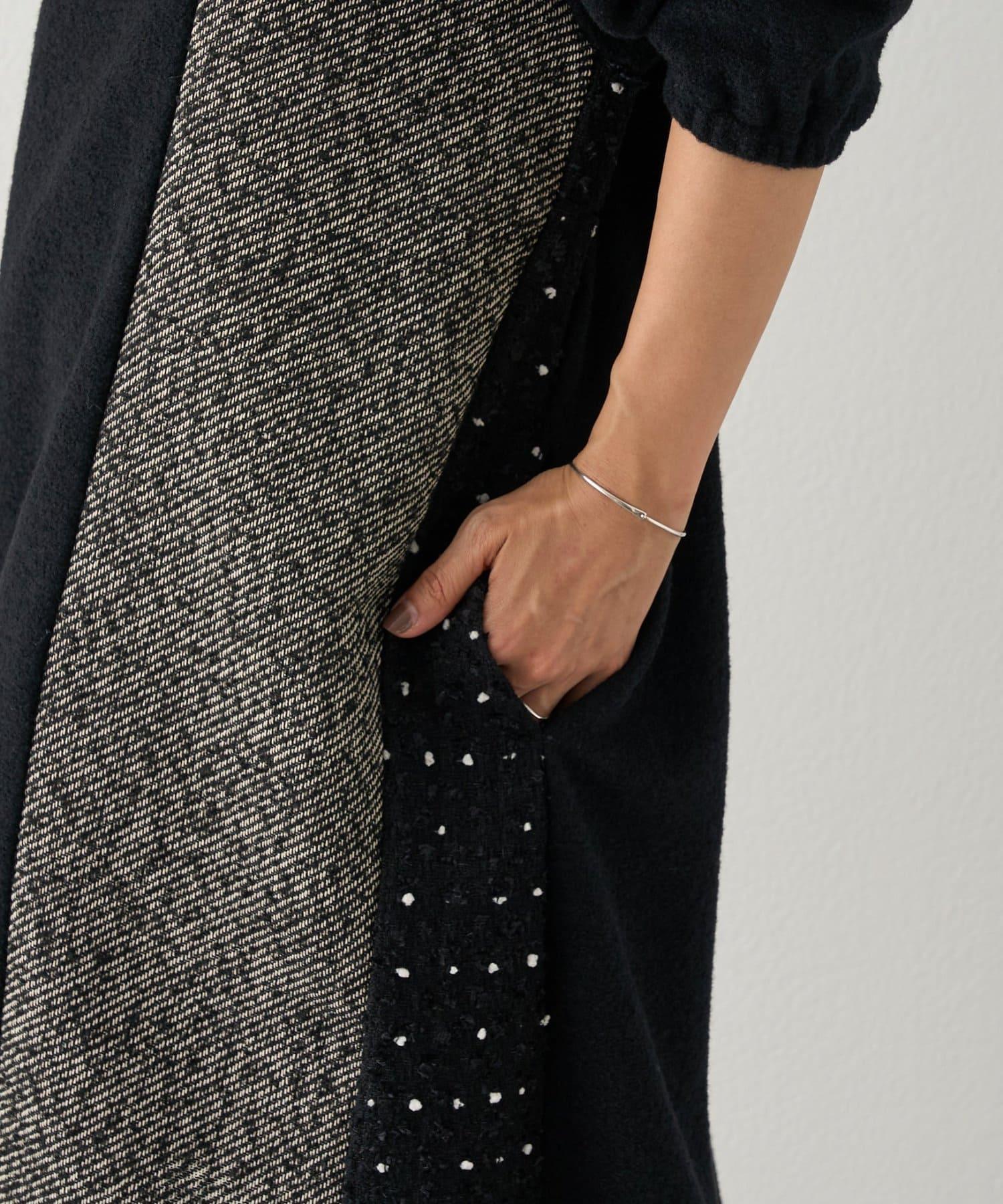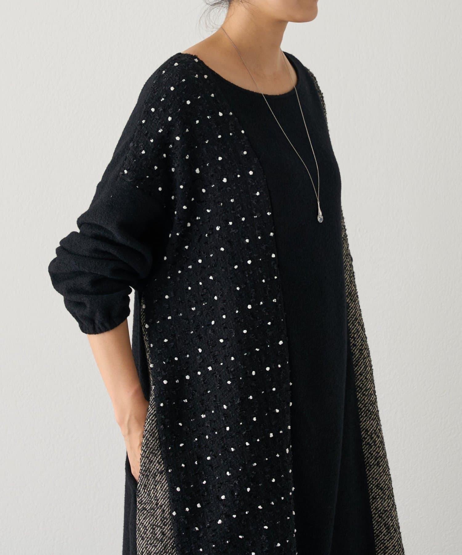 優雅的卡露絲編織和點狀斜紋軟呢面料以及微妙的圖案切換是這款連衣裙的亮點。