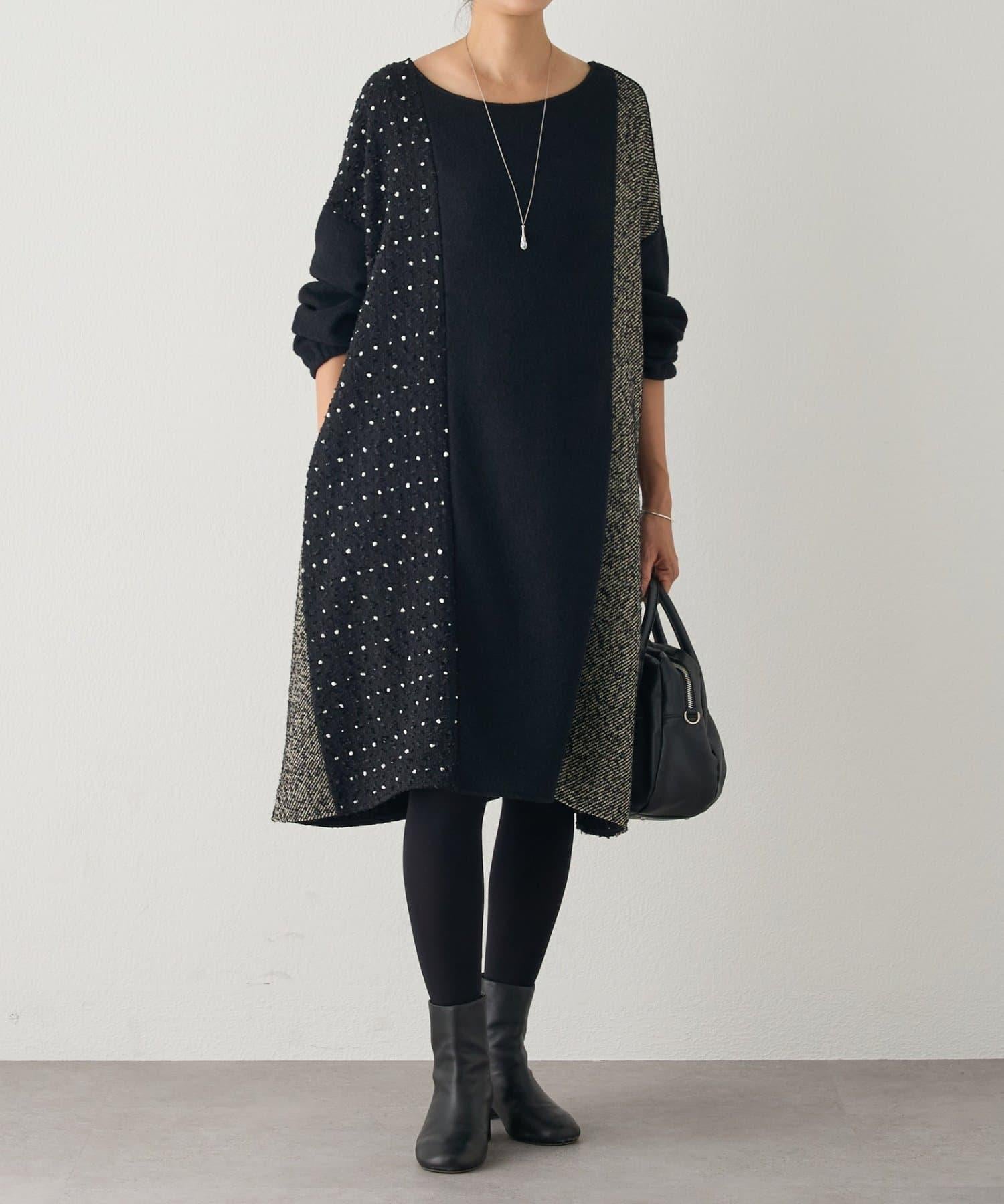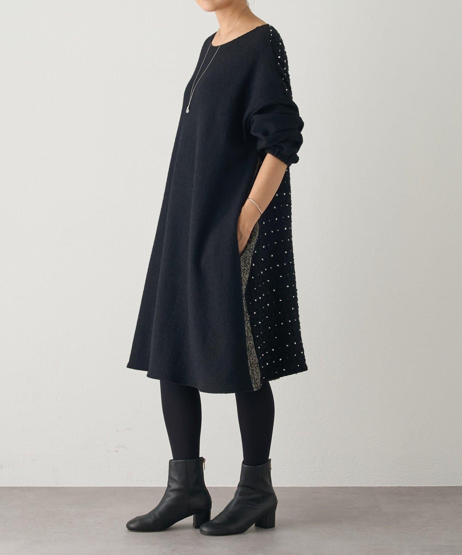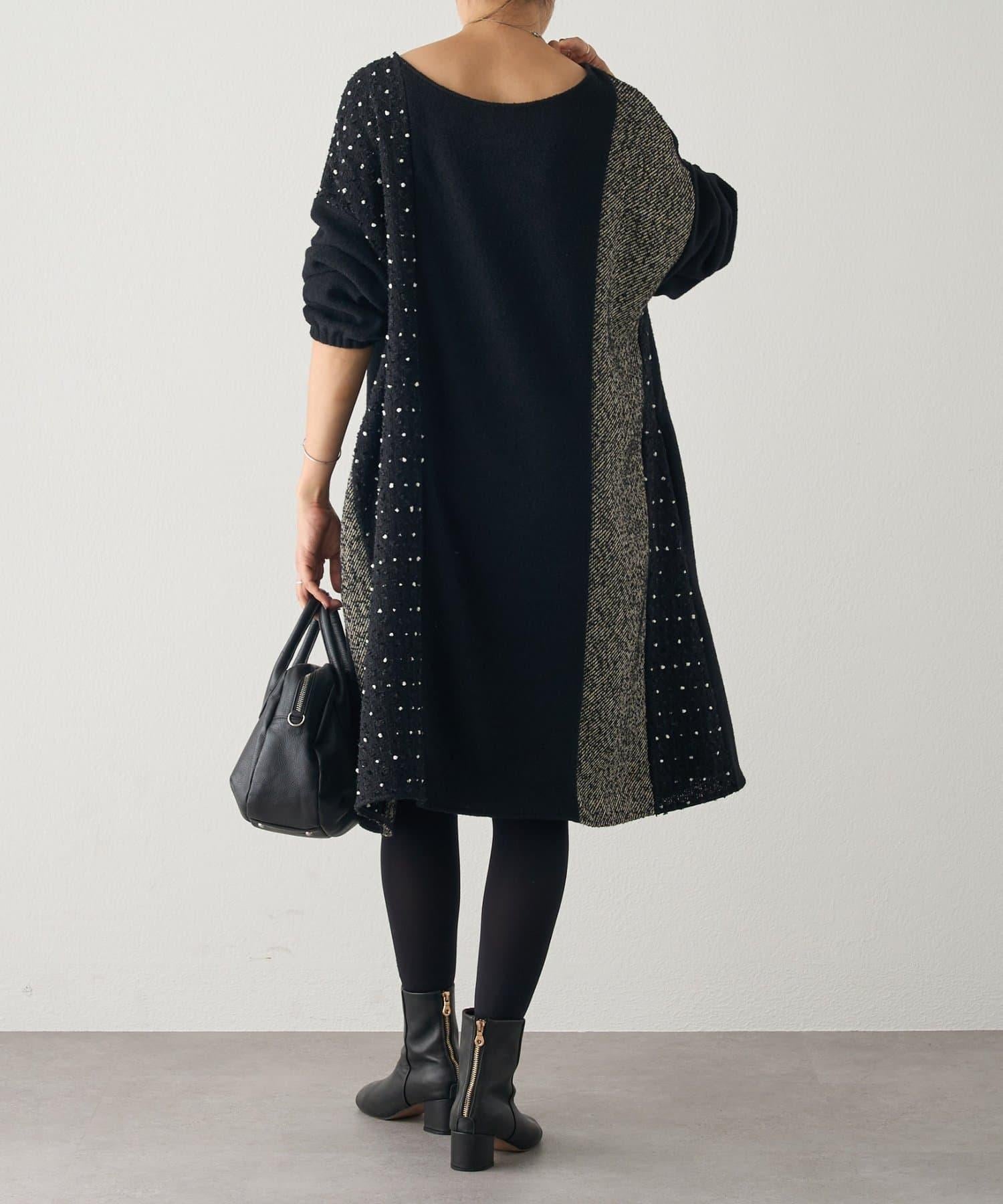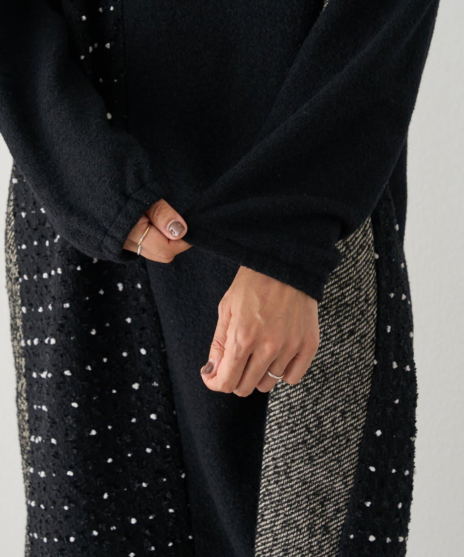 優雅的卡露絲編織和點狀斜紋軟呢面料以及微妙的圖案切換是這款連衣裙的亮點。