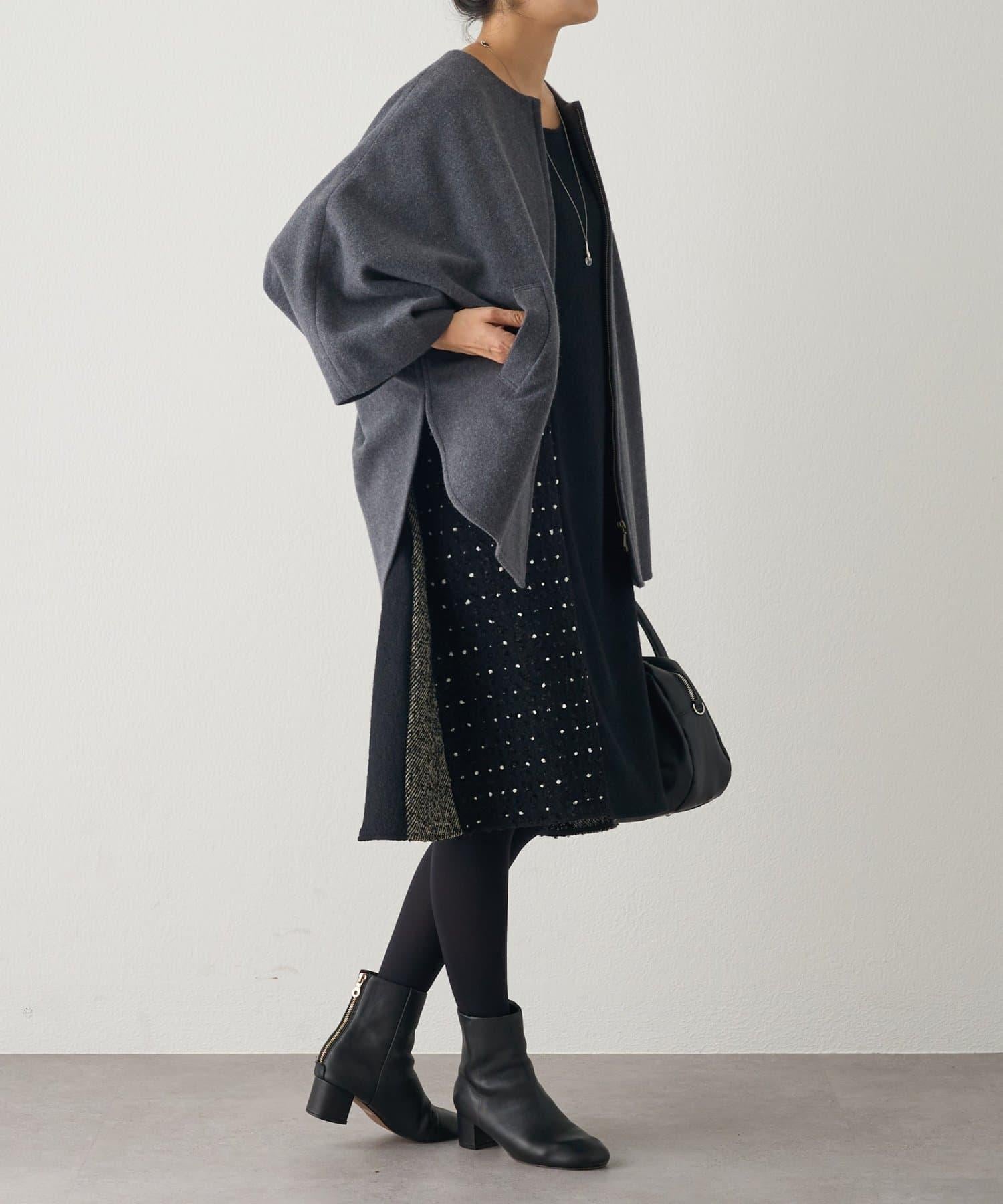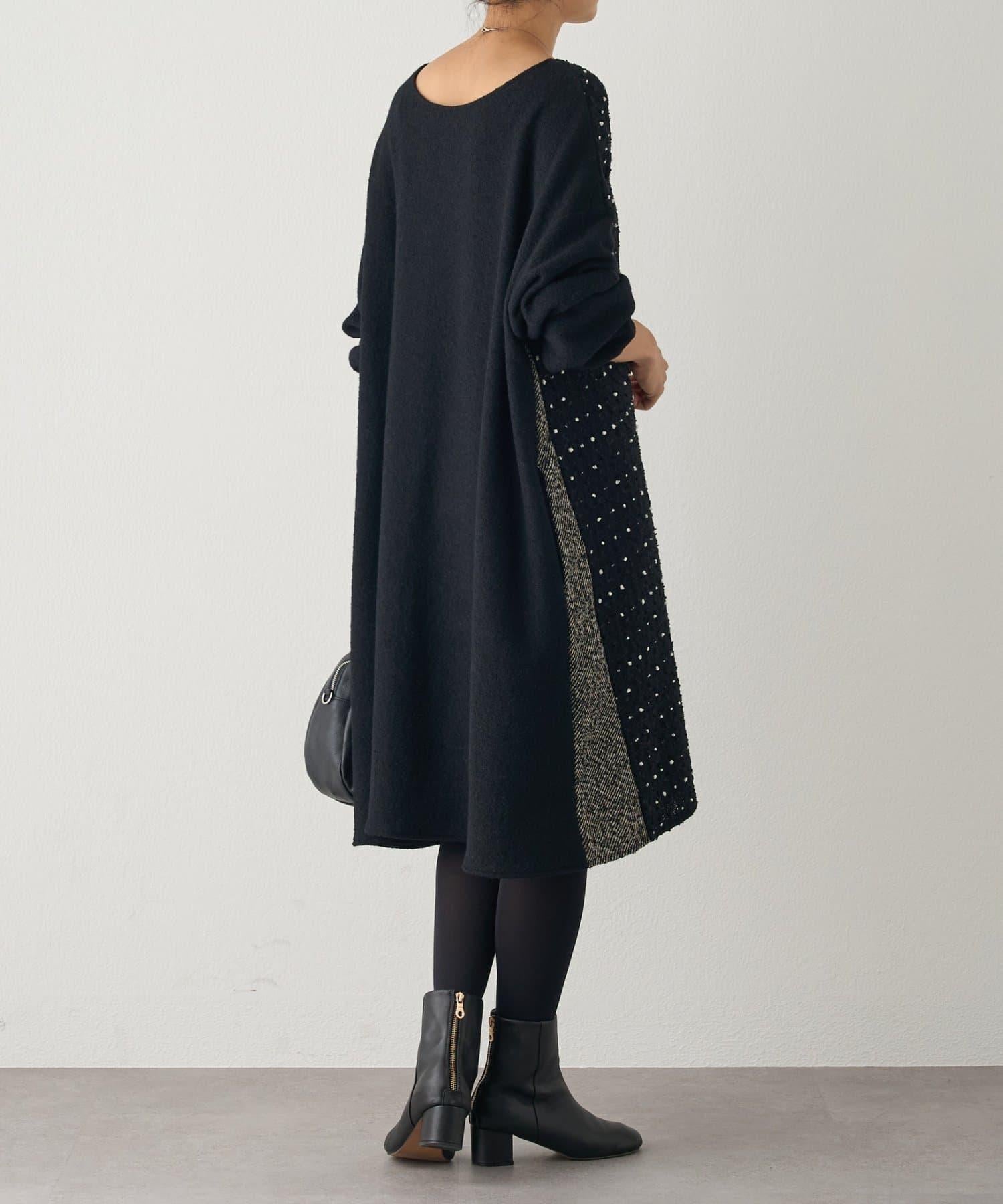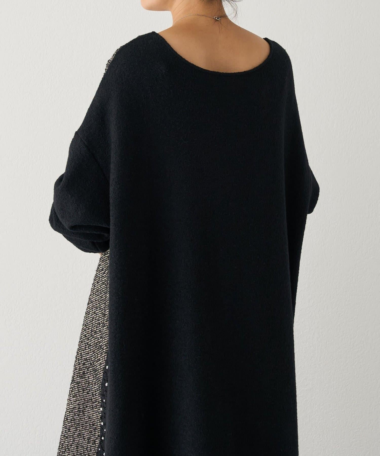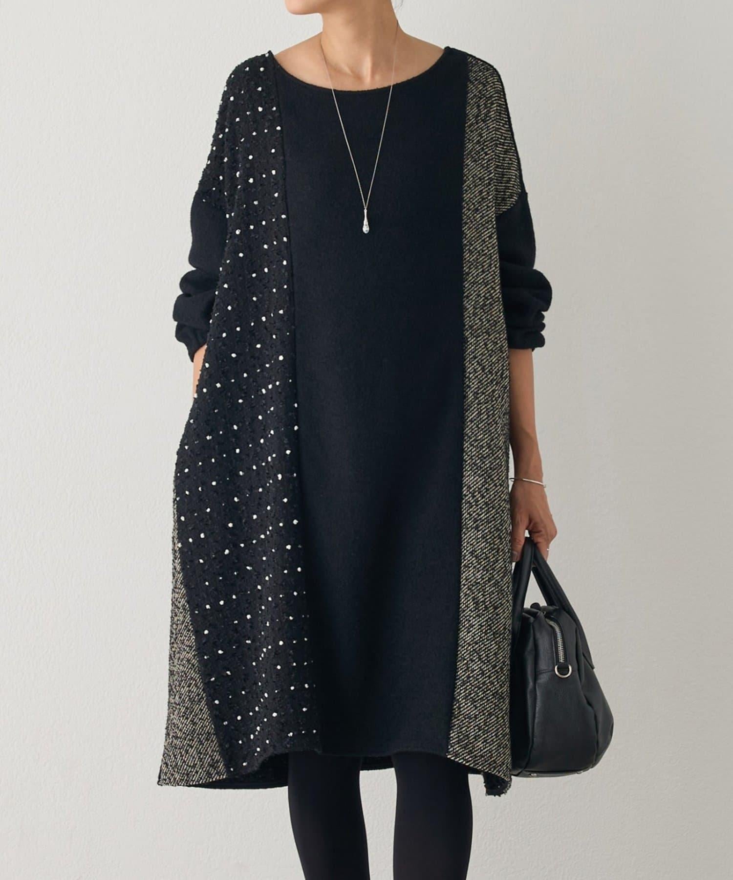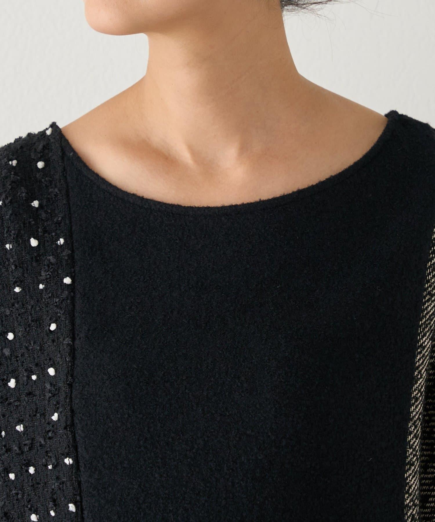 優雅的卡露絲編織和點狀斜紋軟呢面料以及微妙的圖案切換是這款連衣裙的亮點。