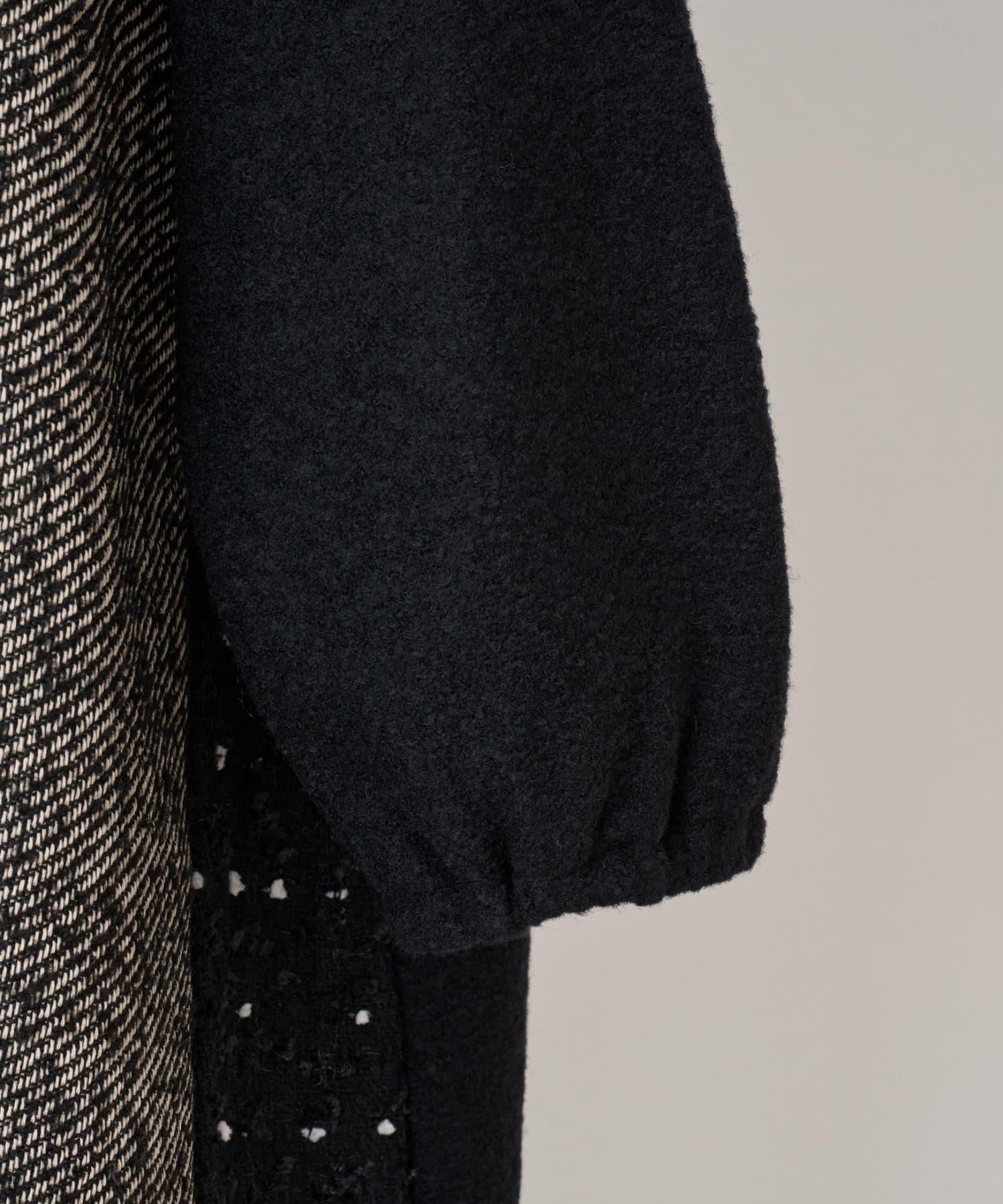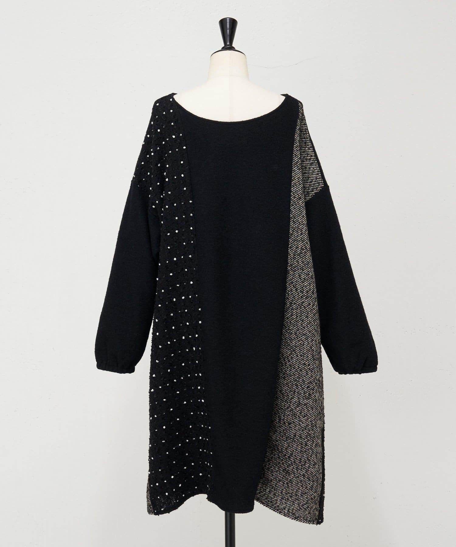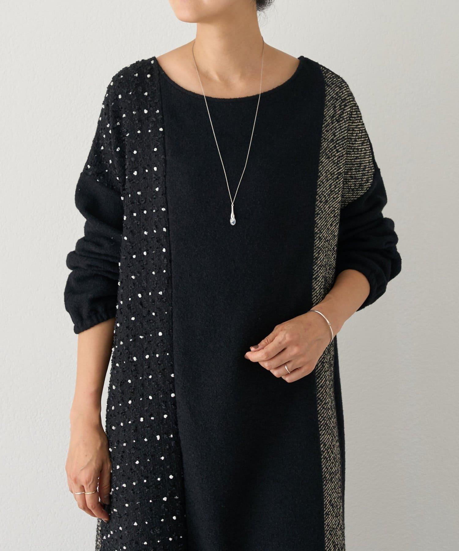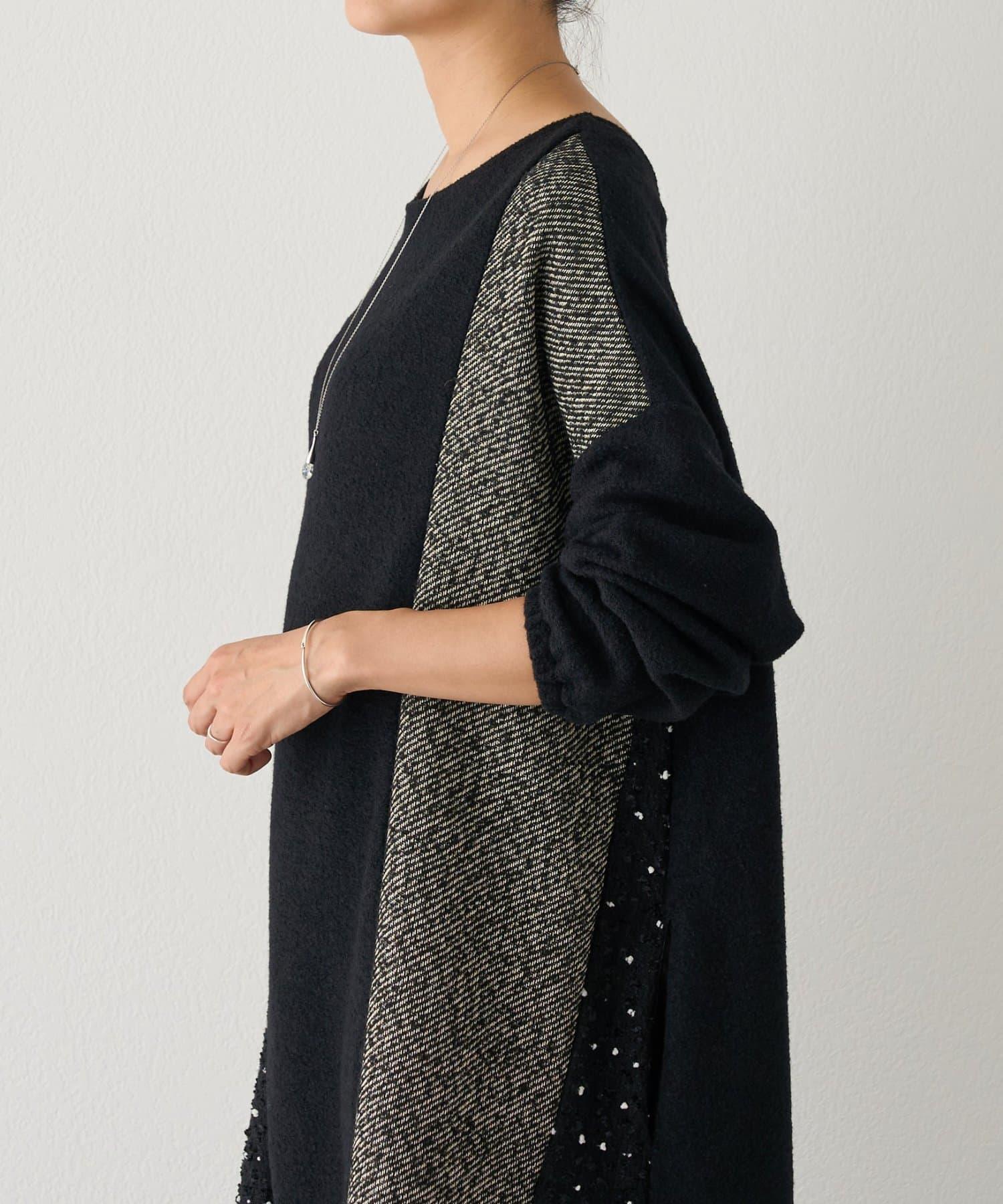 優雅的卡露絲編織和點狀斜紋軟呢面料以及微妙的圖案切換是這款連衣裙的亮點。