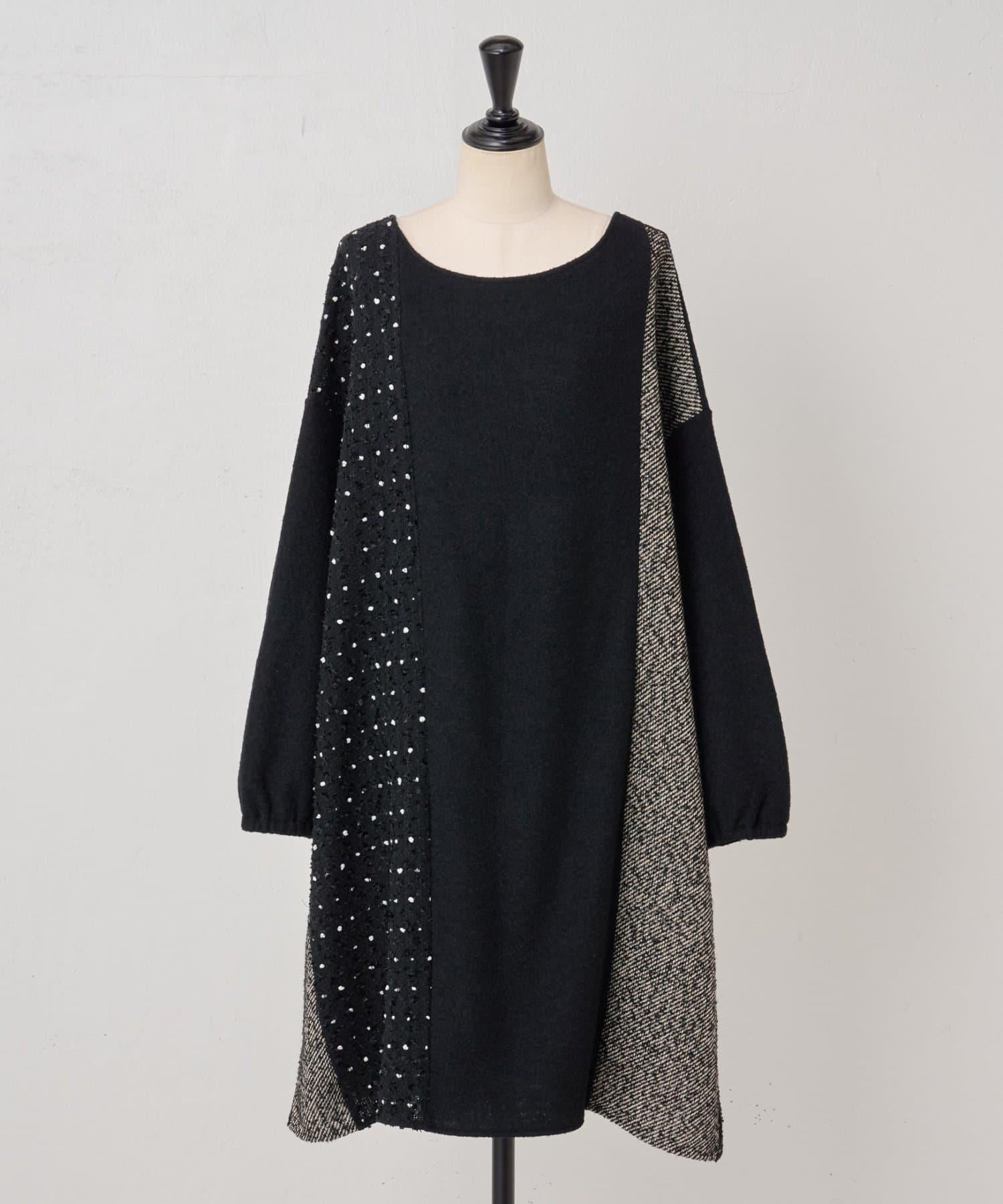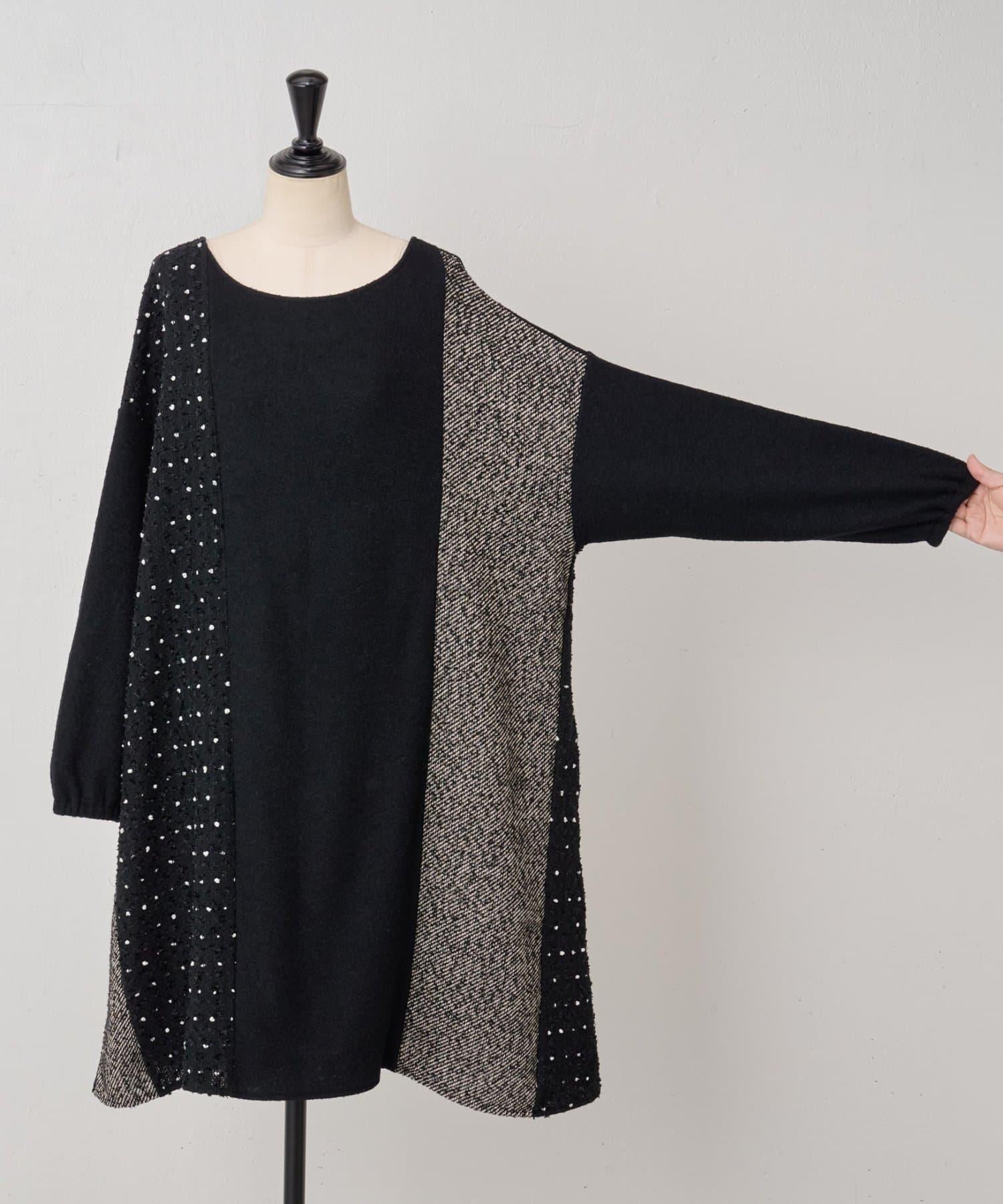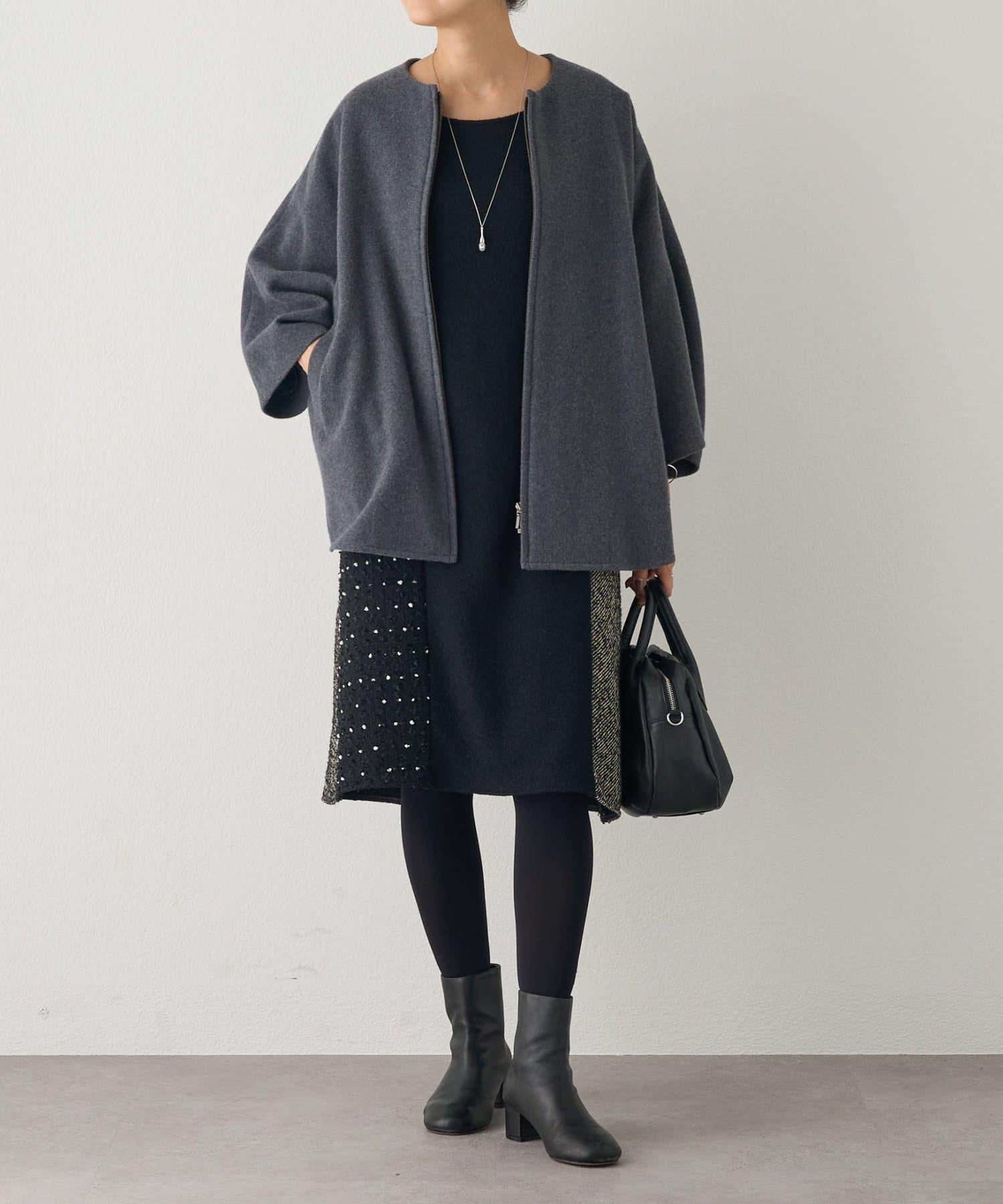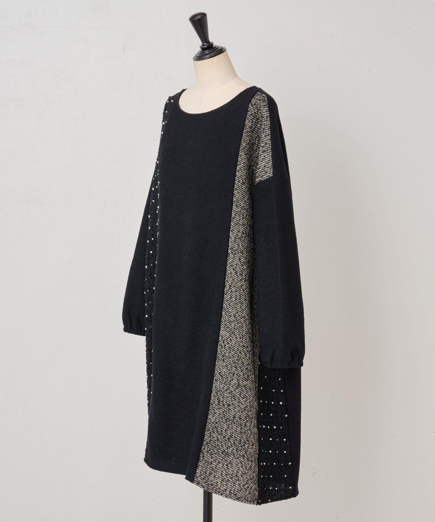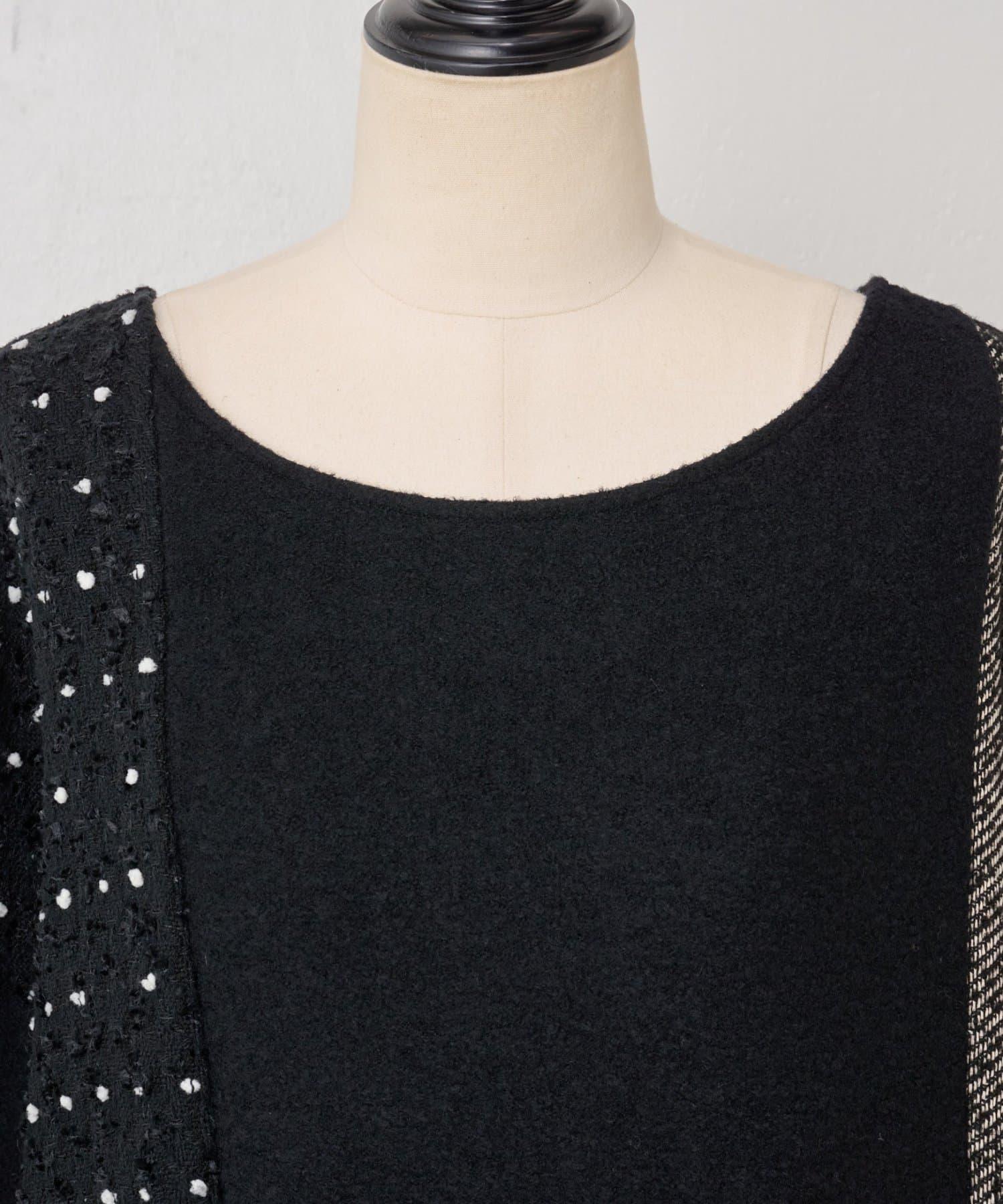 優雅的卡露絲編織和點狀斜紋軟呢面料以及微妙的圖案切換是這款連衣裙的亮點。