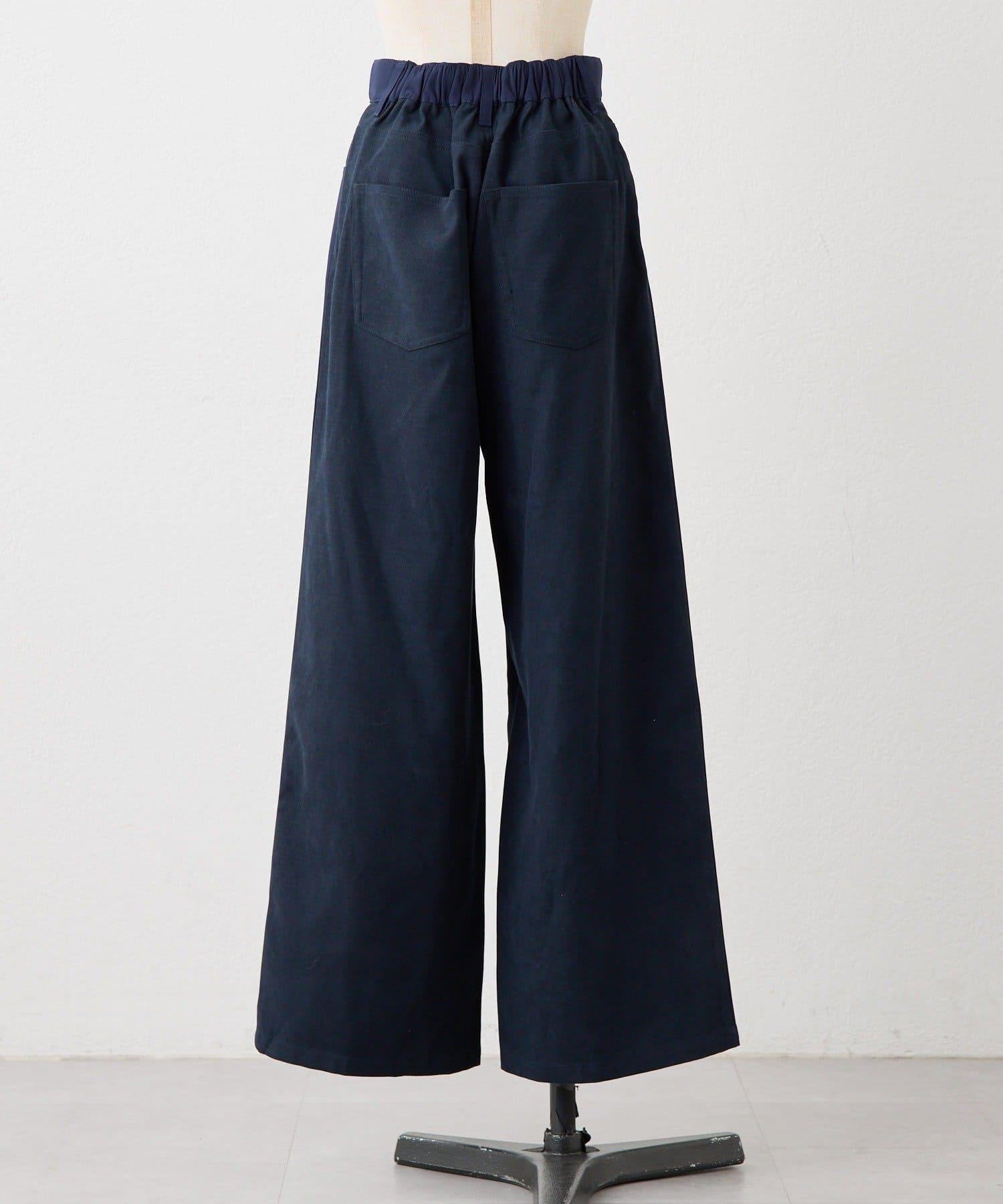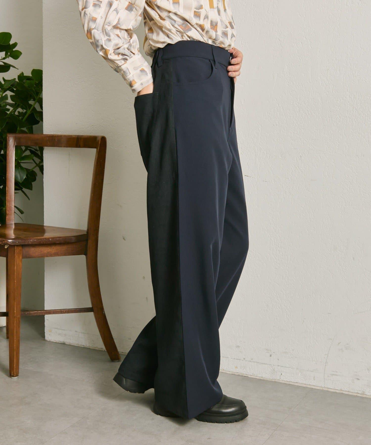 前後不同材質的設計長褲。