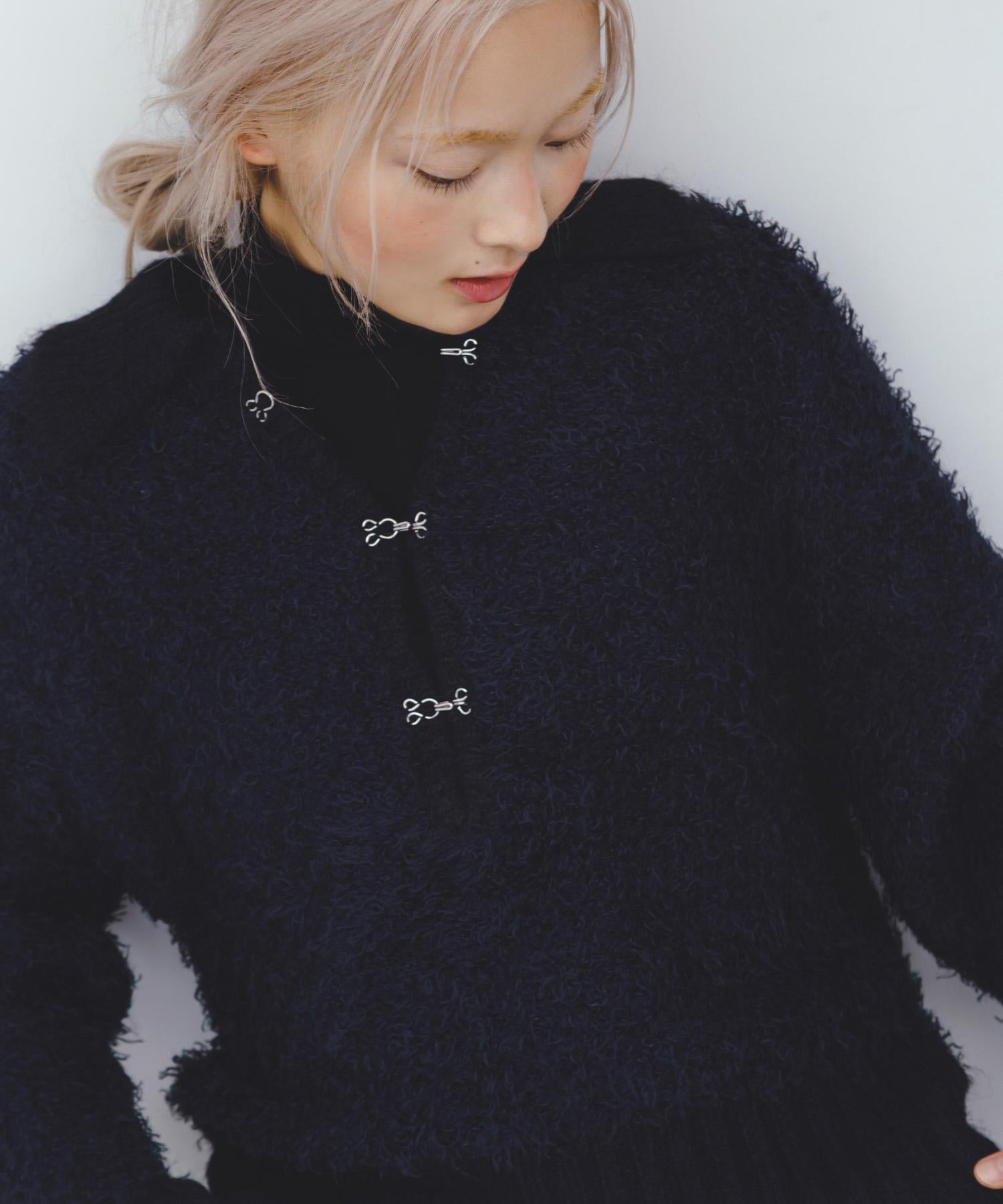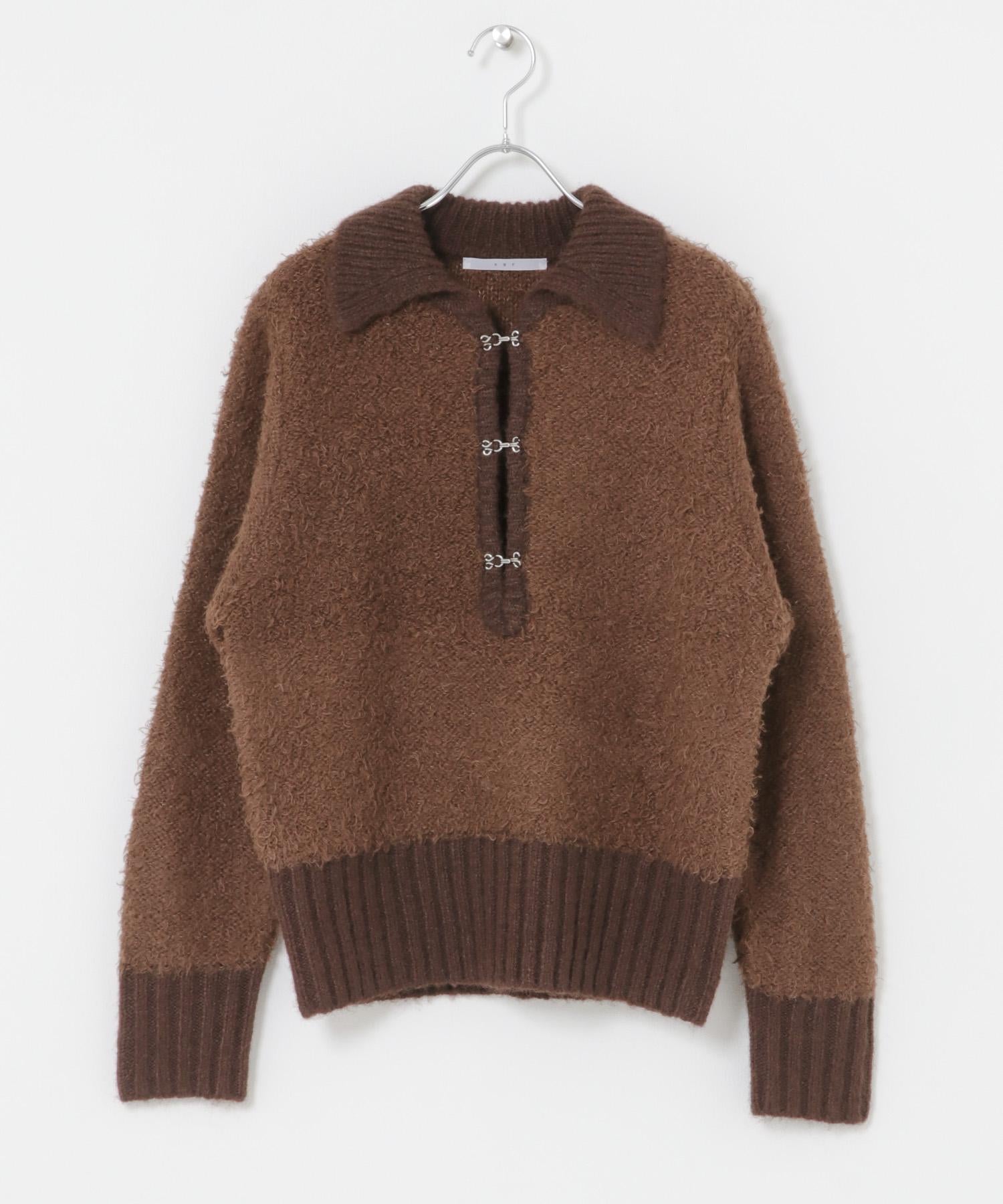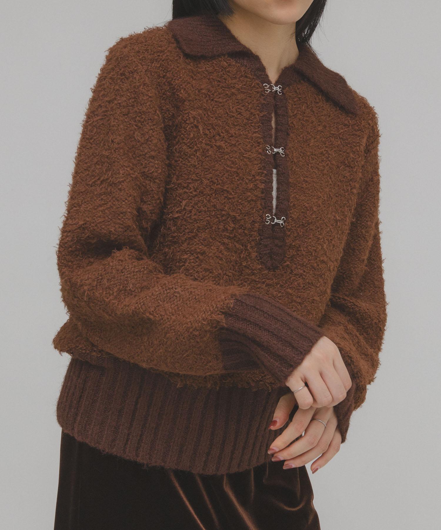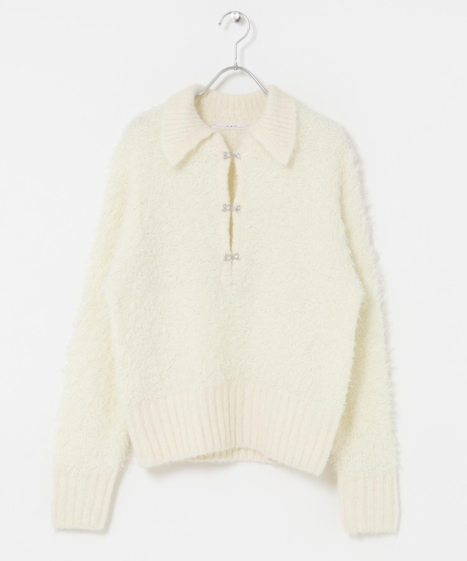 這款針織衫採用了彎曲的針織面料和前鉤裝飾。針織面料整體甜美,但 polo 形的設計增添了休閒感。將前鉤打開穿著時,頸部看起來乾淨利落,營造出一種寬鬆的感覺。稍短的長度採用羅紋設計,在腰部繫緊,營造出自然圓潤的輪廓。