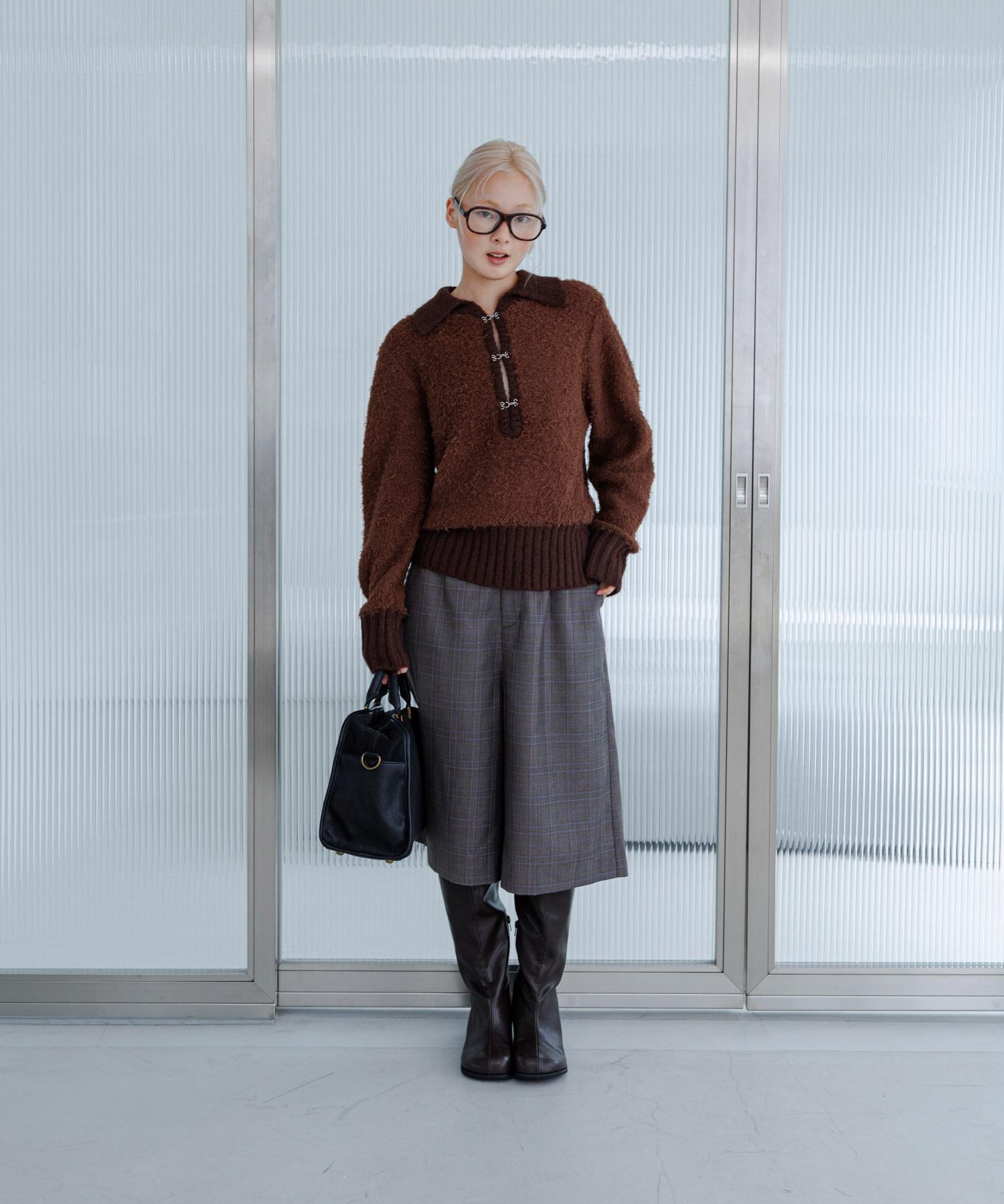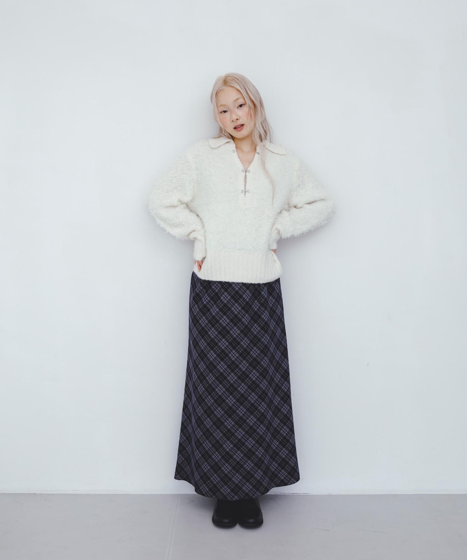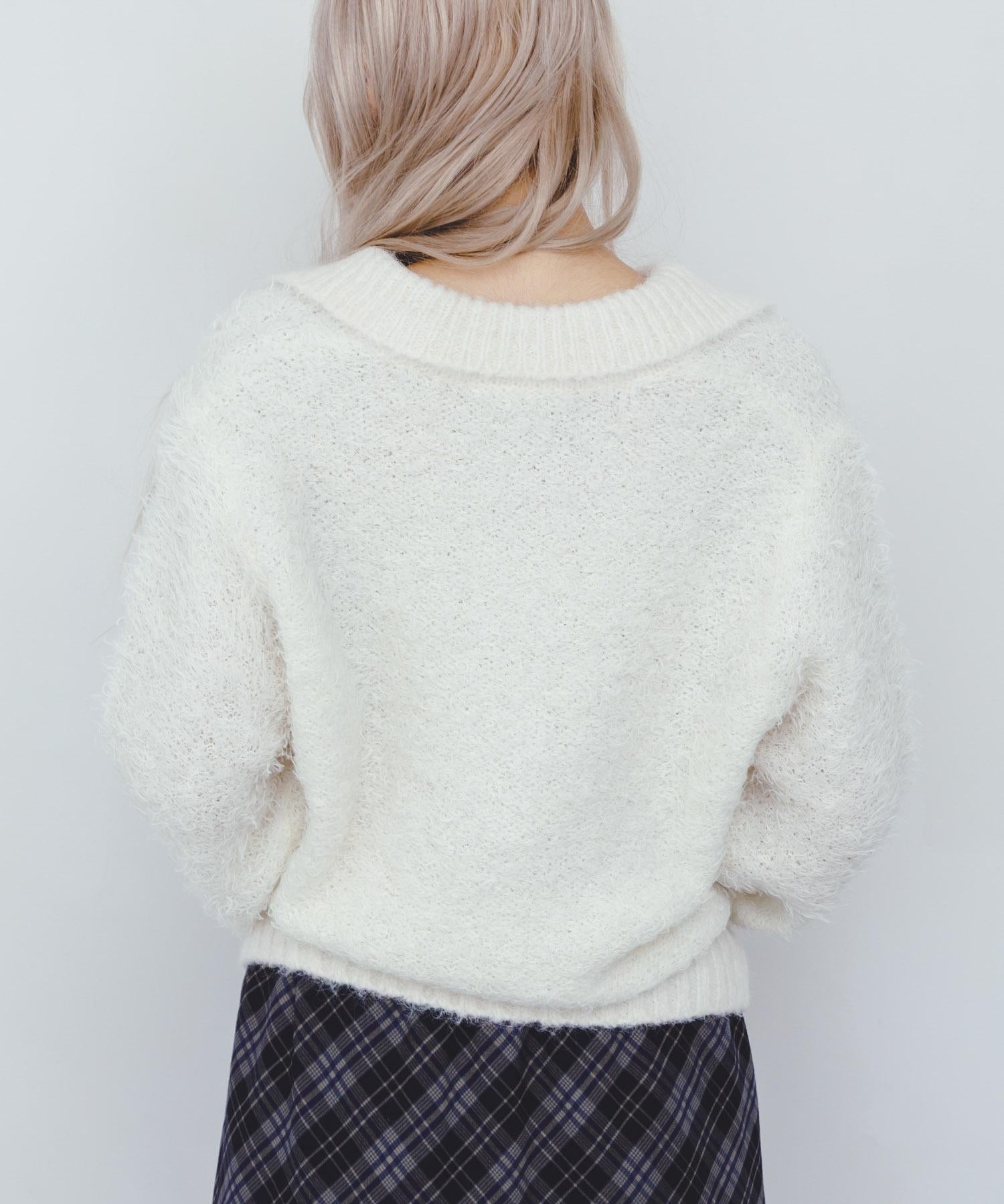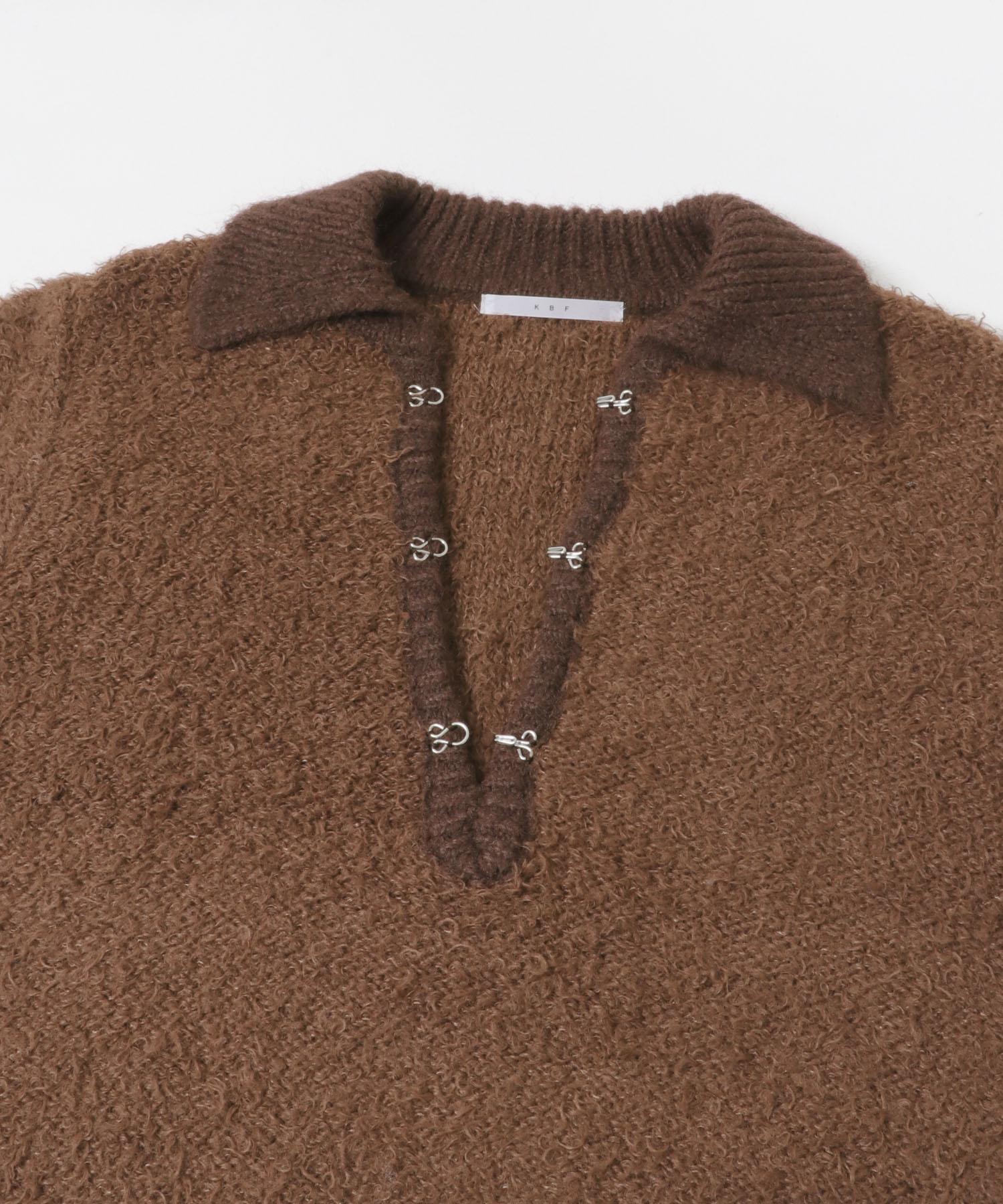 這款針織衫採用了彎曲的針織面料和前鉤裝飾。針織面料整體甜美,但 polo 形的設計增添了休閒感。將前鉤打開穿著時,頸部看起來乾淨利落,營造出一種寬鬆的感覺。稍短的長度採用羅紋設計,在腰部繫緊,營造出自然圓潤的輪廓。