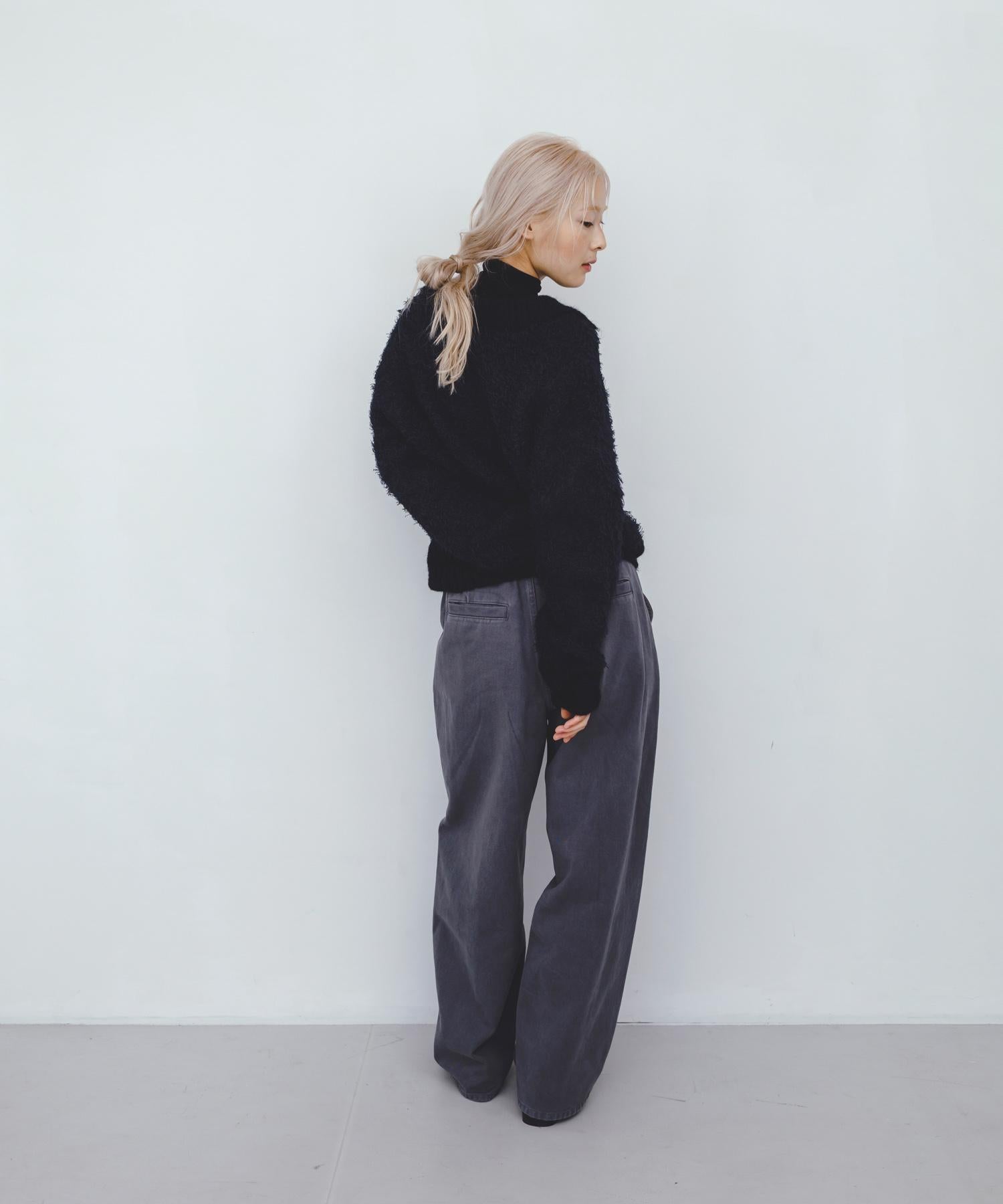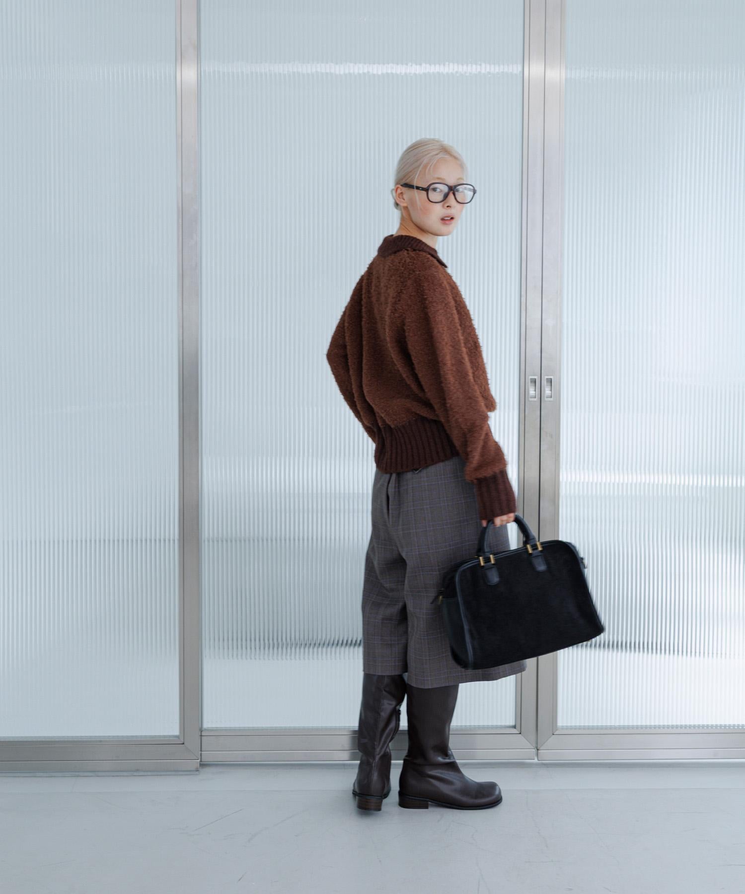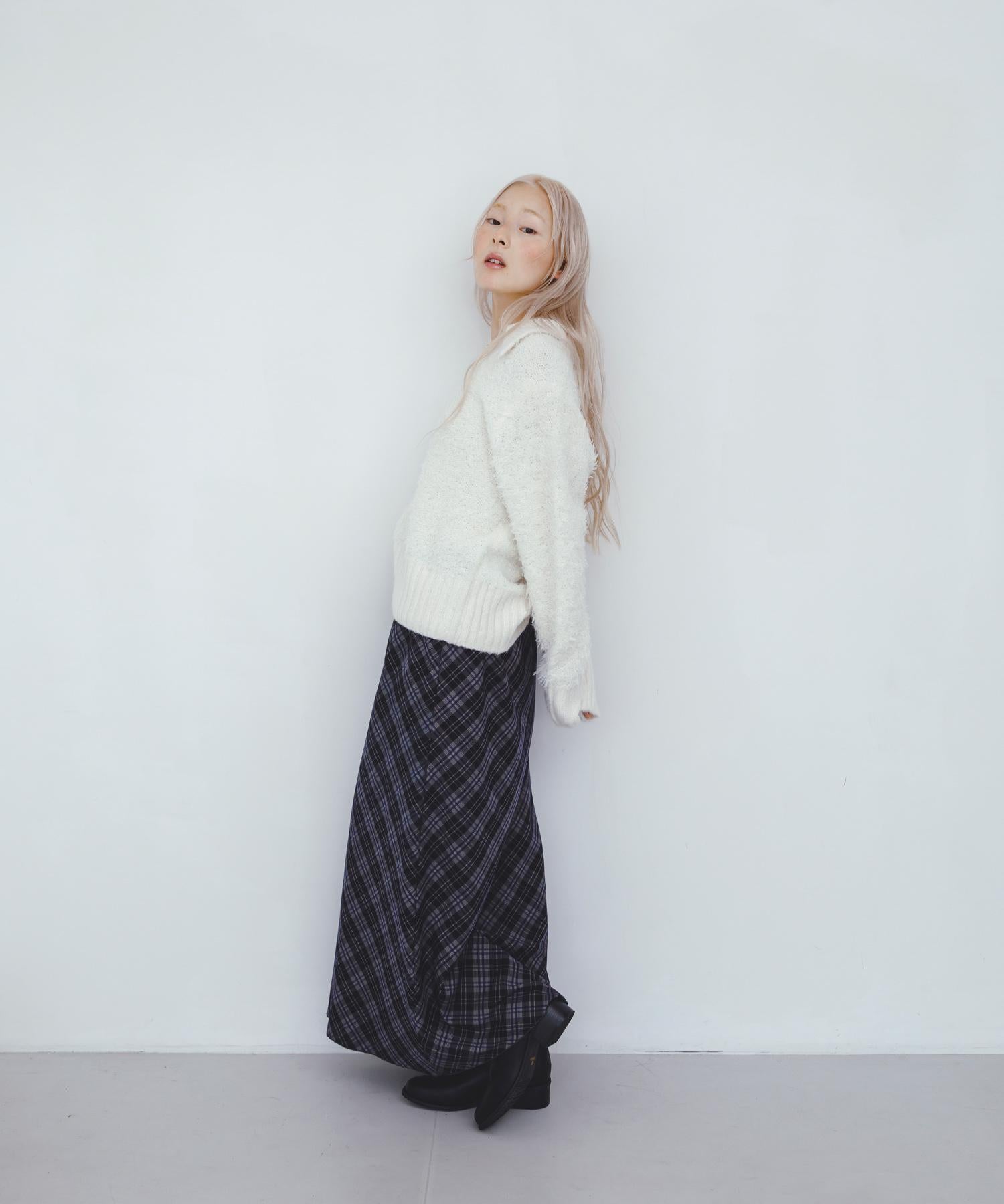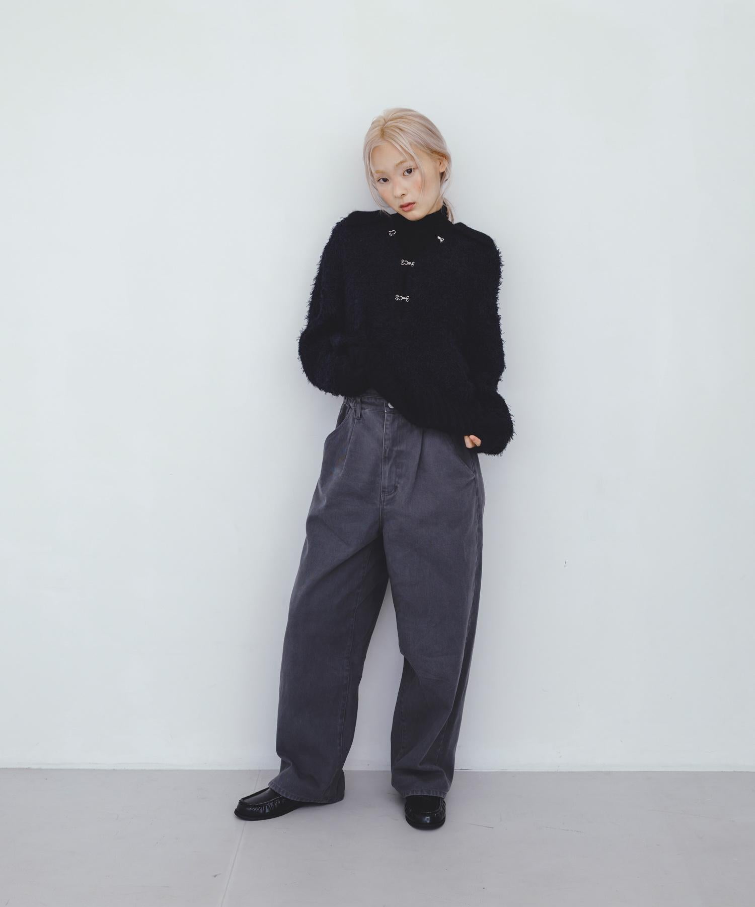 這款針織衫採用了彎曲的針織面料和前鉤裝飾。針織面料整體甜美,但 polo 形的設計增添了休閒感。將前鉤打開穿著時,頸部看起來乾淨利落,營造出一種寬鬆的感覺。稍短的長度採用羅紋設計,在腰部繫緊,營造出自然圓潤的輪廓。