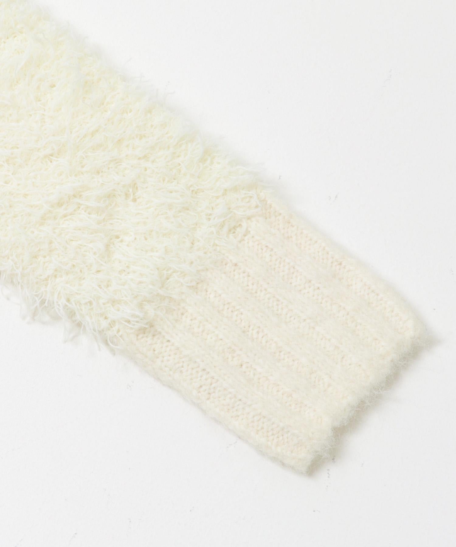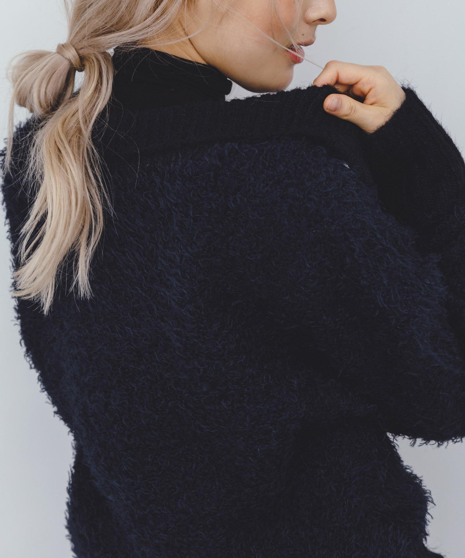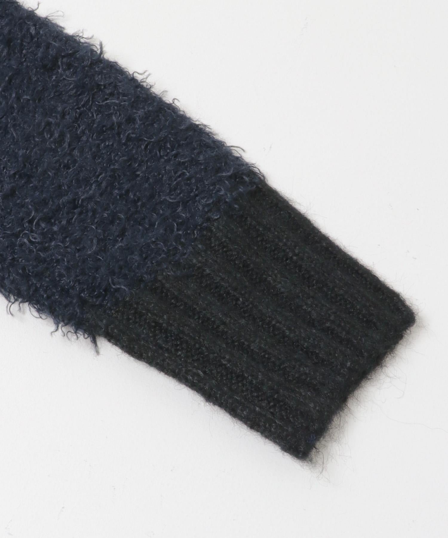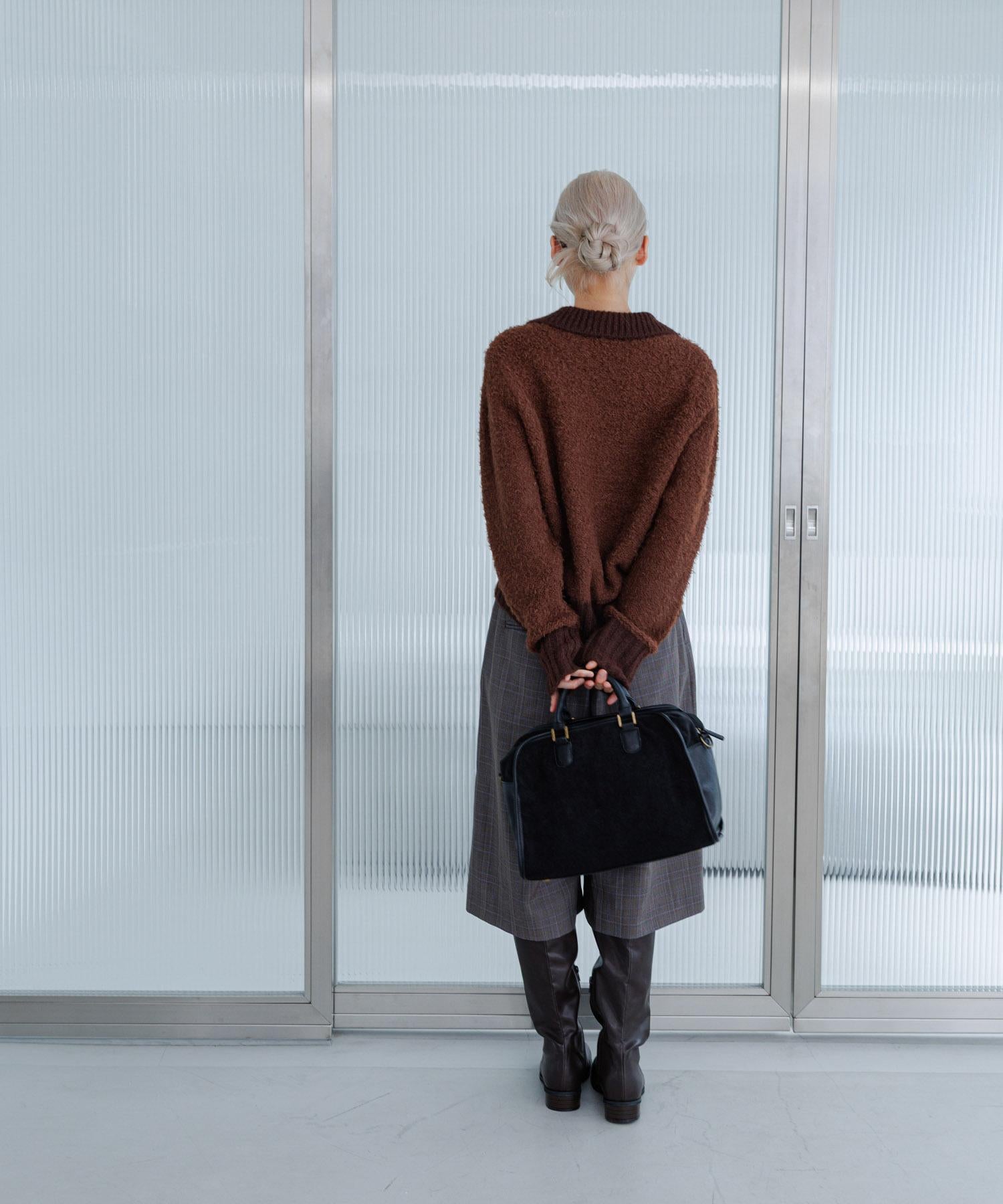這款針織衫採用了彎曲的針織面料和前鉤裝飾。針織面料整體甜美,但 polo 形的設計增添了休閒感。將前鉤打開穿著時,頸部看起來乾淨利落,營造出一種寬鬆的感覺。稍短的長度採用羅紋設計,在腰部繫緊,營造出自然圓潤的輪廓。