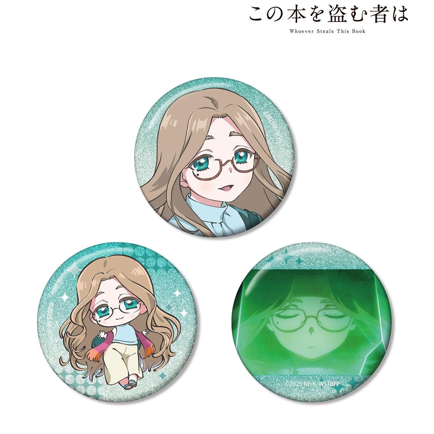 來自劇場版動畫《誰偷了這本書》的一套三枚閃光罐頭徽章。