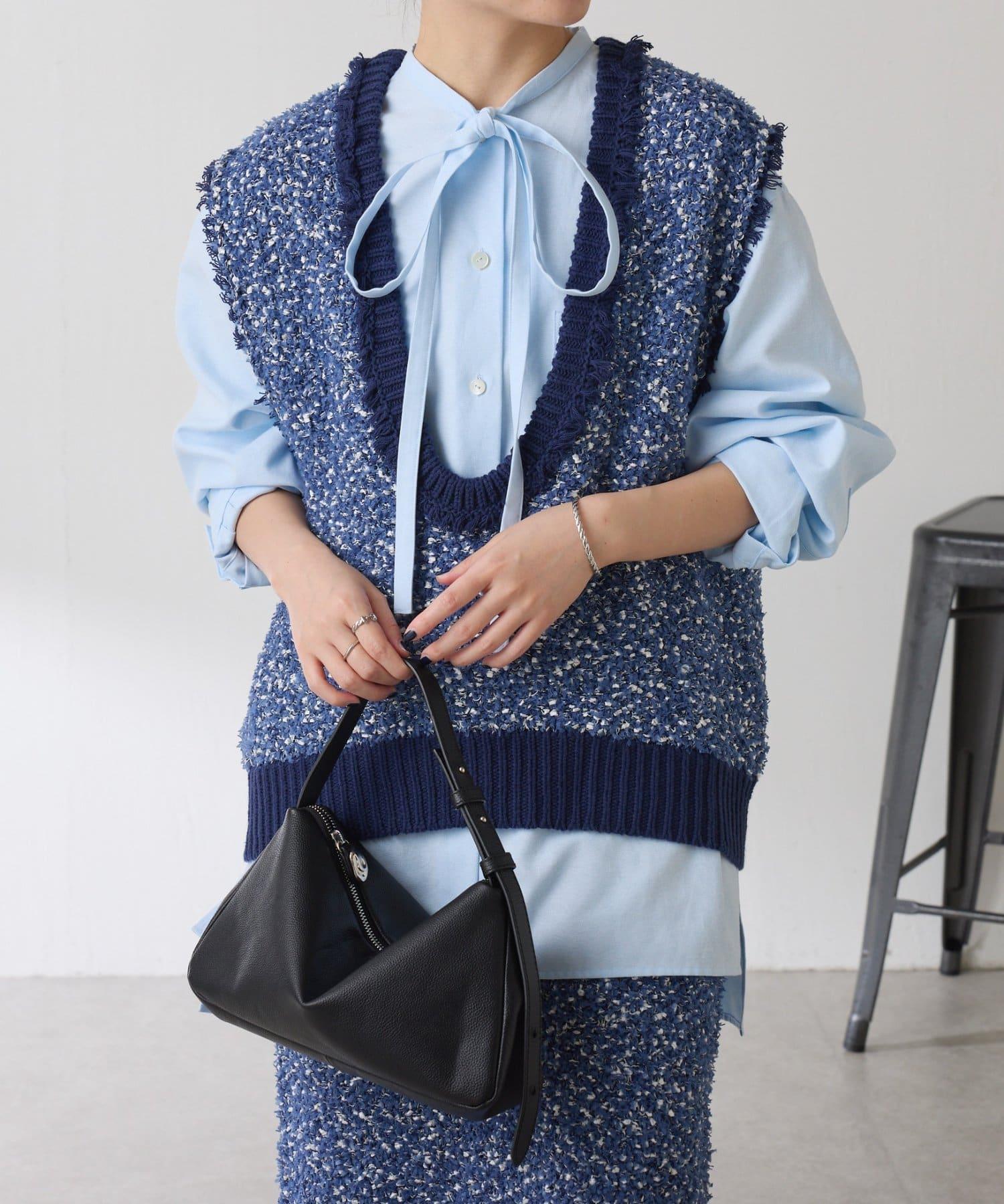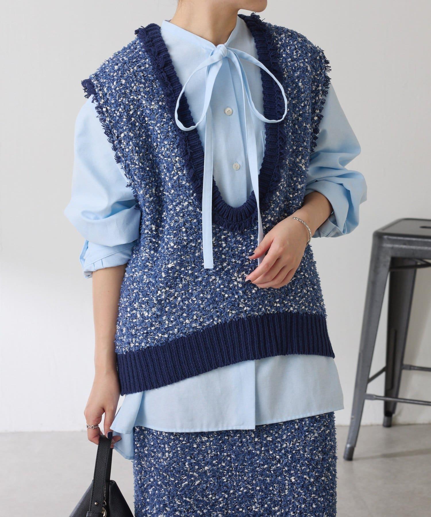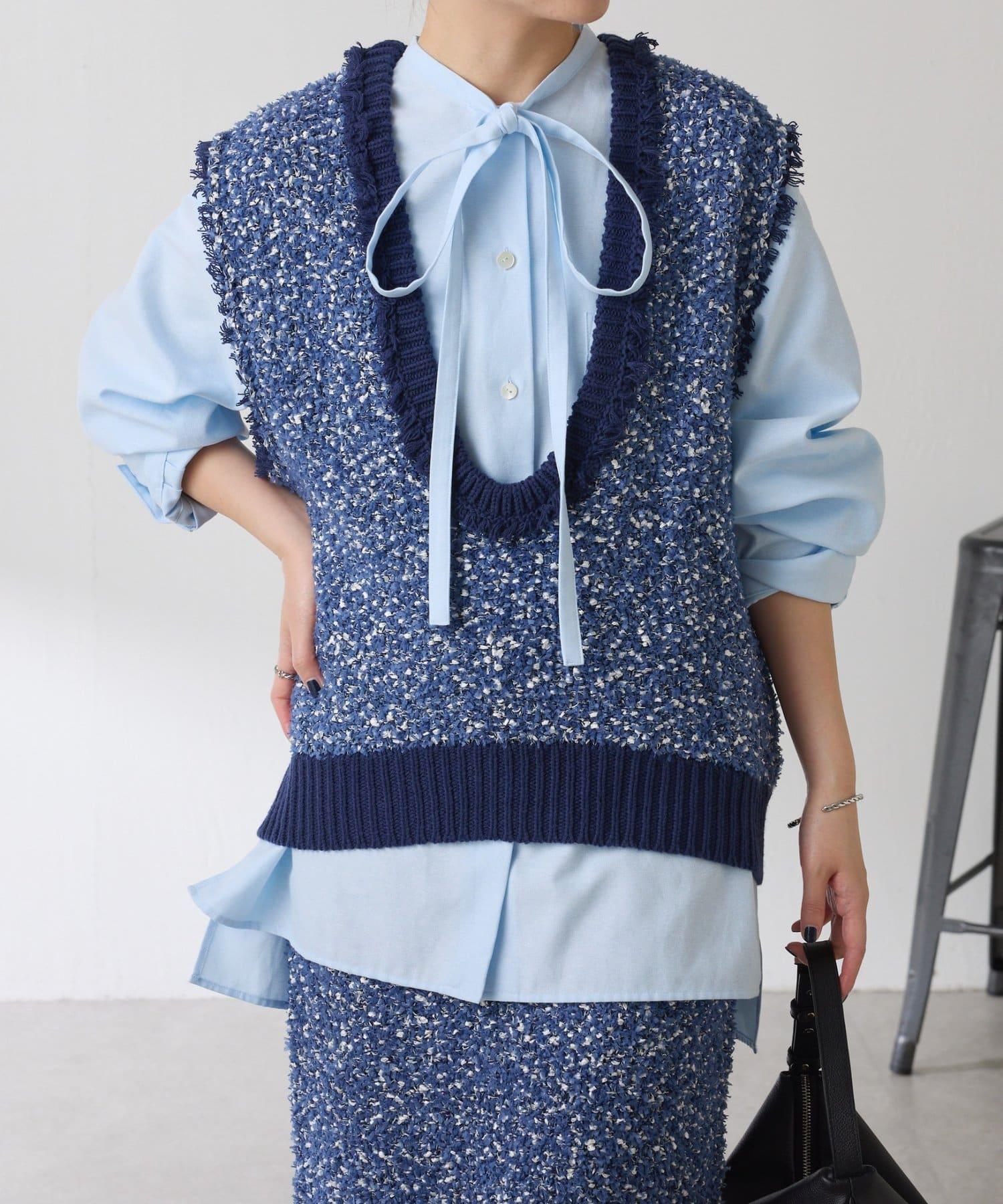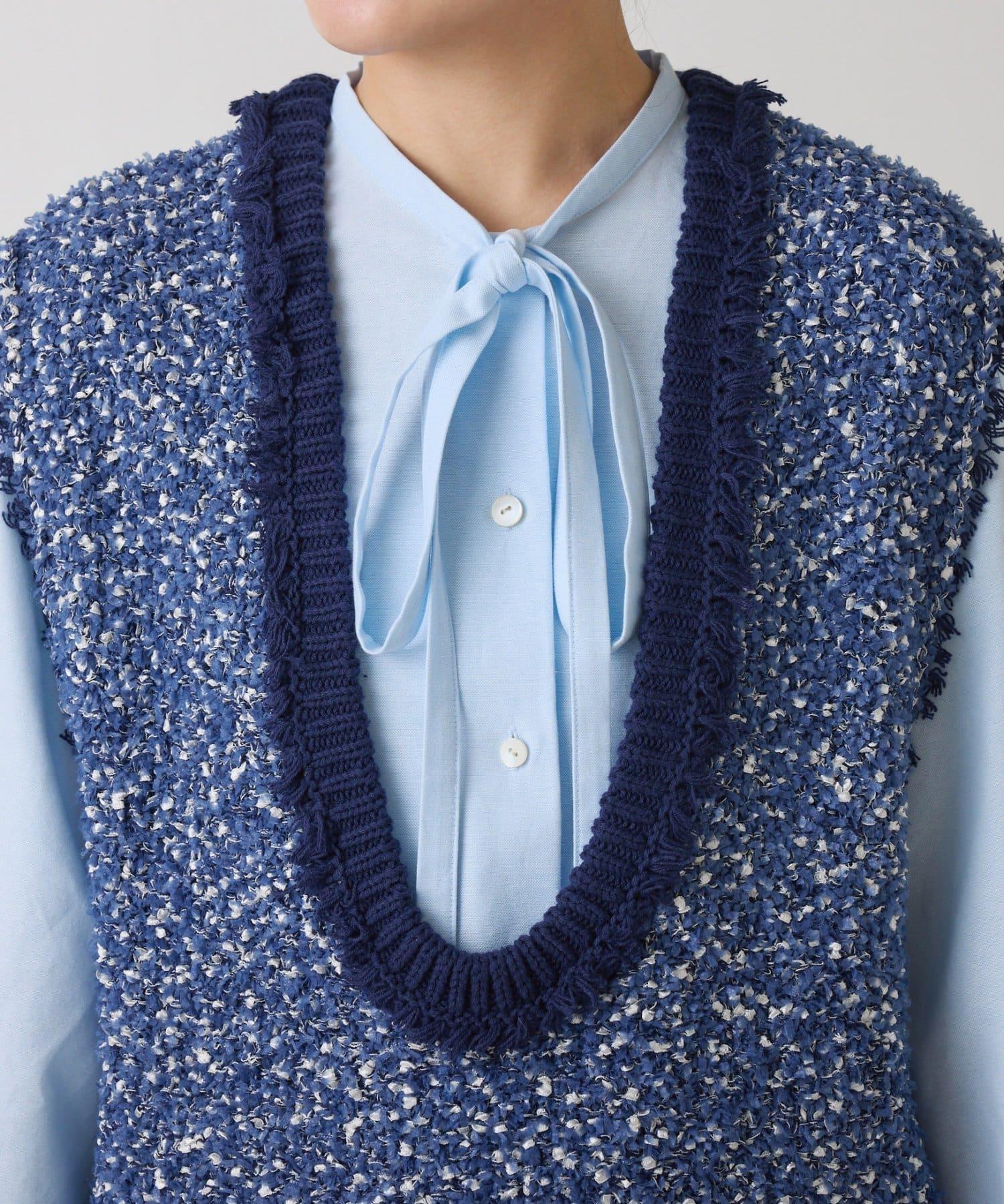 針織衫有一種寬鬆的感覺,領口為深 U 領。與蝴蝶結領結襯衫疊穿也很方便。