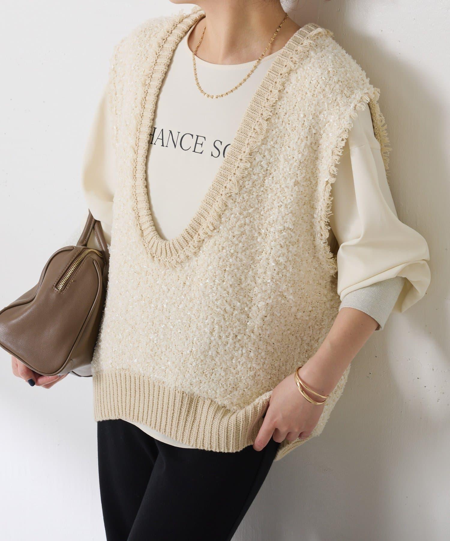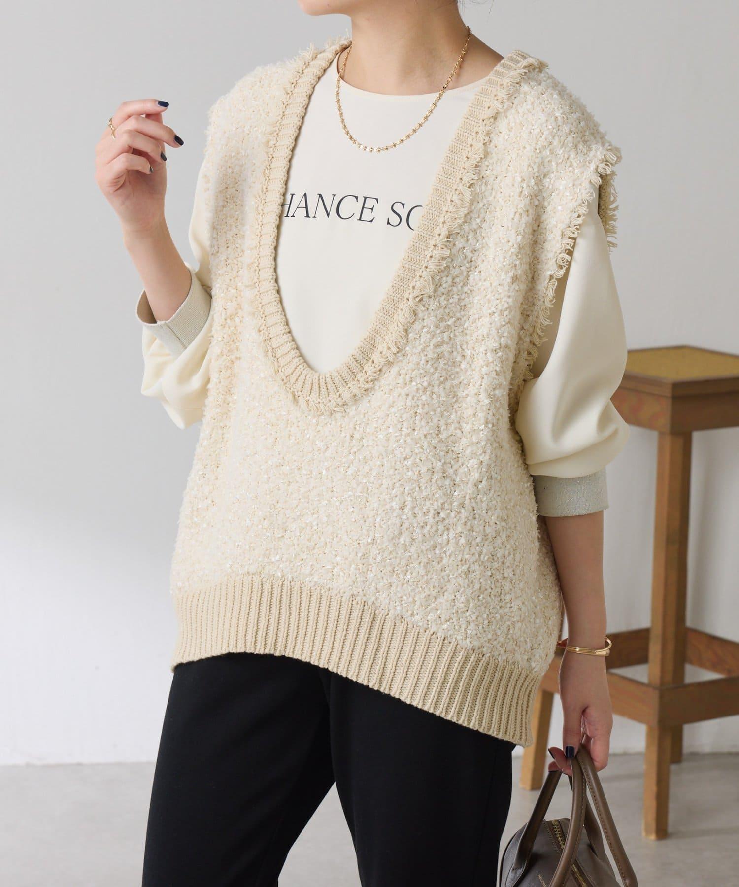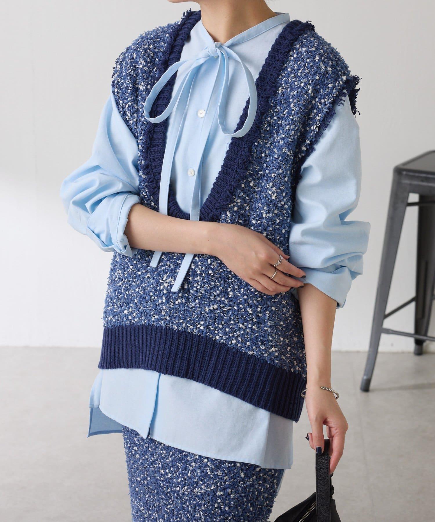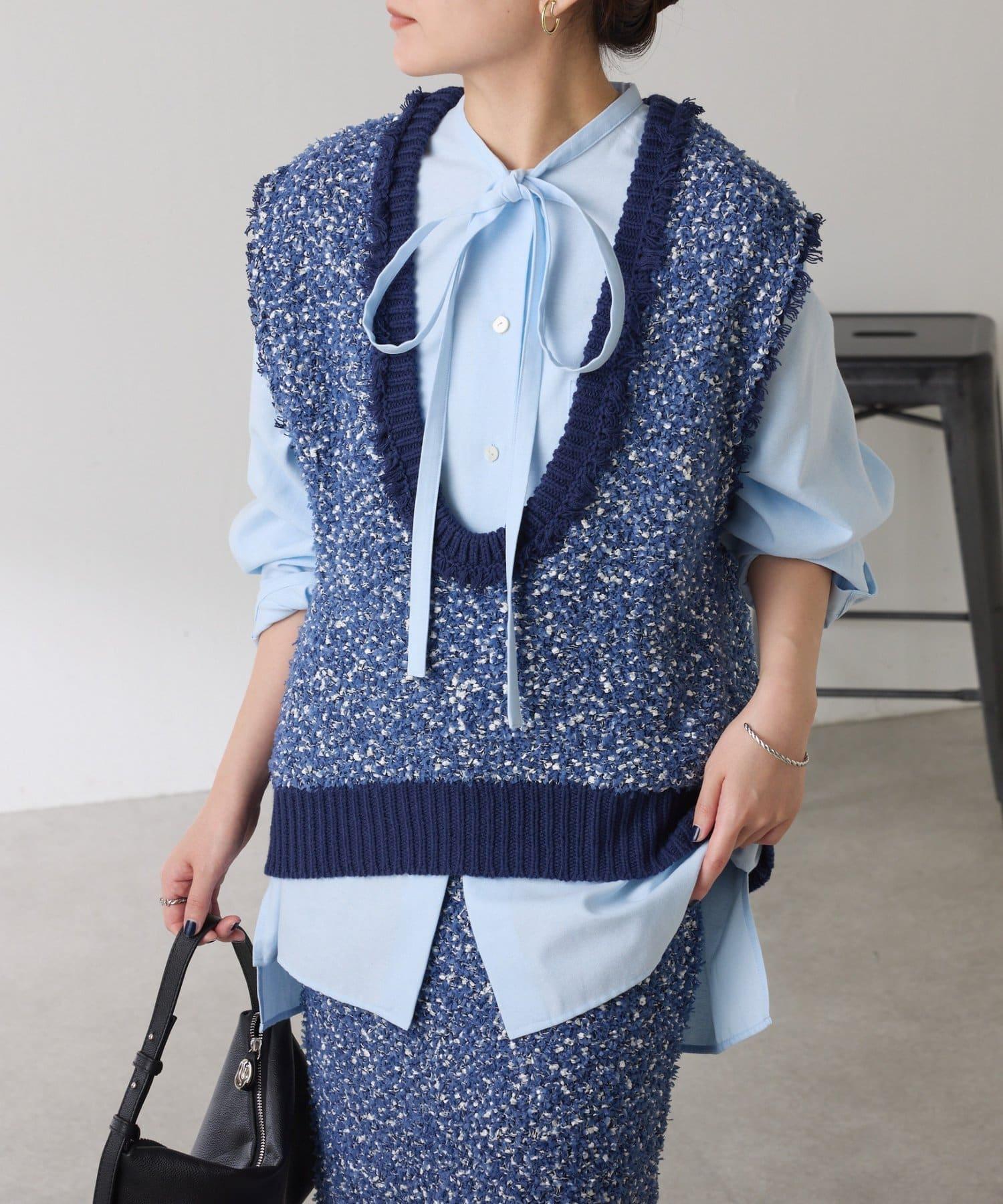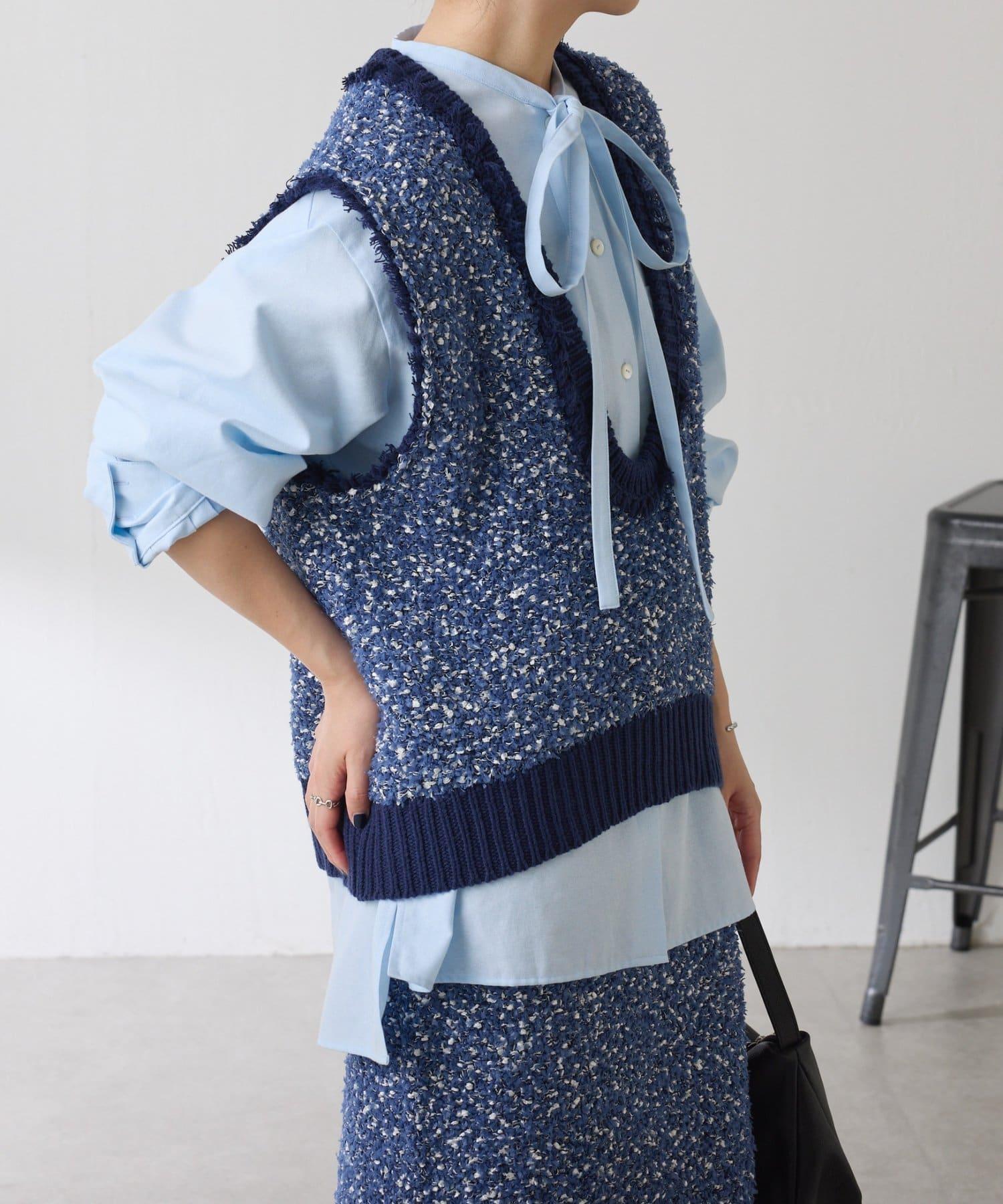 針織衫有一種寬鬆的感覺,領口為深 U 領。與蝴蝶結領結襯衫疊穿也很方便。