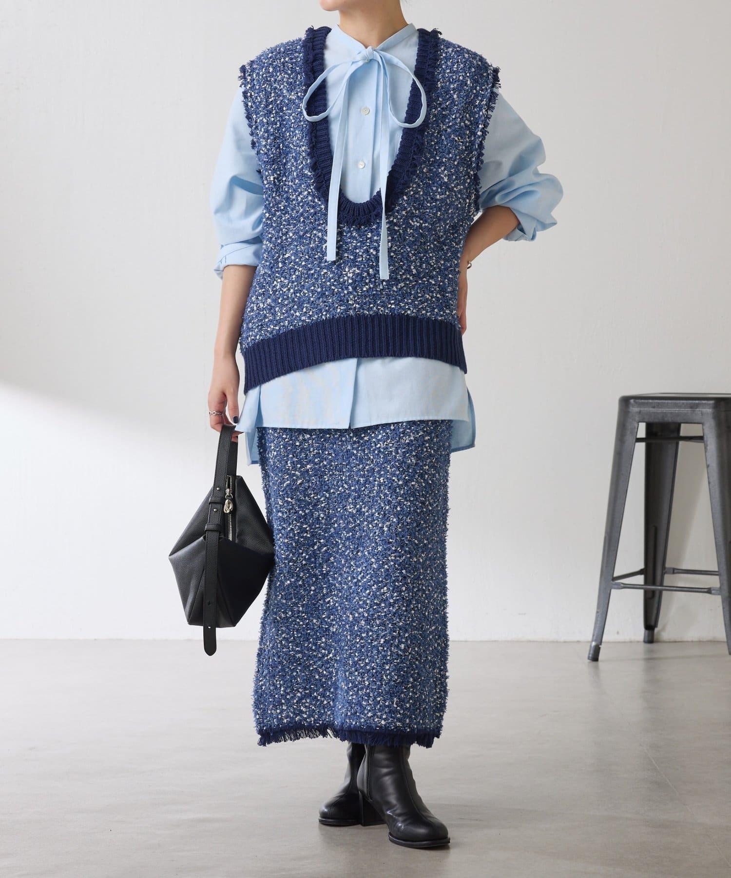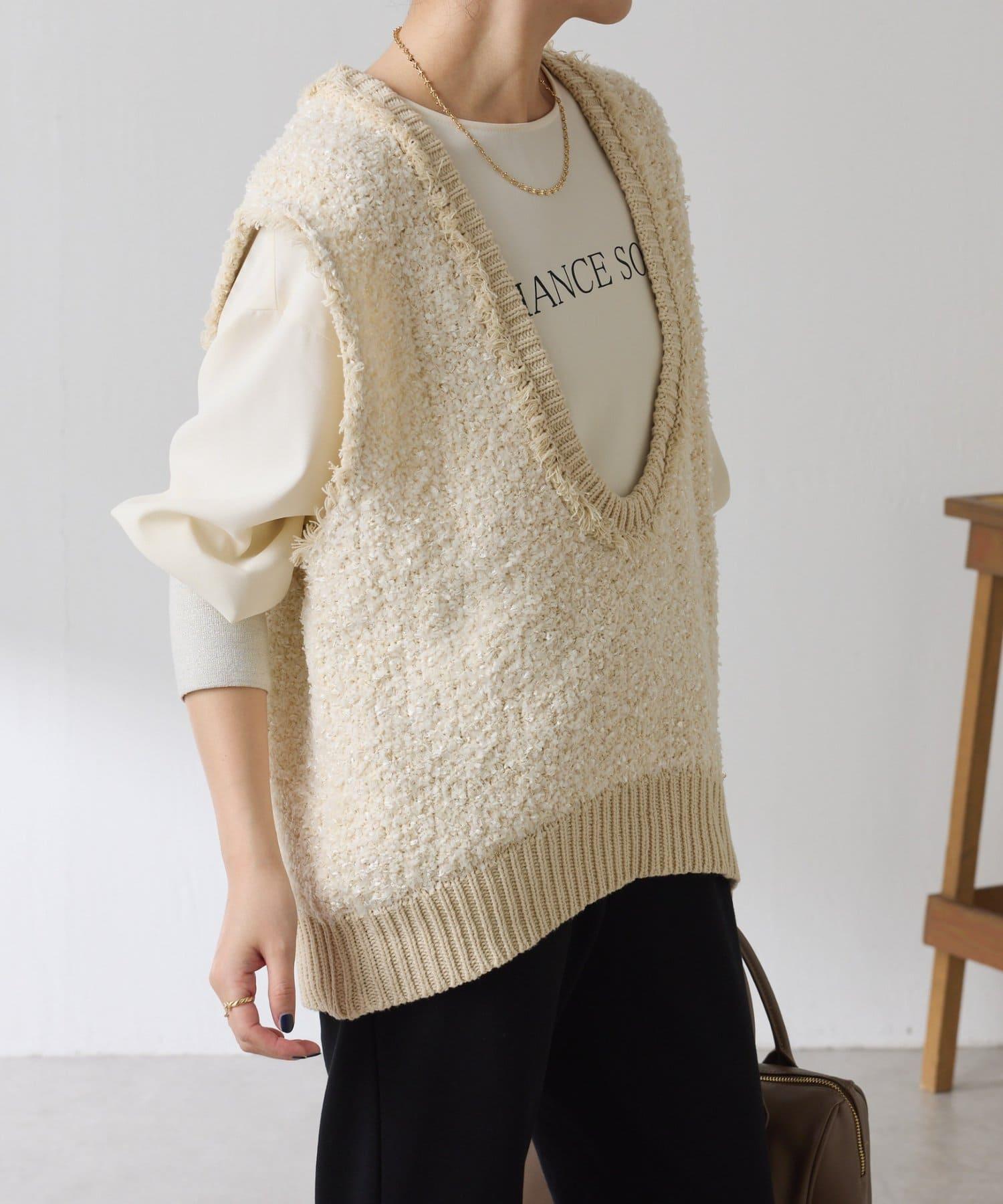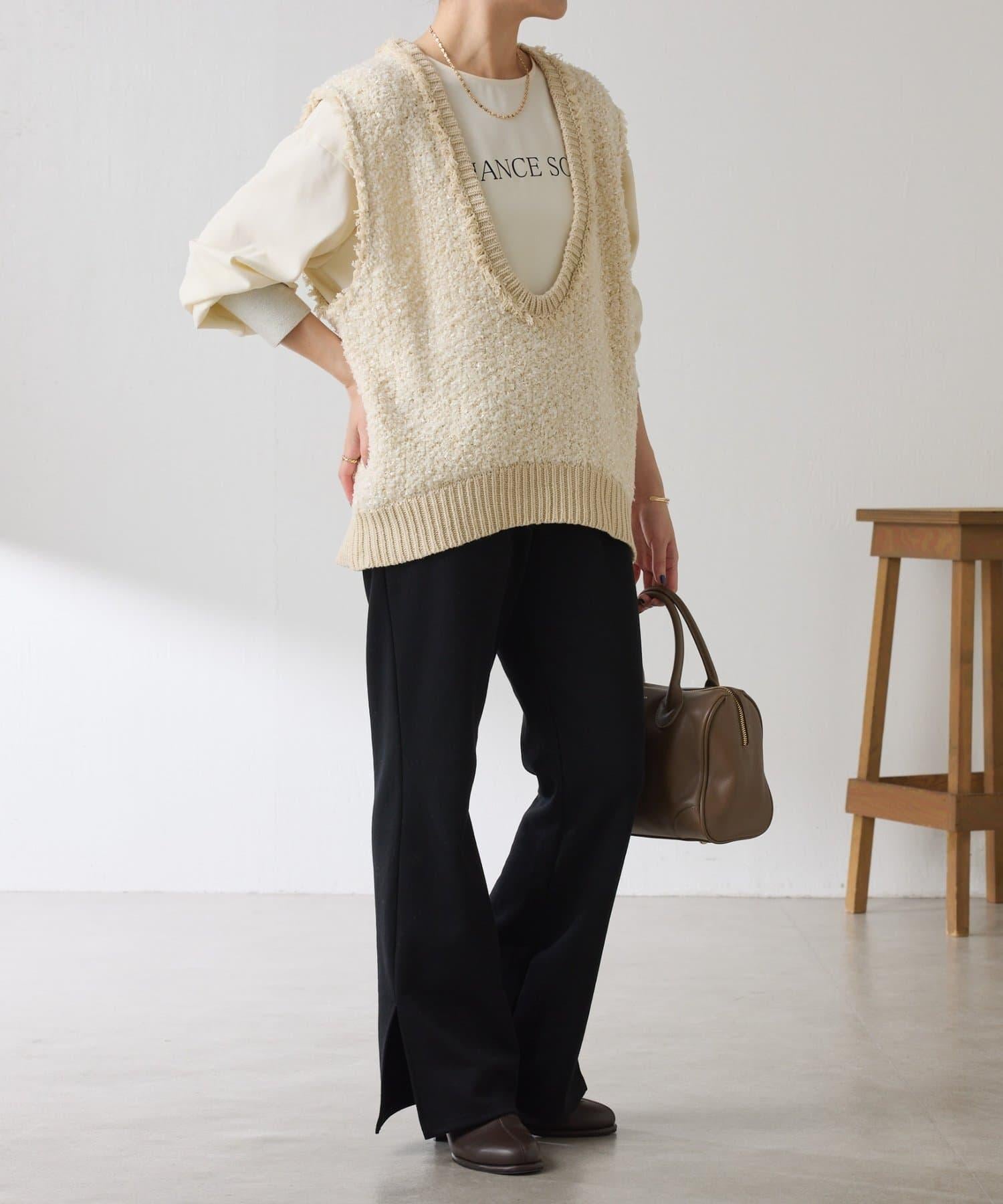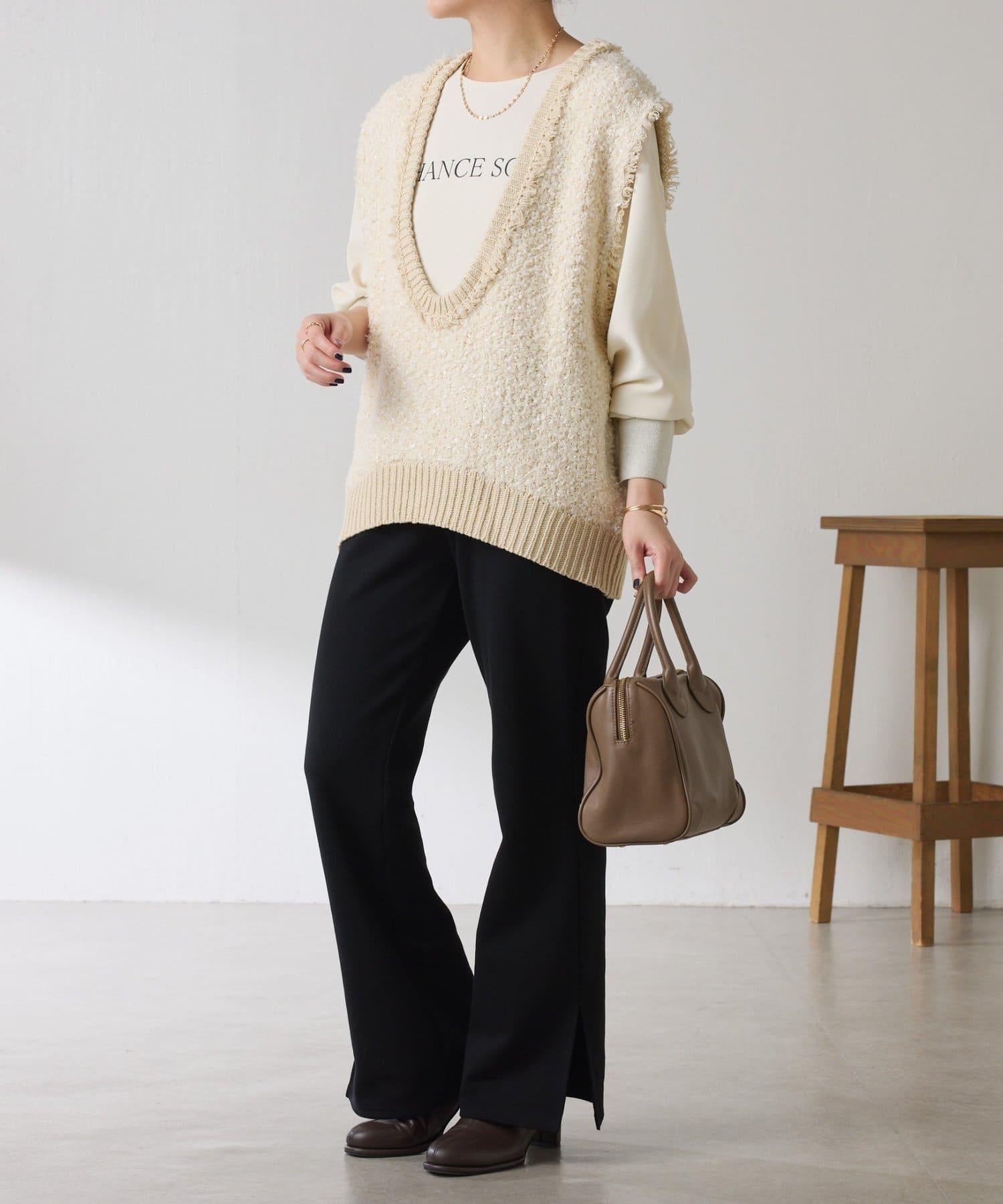 針織衫有一種寬鬆的感覺,領口為深 U 領。與蝴蝶結領結襯衫疊穿也很方便。