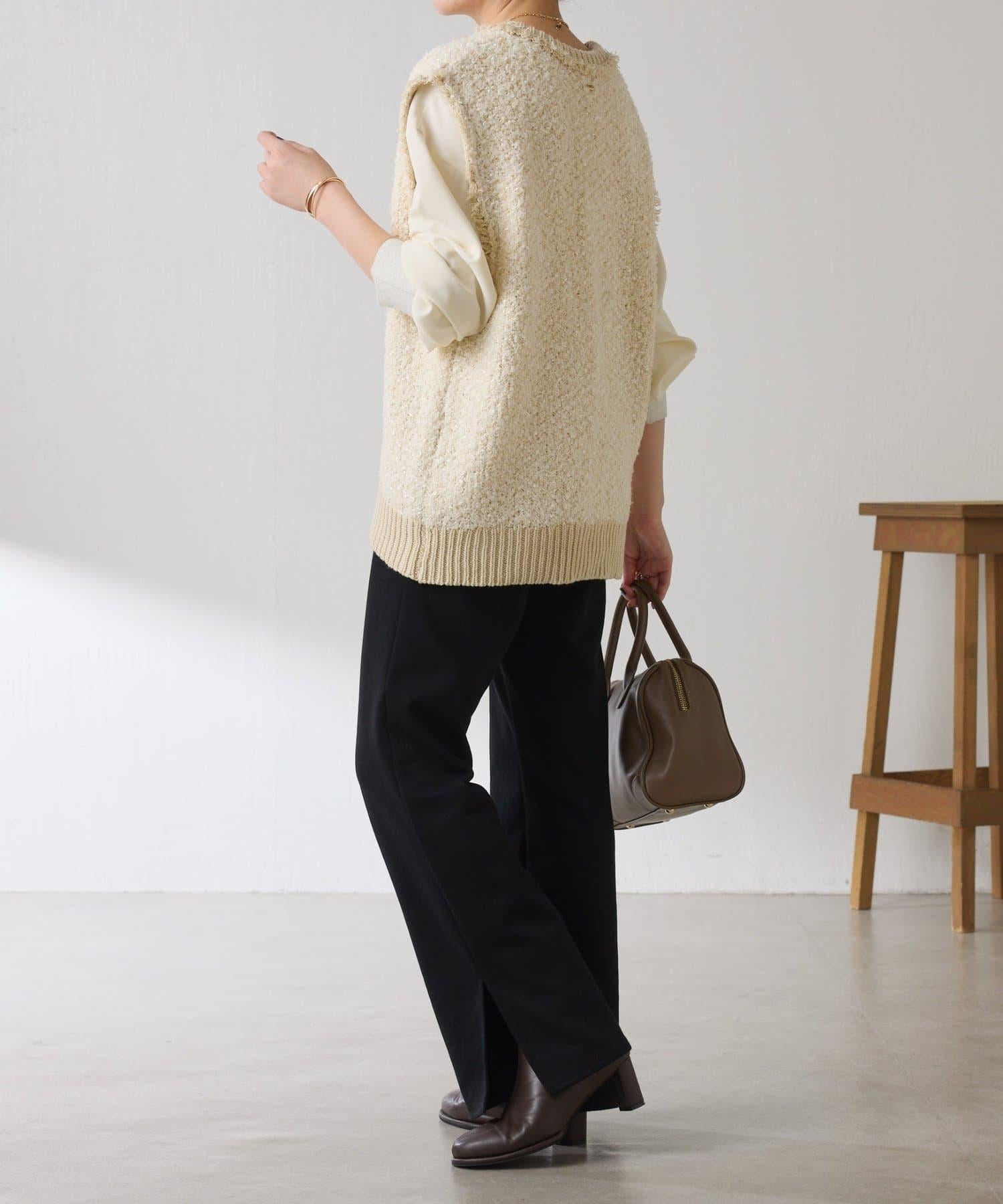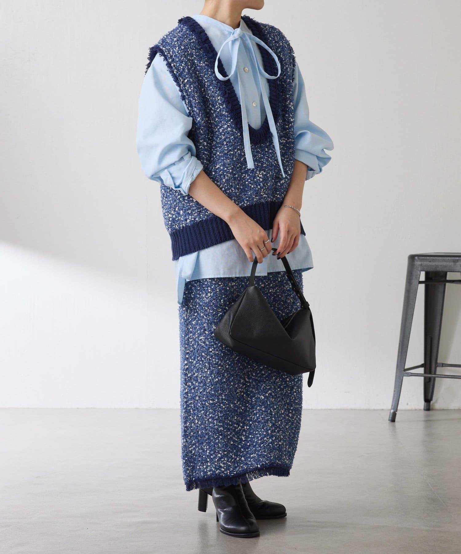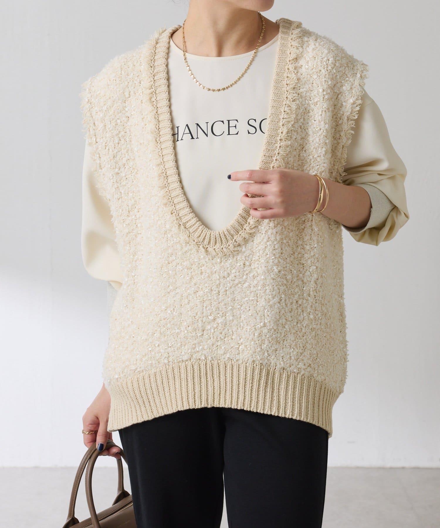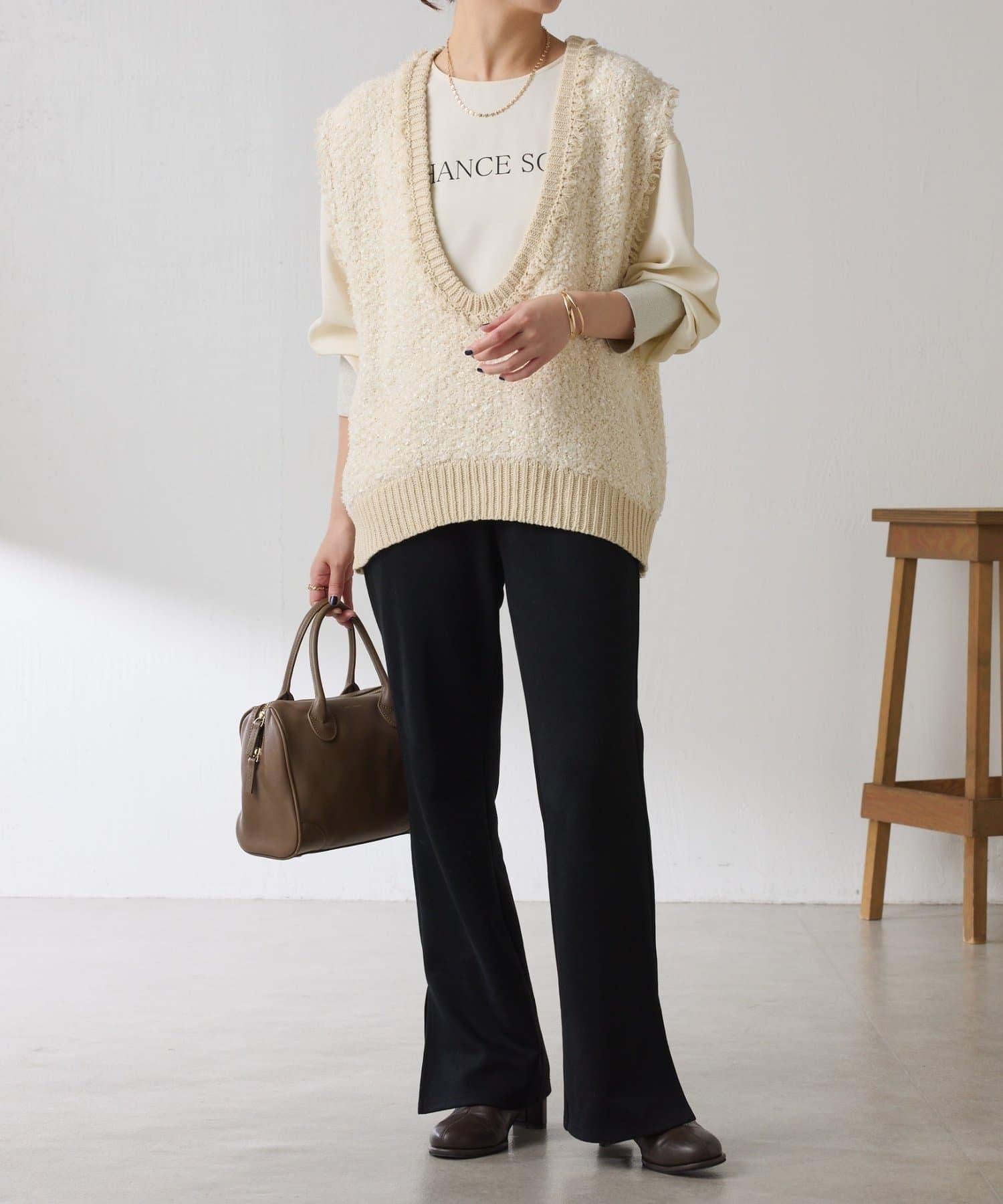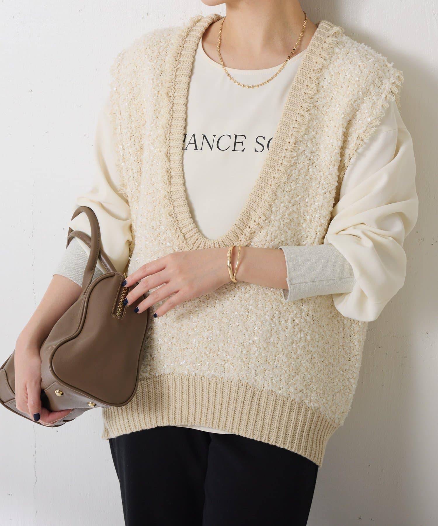 針織衫有一種寬鬆的感覺,領口為深 U 領。與蝴蝶結領結襯衫疊穿也很方便。