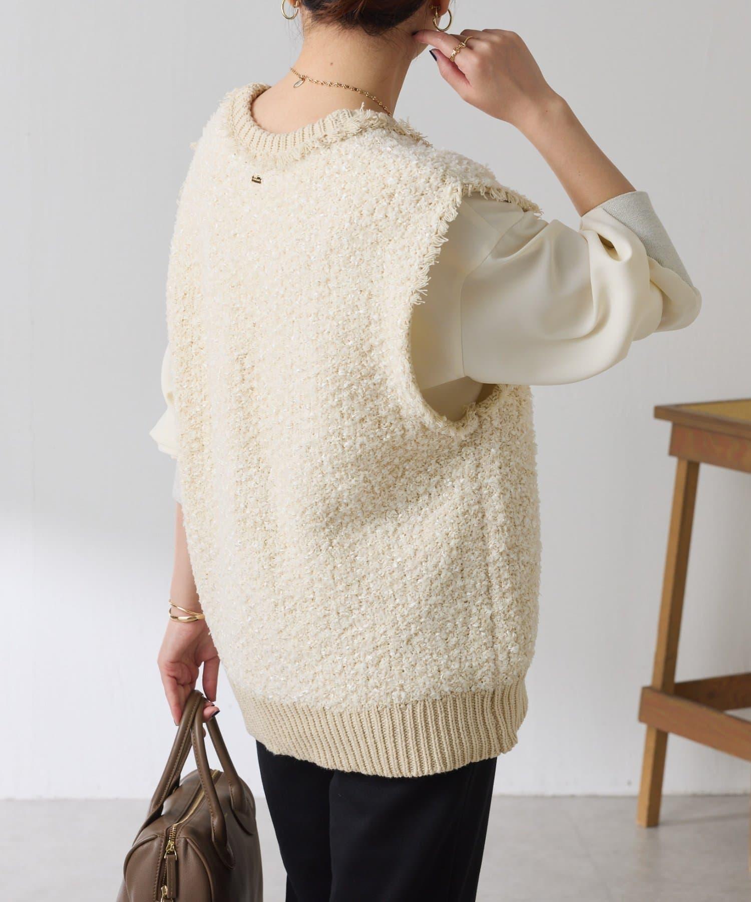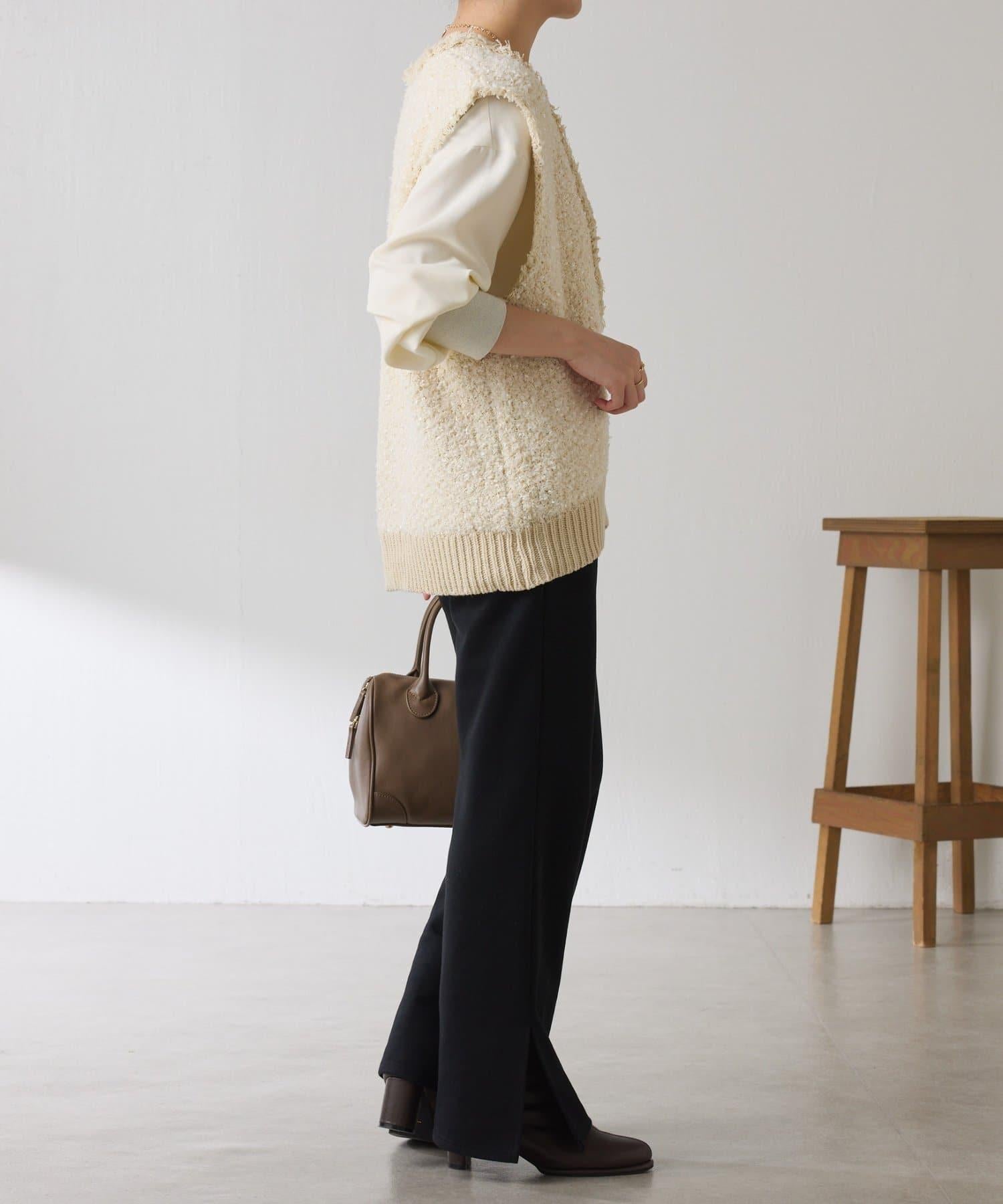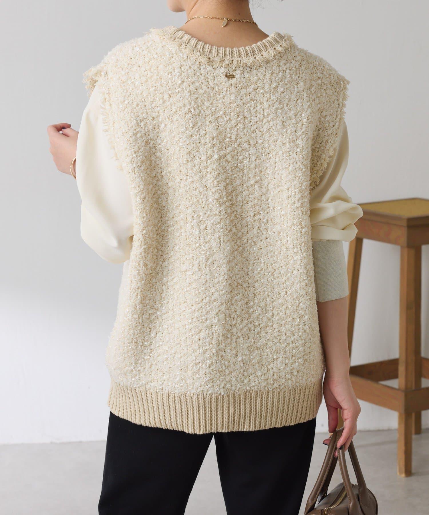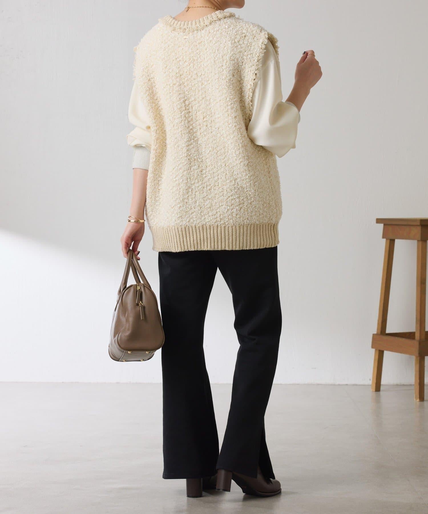 針織衫有一種寬鬆的感覺,領口為深 U 領。與蝴蝶結領結襯衫疊穿也很方便。