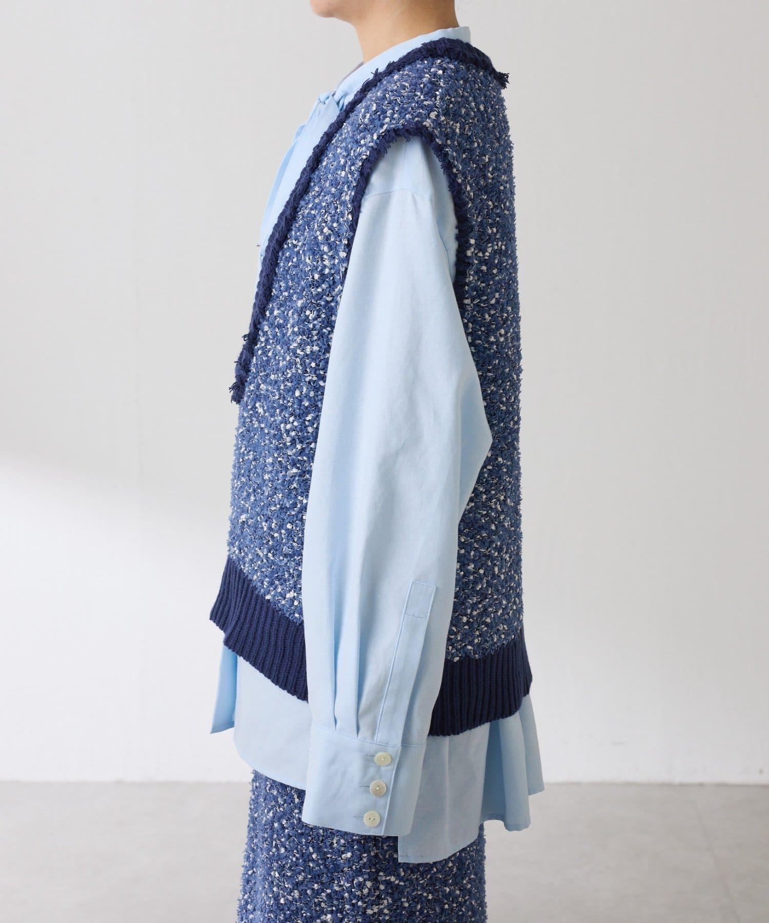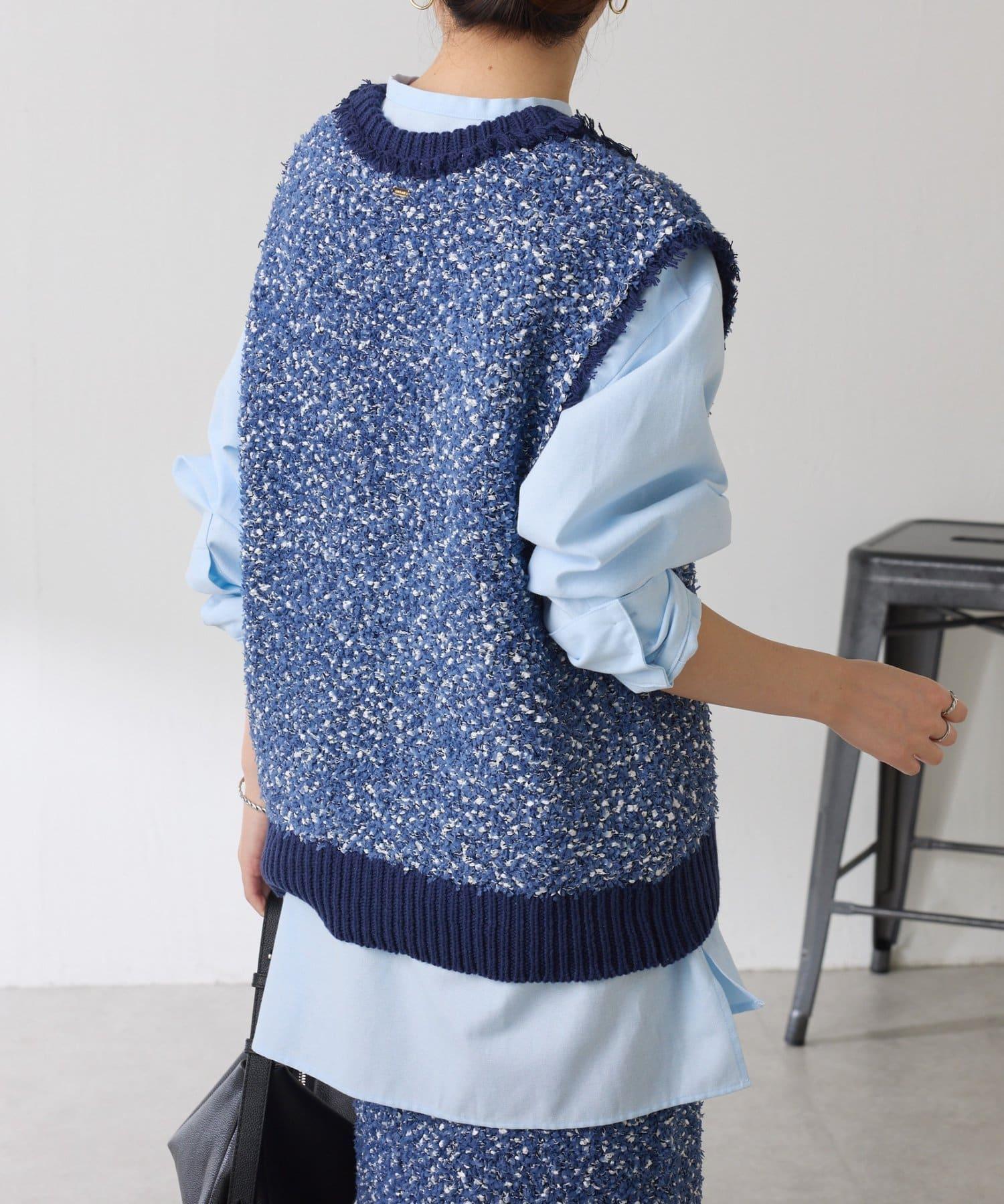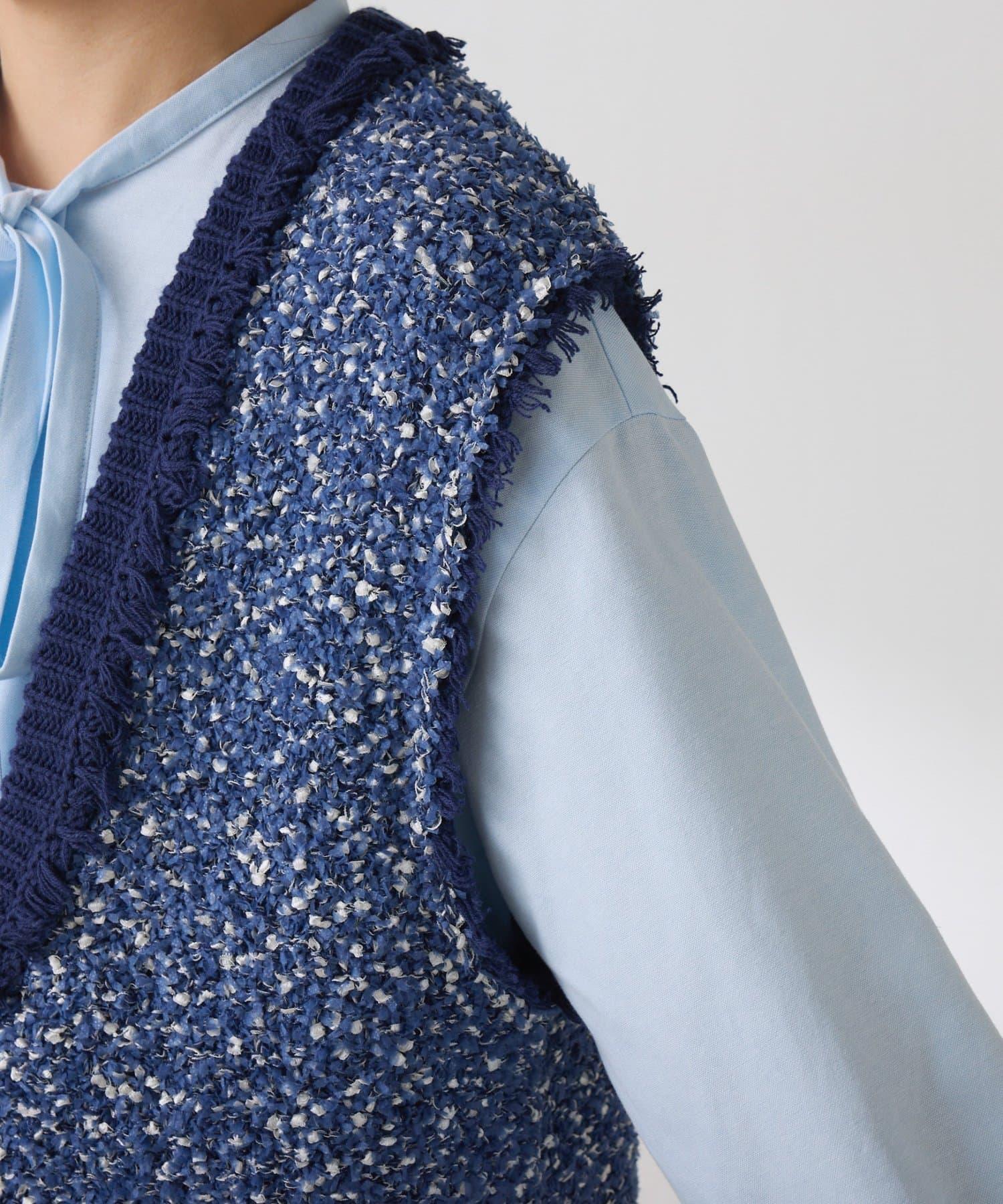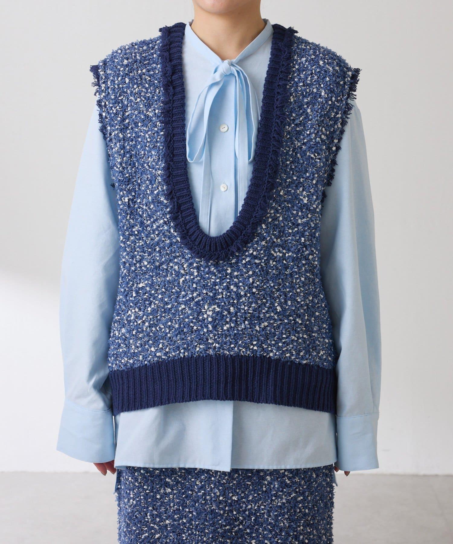 這款深 U 形針織馬甲採用三種不同的紗線,打造出凹凸不平的質感和混合色彩。