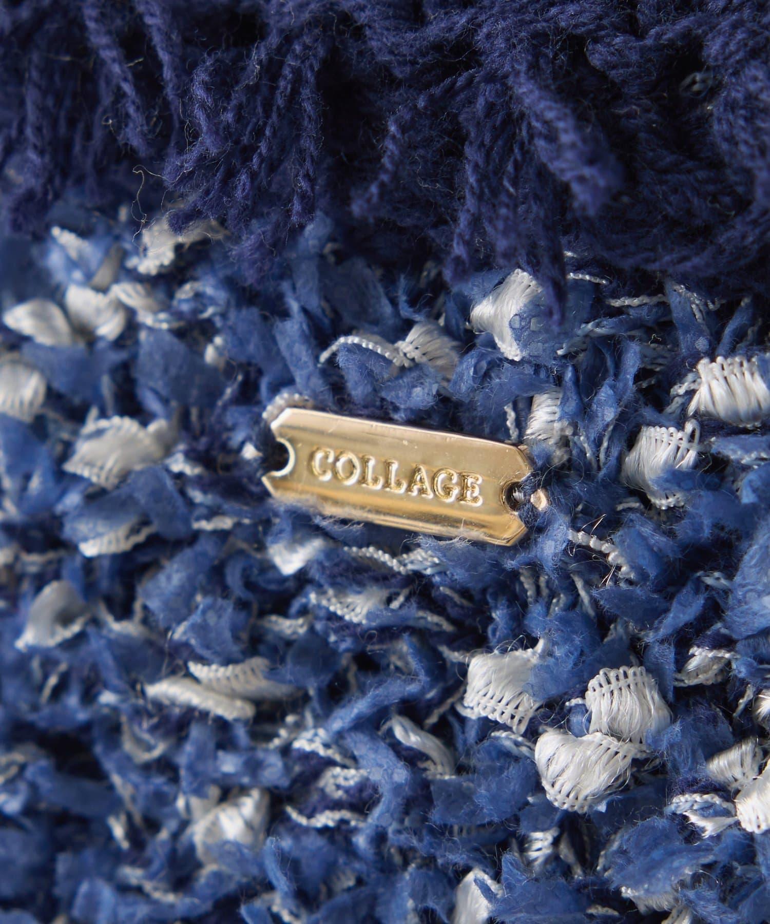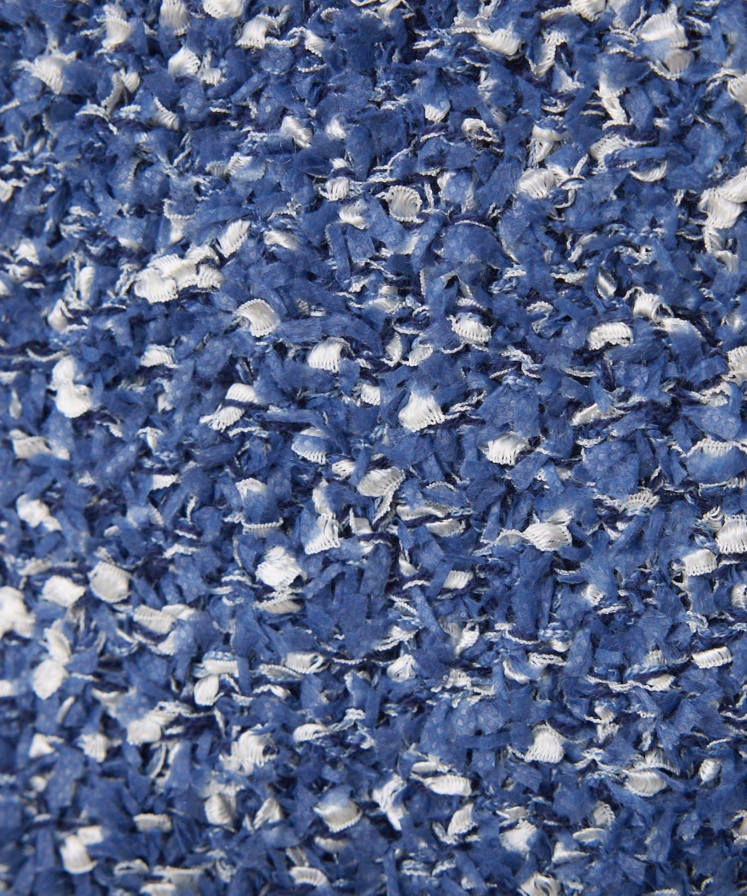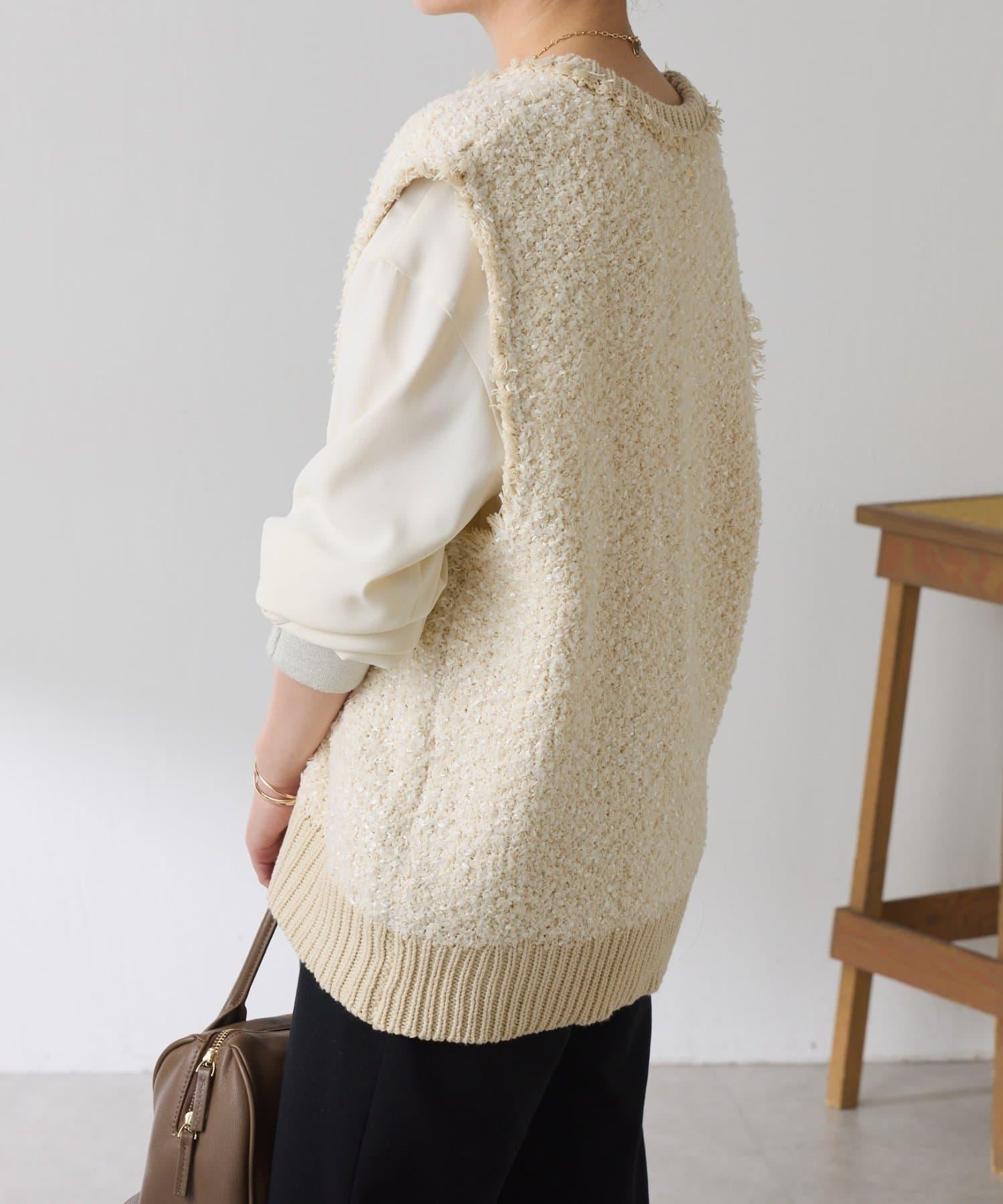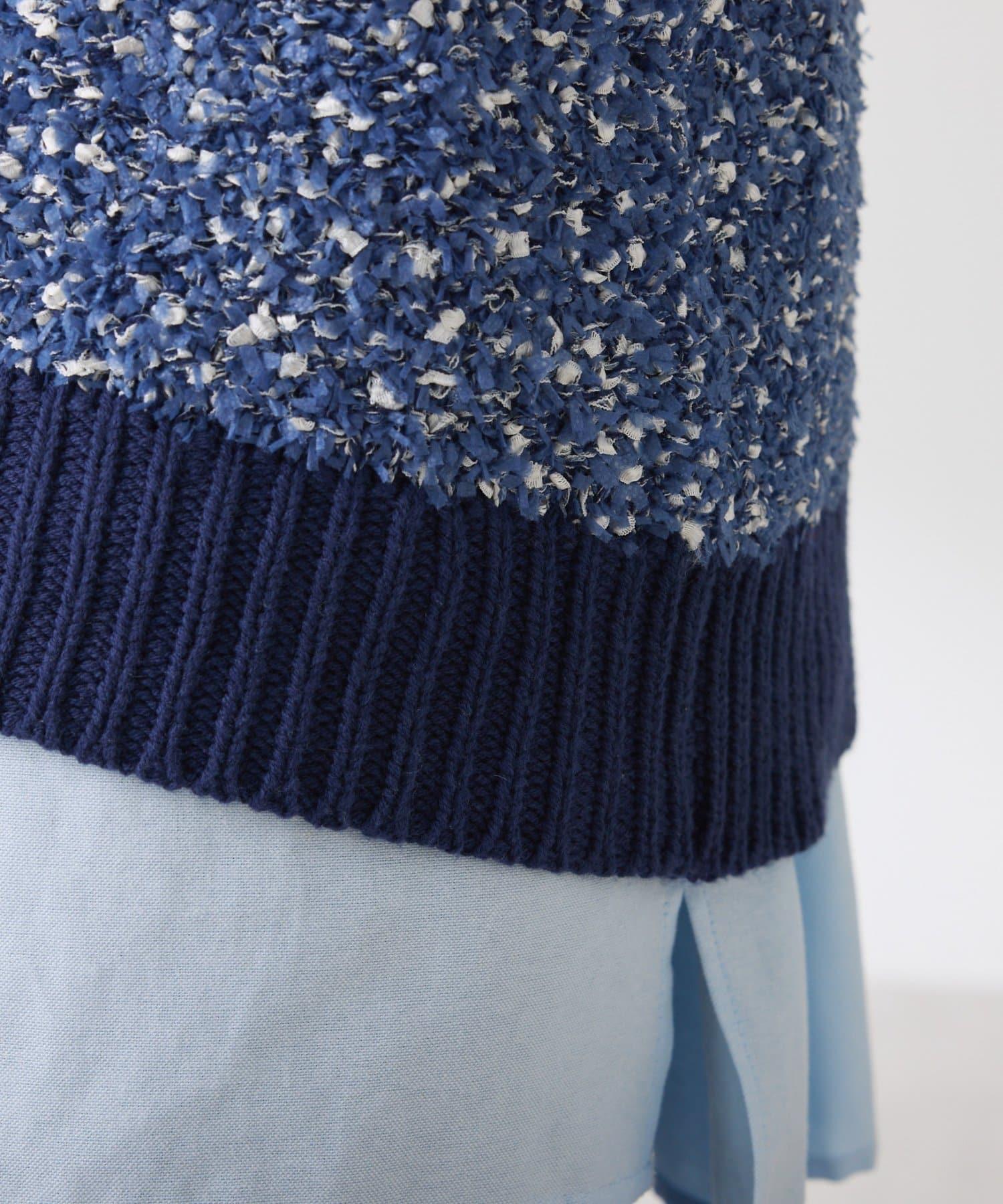 這款深 U 形針織馬甲採用三種不同的紗線,打造出凹凸不平的質感和混合色彩。