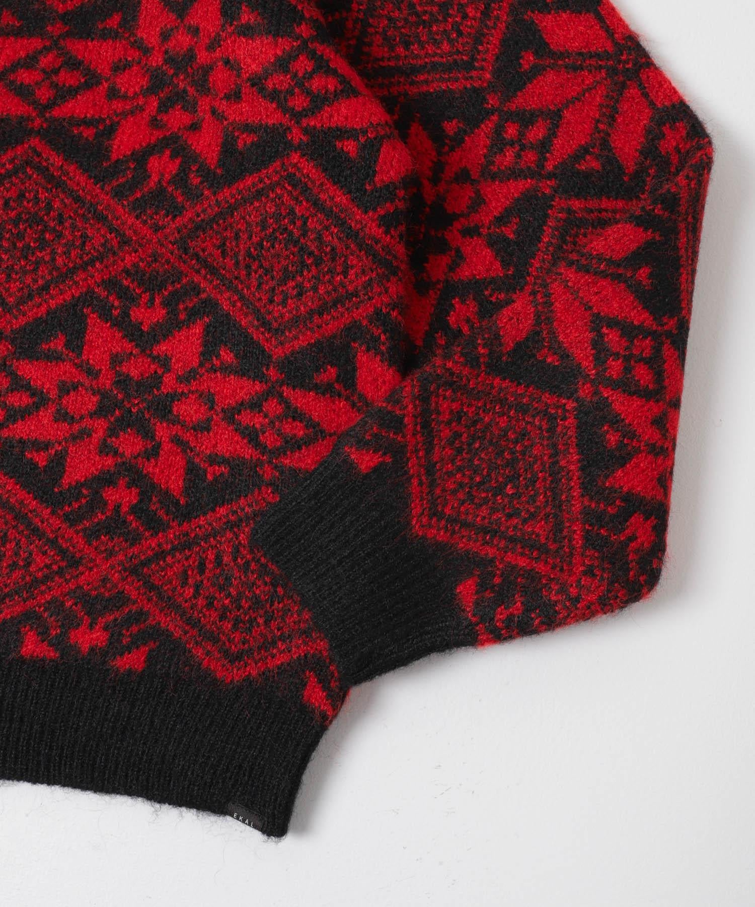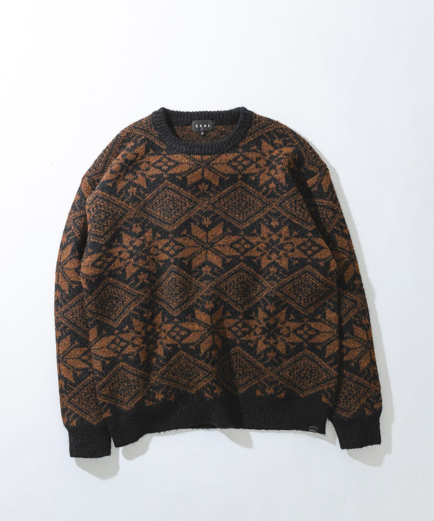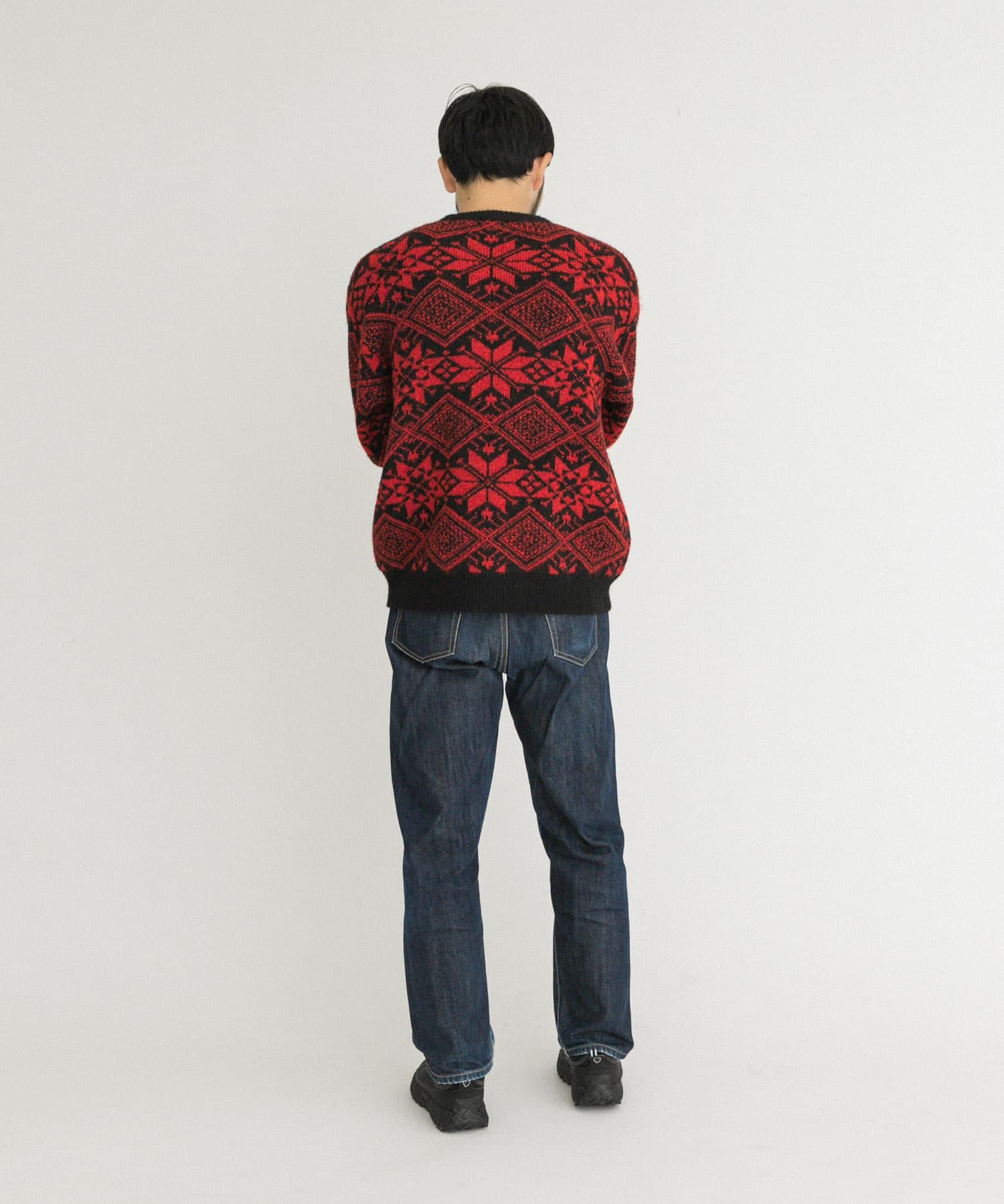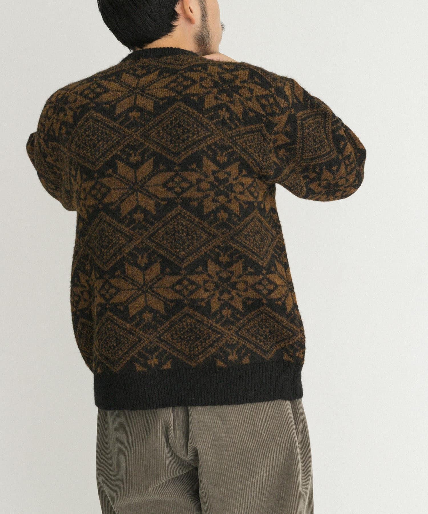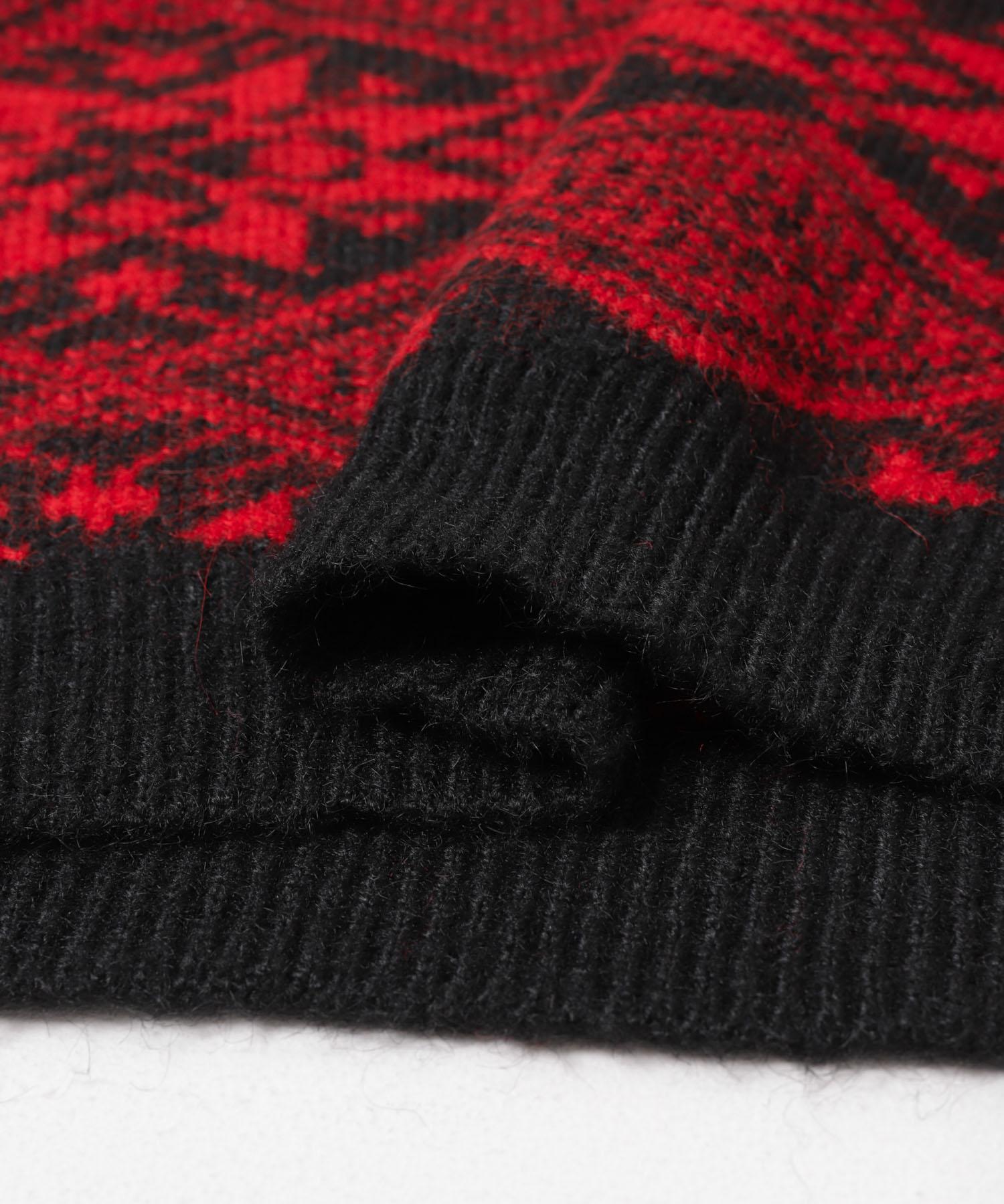 針織套頭衫,圓領設計,通身採用原創雪地圖案。 尺寸寬鬆。圖案通過毛紗表現出深度,給人以成熟的印象。 顏色採用黑色和棕色以及黑色和紅色的組合。這兩種配色可在溫暖的秋冬季穿著。
