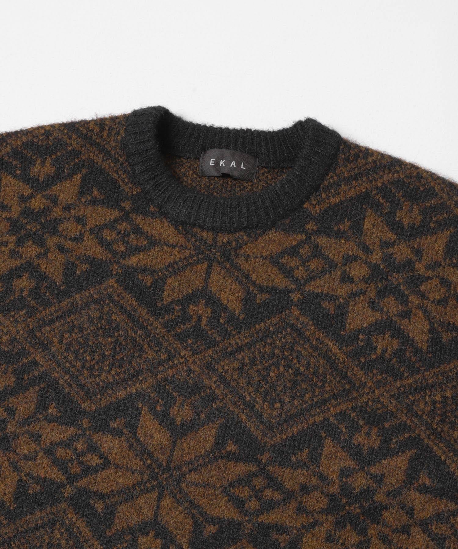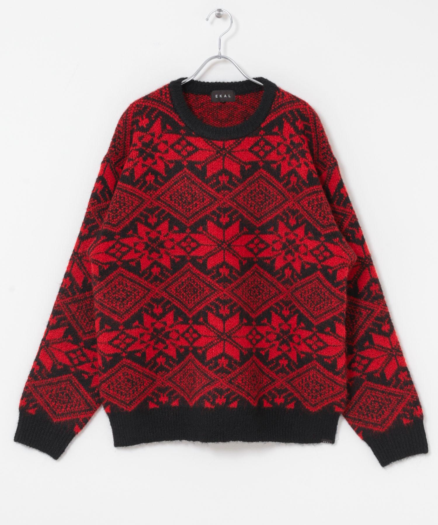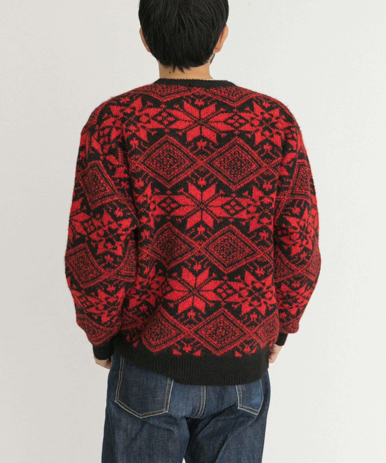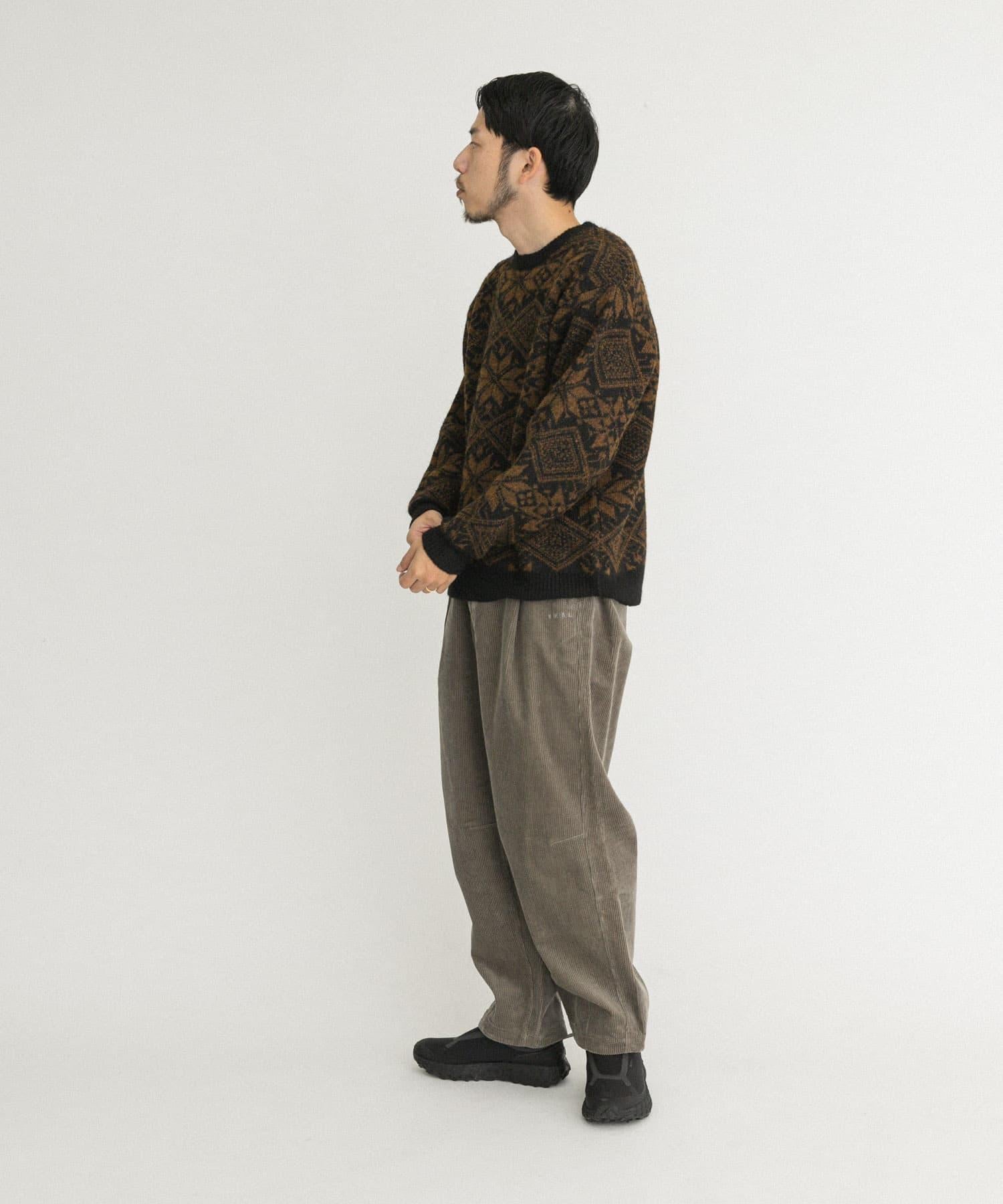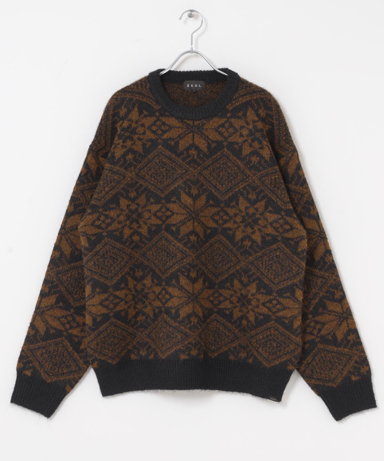 針織套頭衫,圓領設計,通身採用原創雪地圖案。 尺寸寬鬆。圖案通過毛紗表現出深度,給人以成熟的印象。 顏色採用黑色和棕色以及黑色和紅色的組合。這兩種配色可在溫暖的秋冬季穿著。