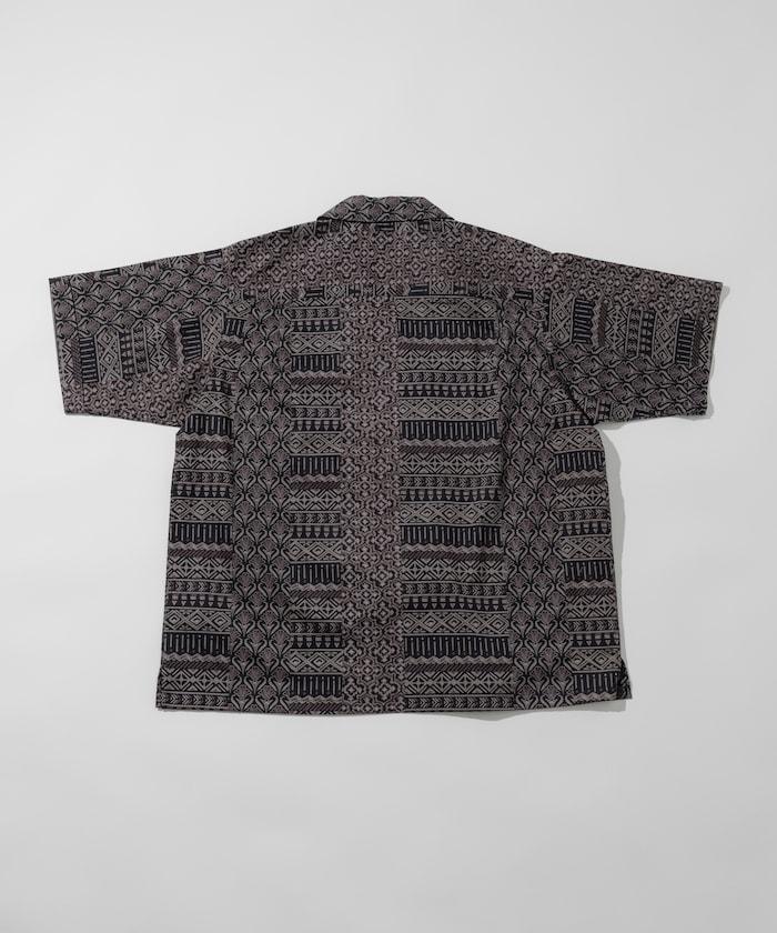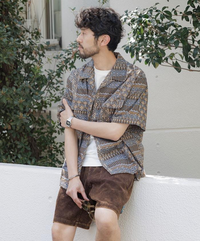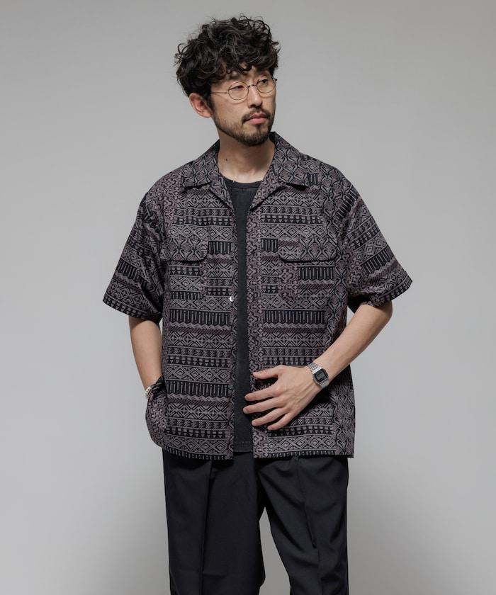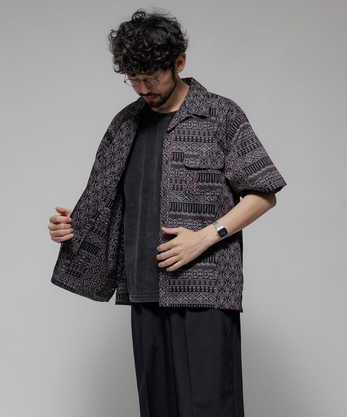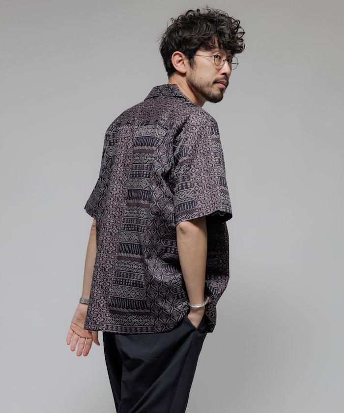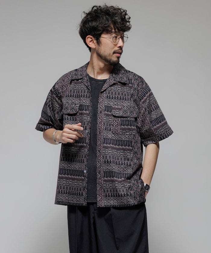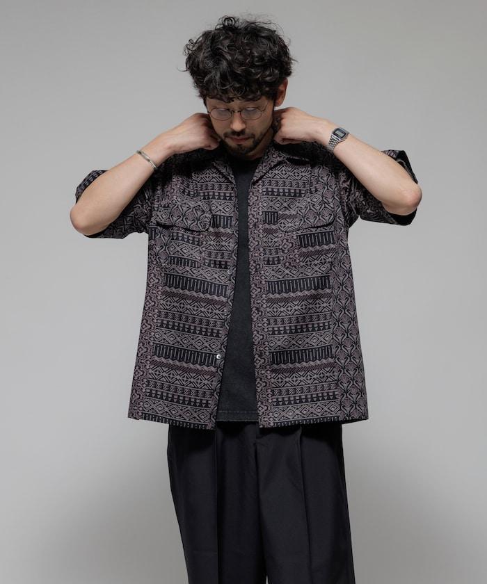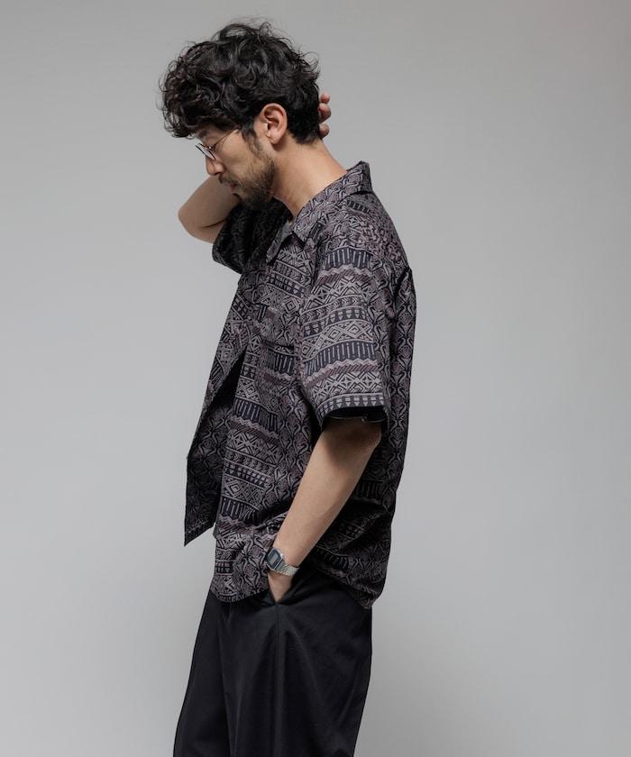 1006248901525: 印度製造寬鬆版型伊卡圖案提花開領短袖襯衫