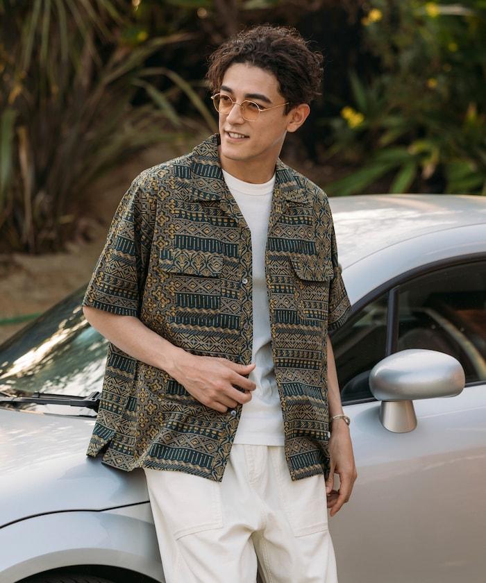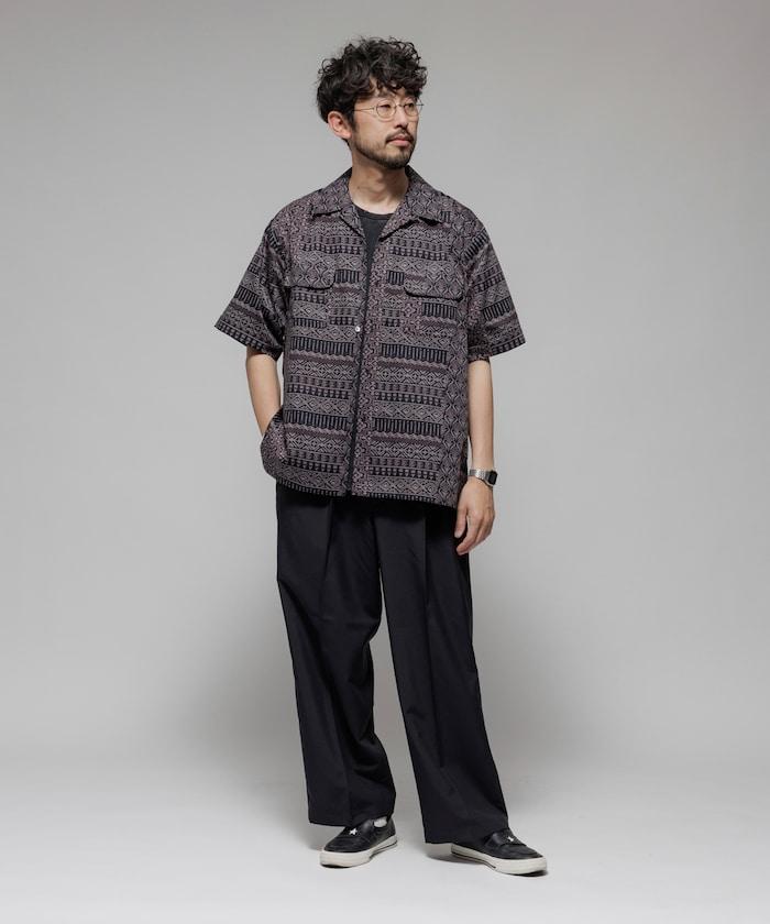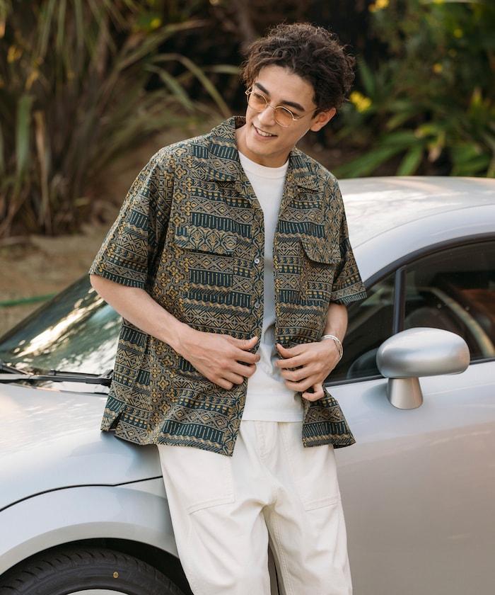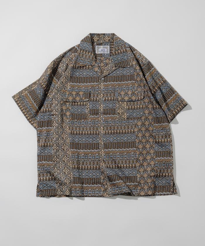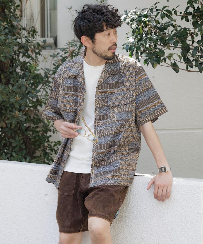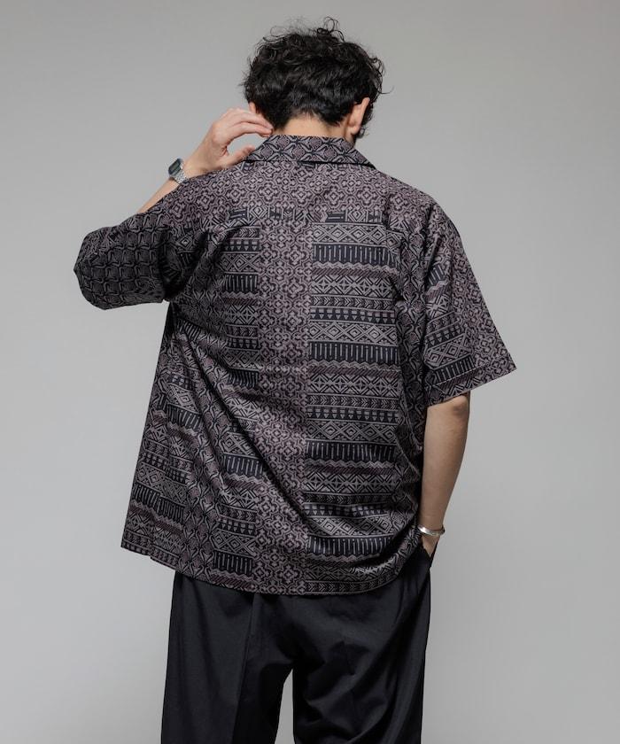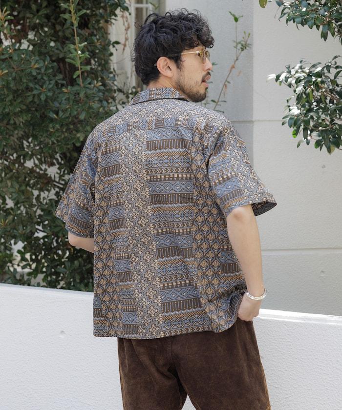 1006248901525: 印度製造寬鬆版型伊卡圖案提花開領短袖襯衫