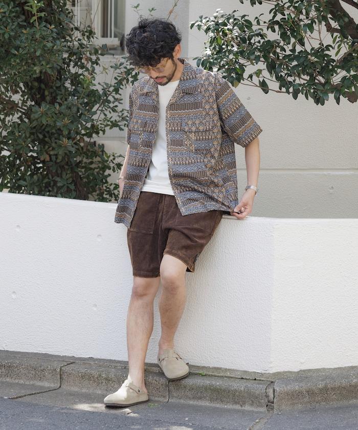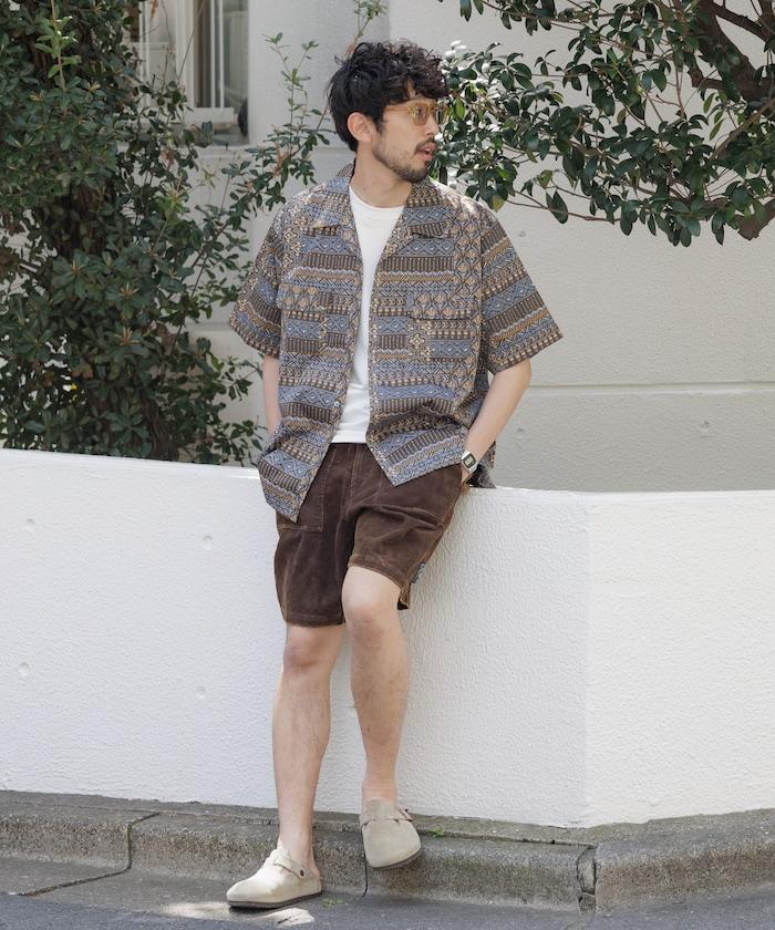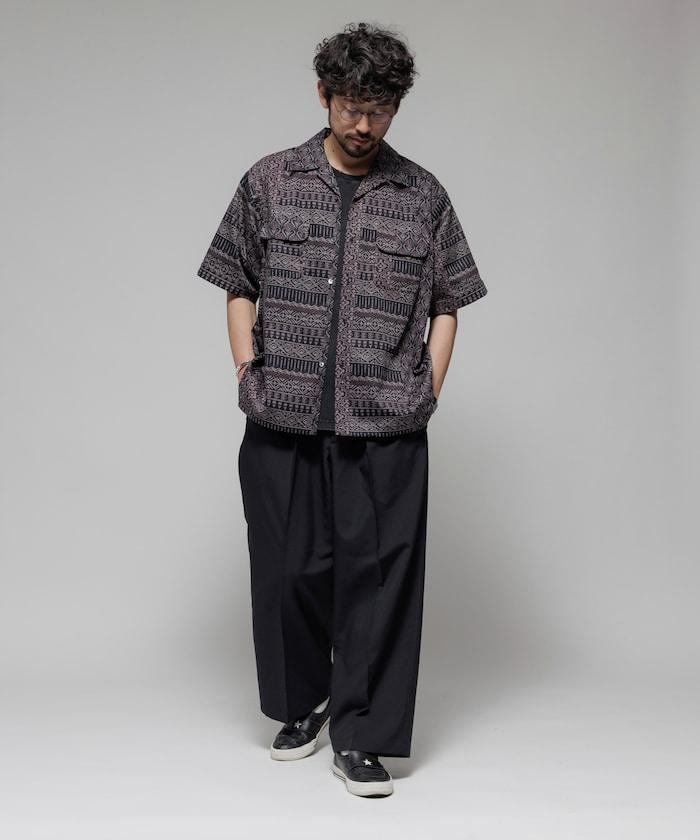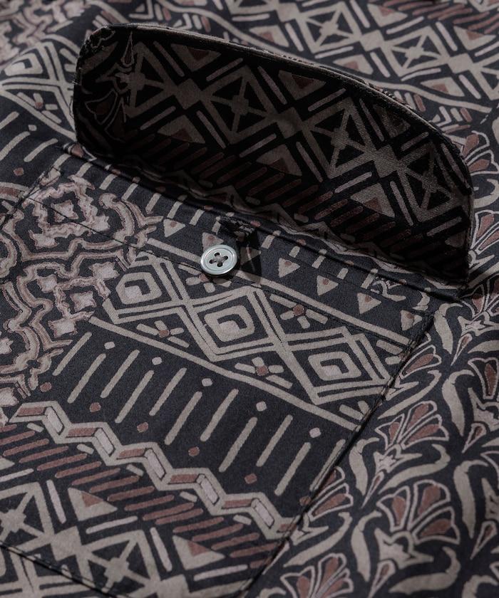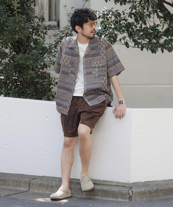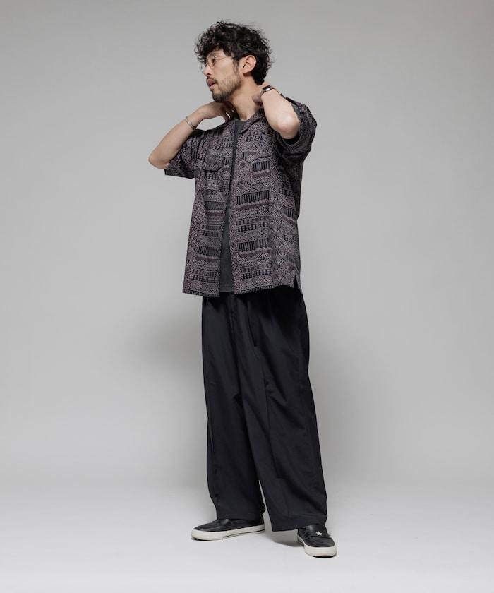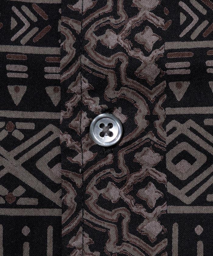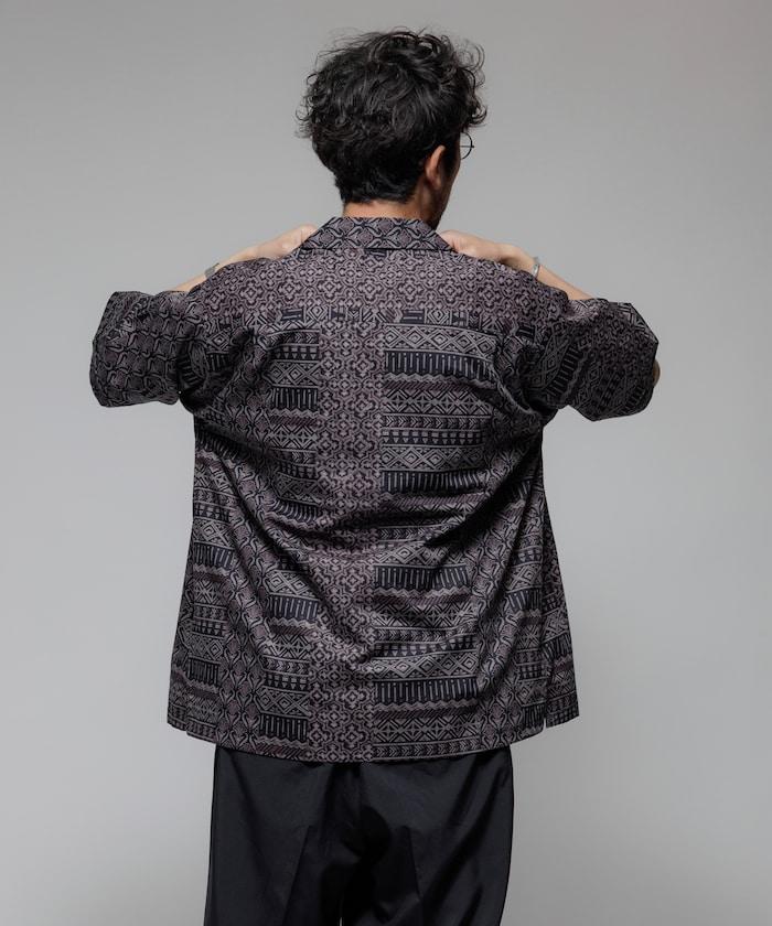1006248901525: 印度製造寬鬆版型伊卡圖案提花開領短袖襯衫