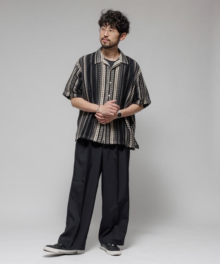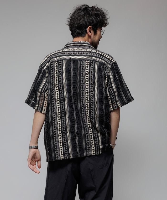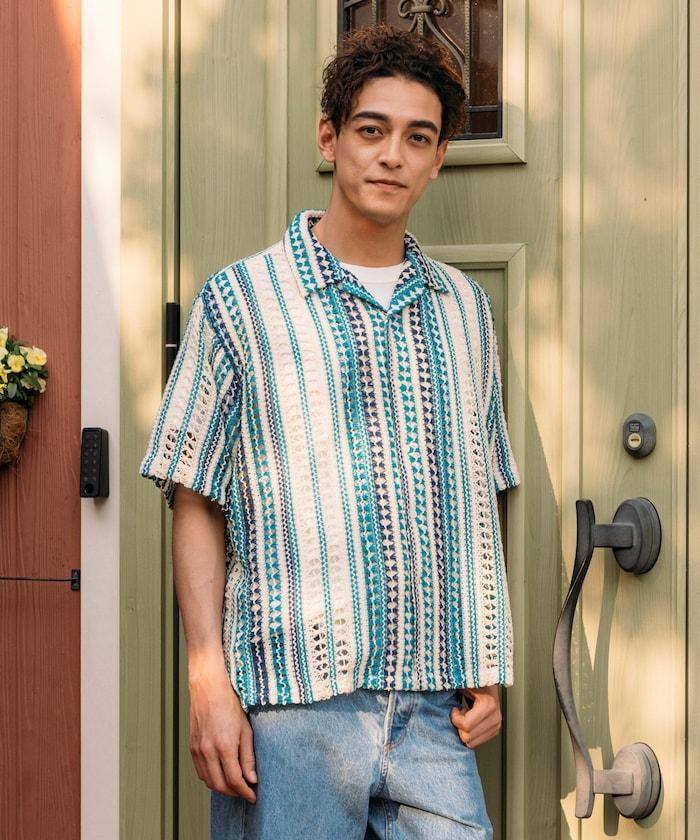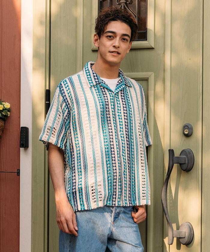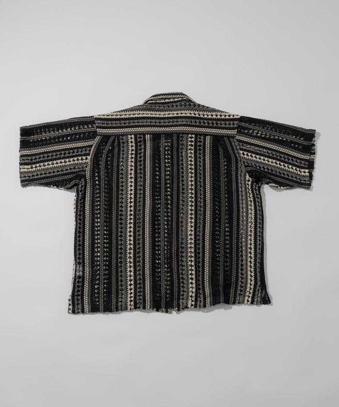 印度制 寬鬆版型 綜合圖案蕾絲 多色條紋 開領襯衫 短袖