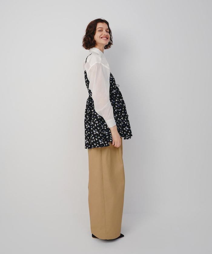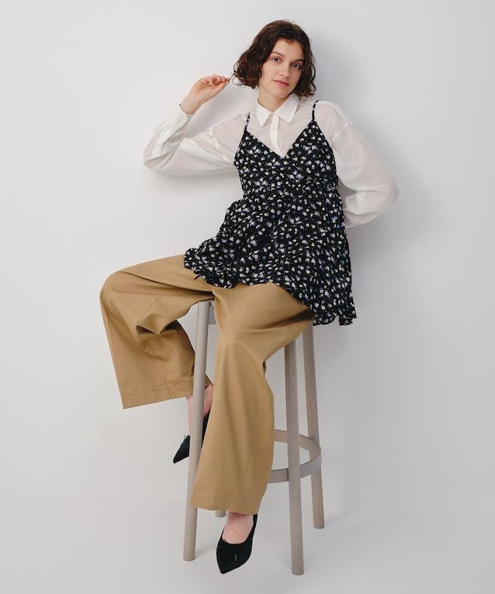 大量褶皺的 V 領設計遮住了腰部,給人圓潤的感覺,同時 V 領的設計也提升了時尚感。