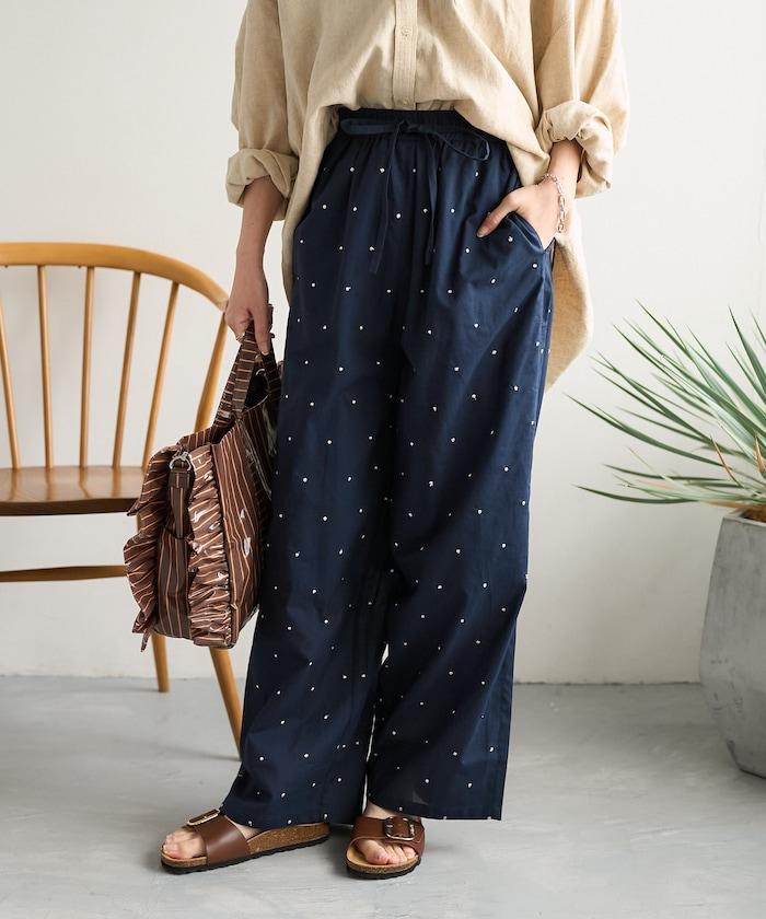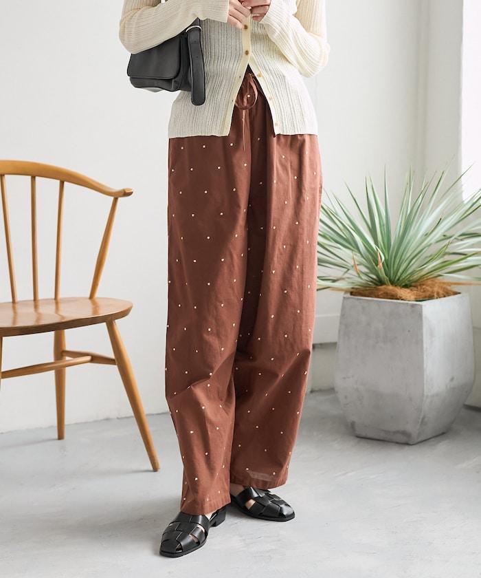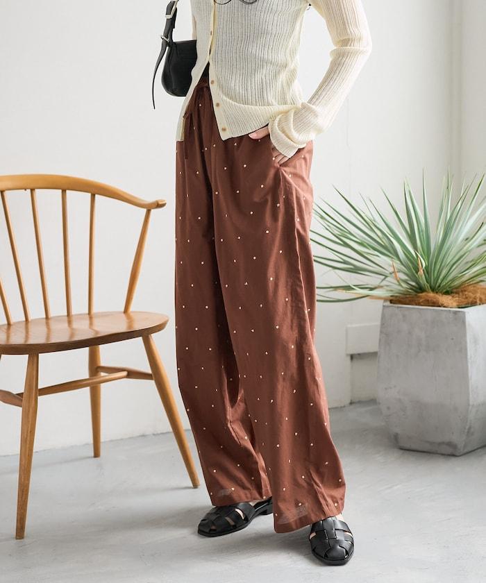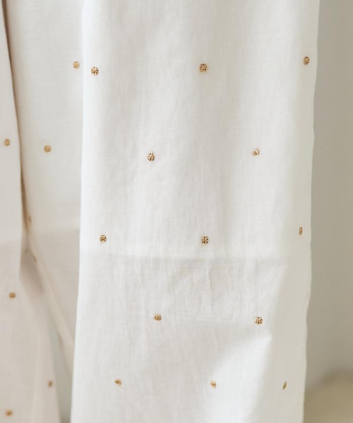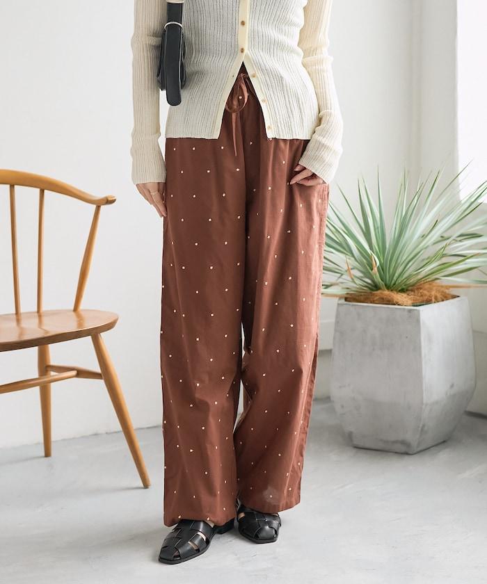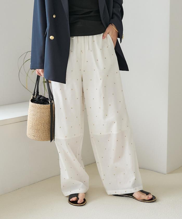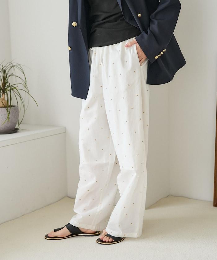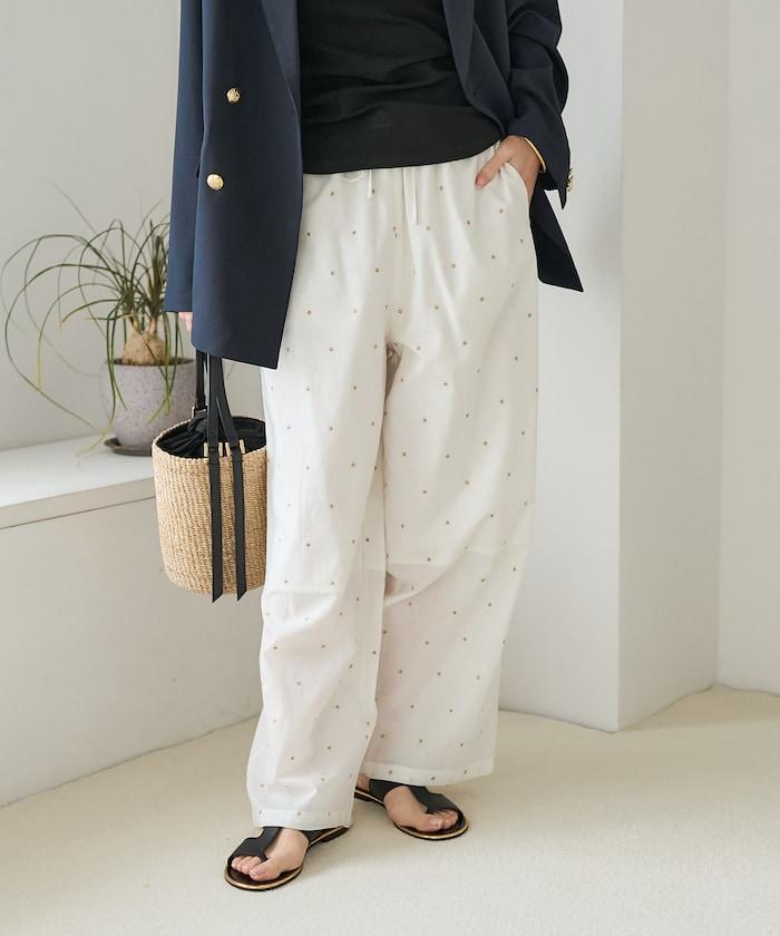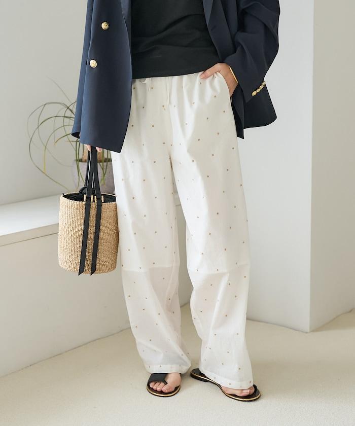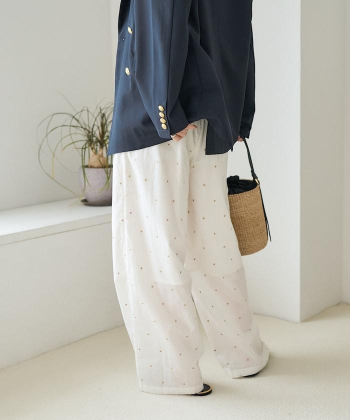 這款長褲採用淺色棉質面料,繡有蹩腳的線點,給人一種微妙的華麗感。