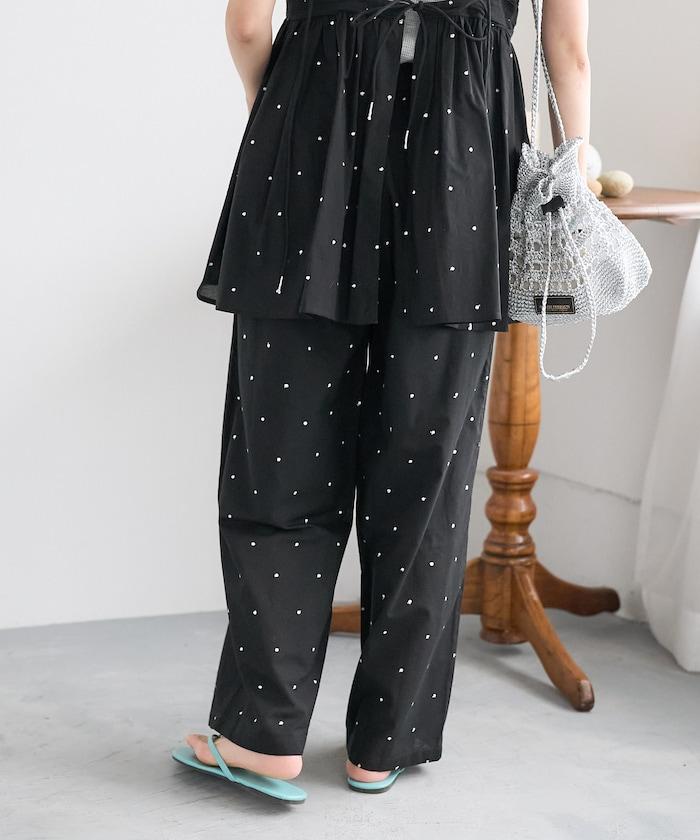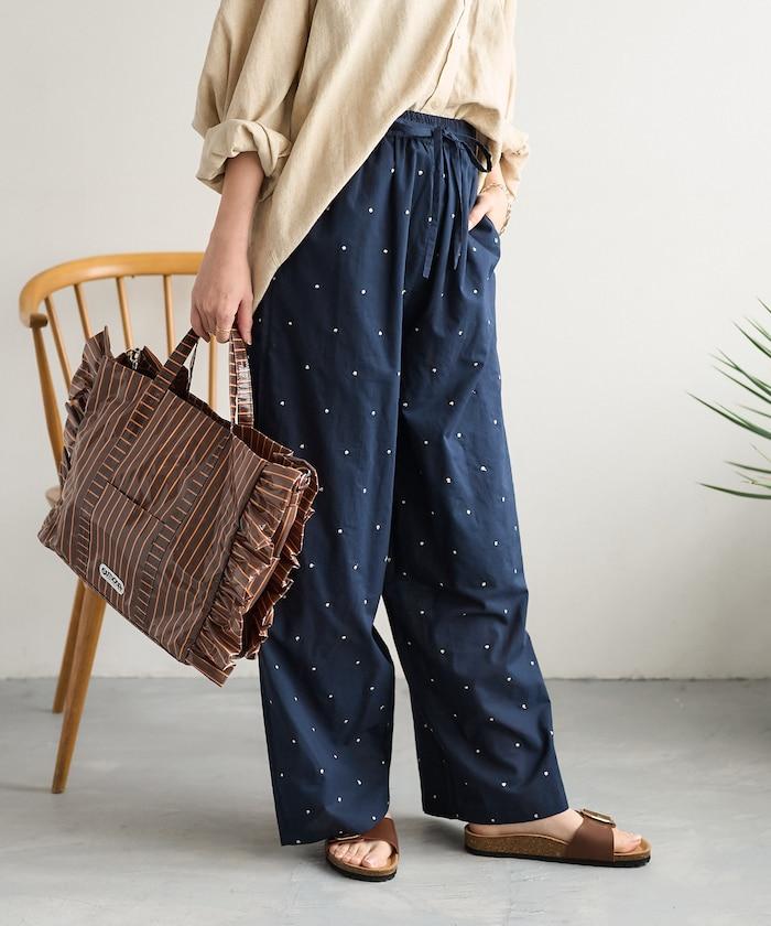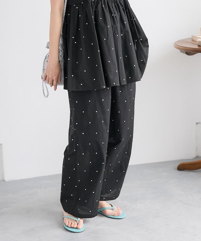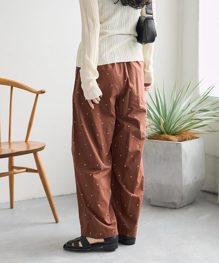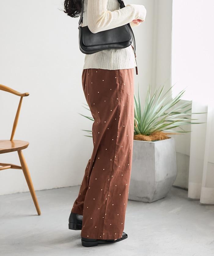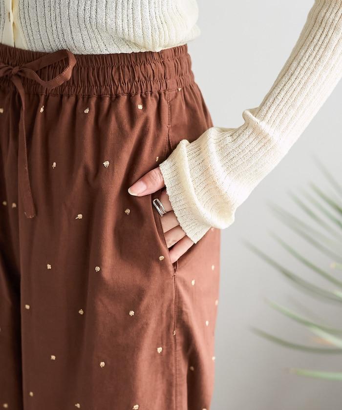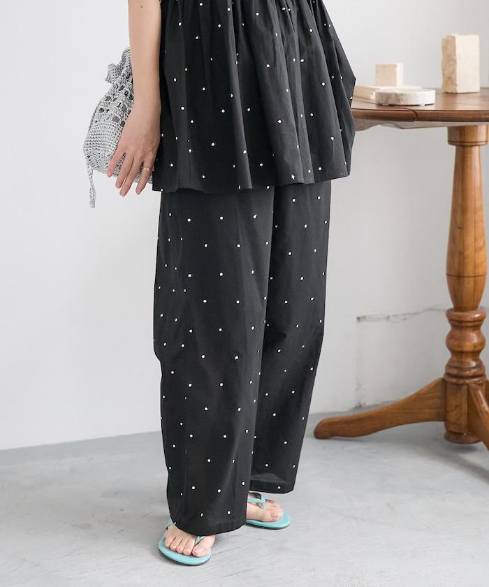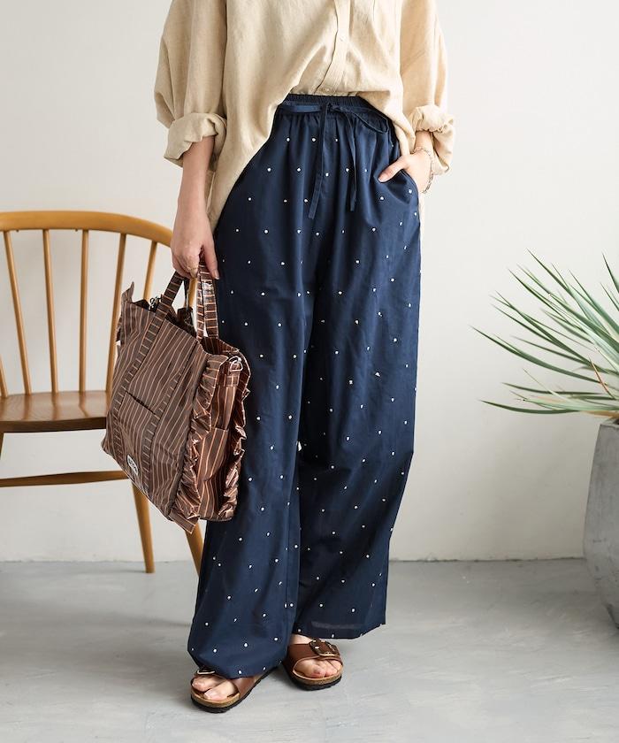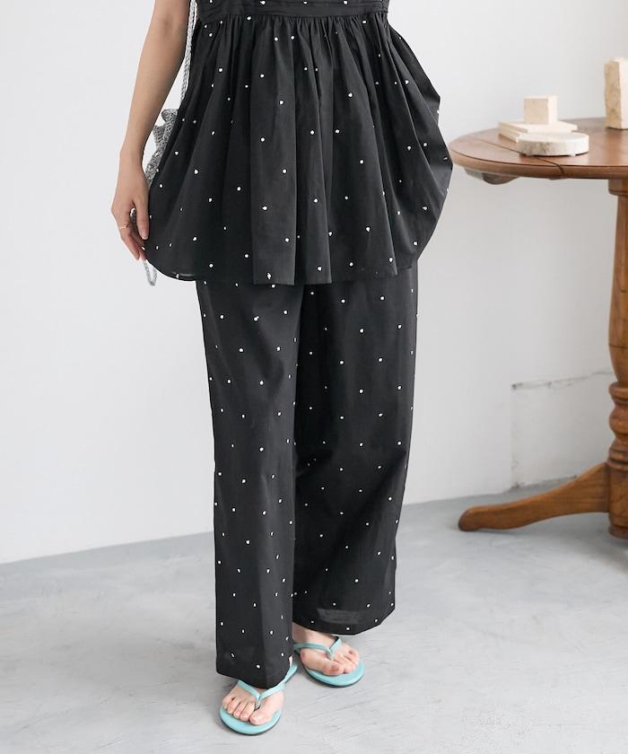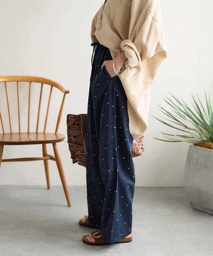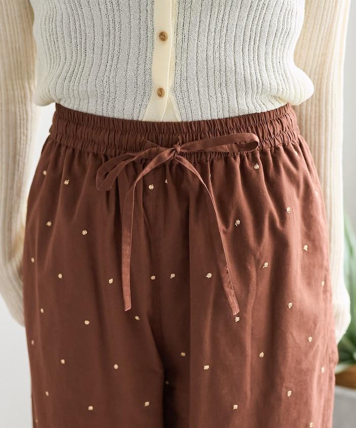 這款長褲採用淺色棉質面料,繡有蹩腳的線點,給人一種微妙的華麗感。