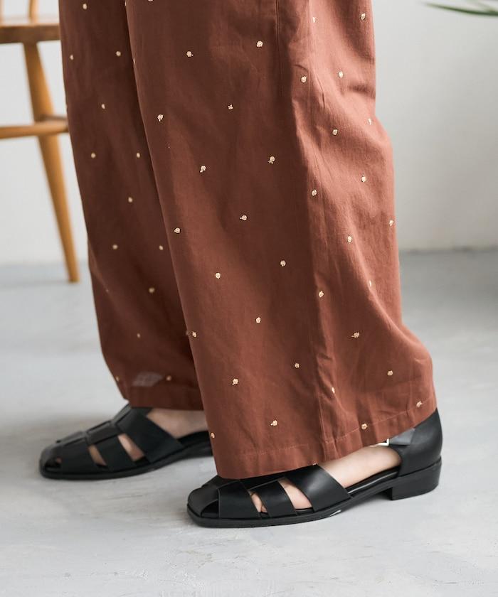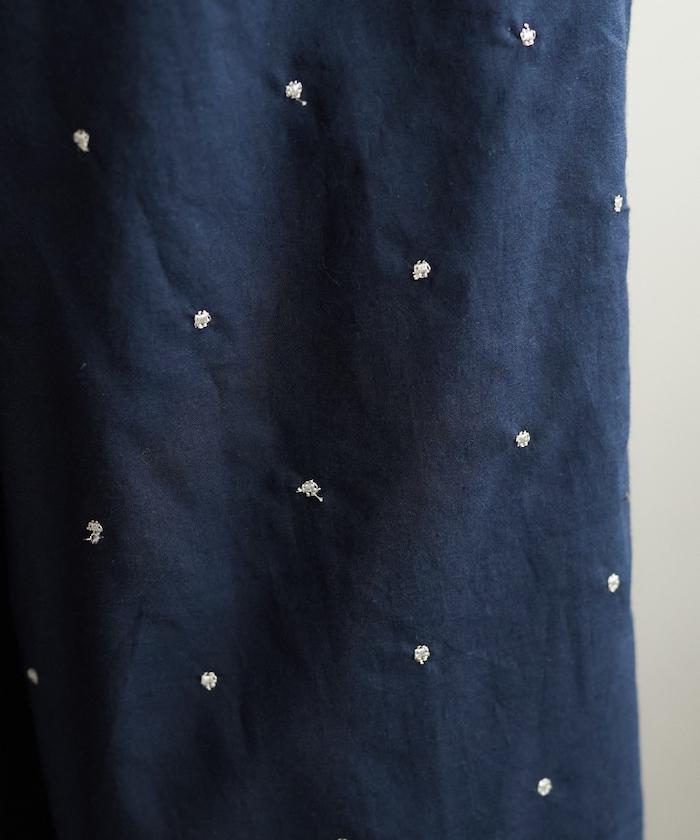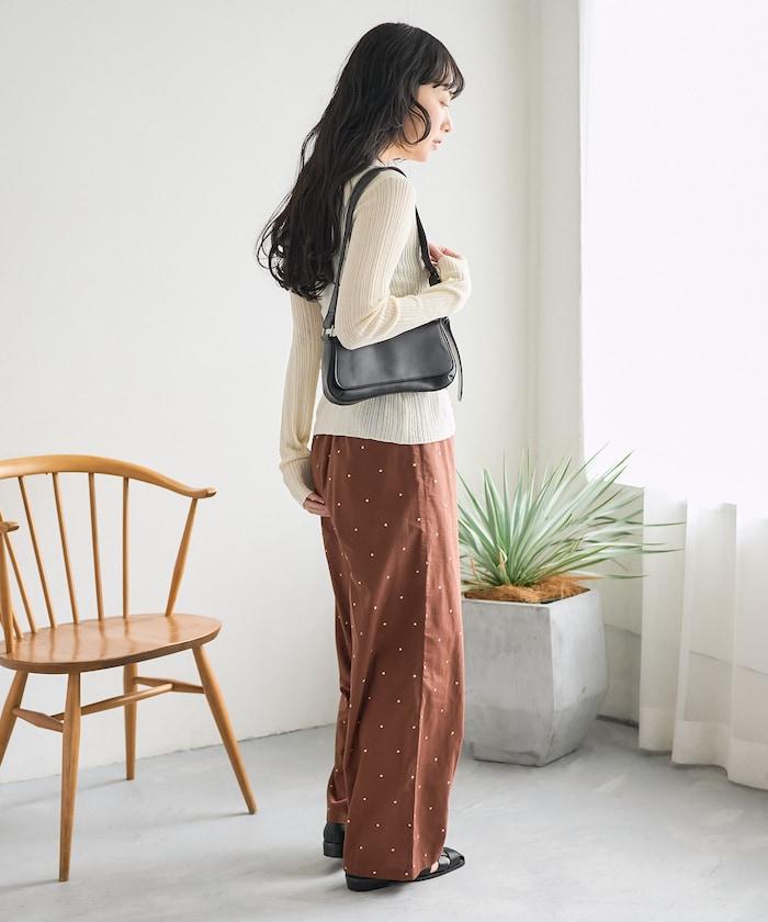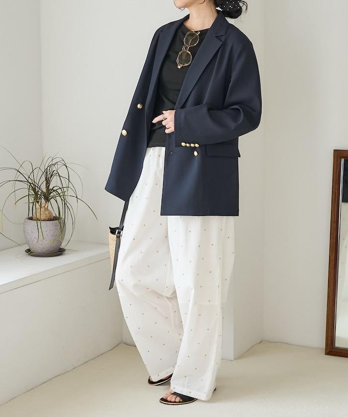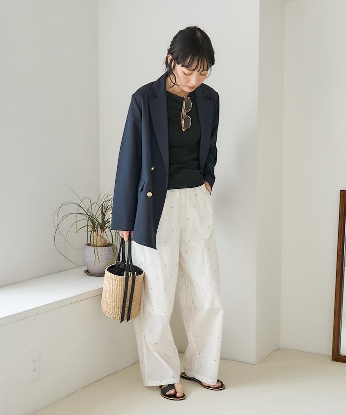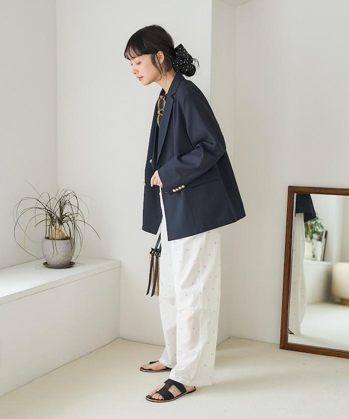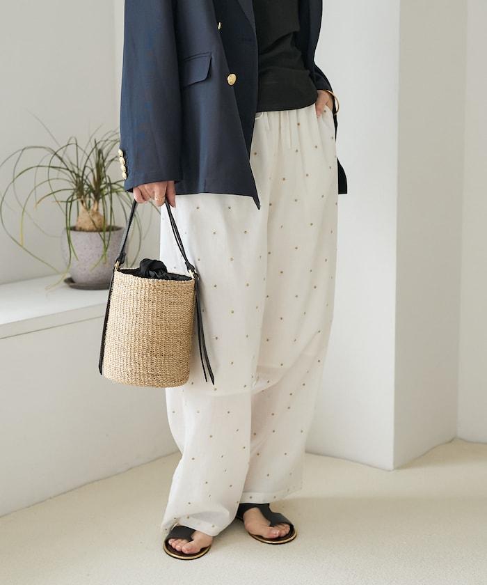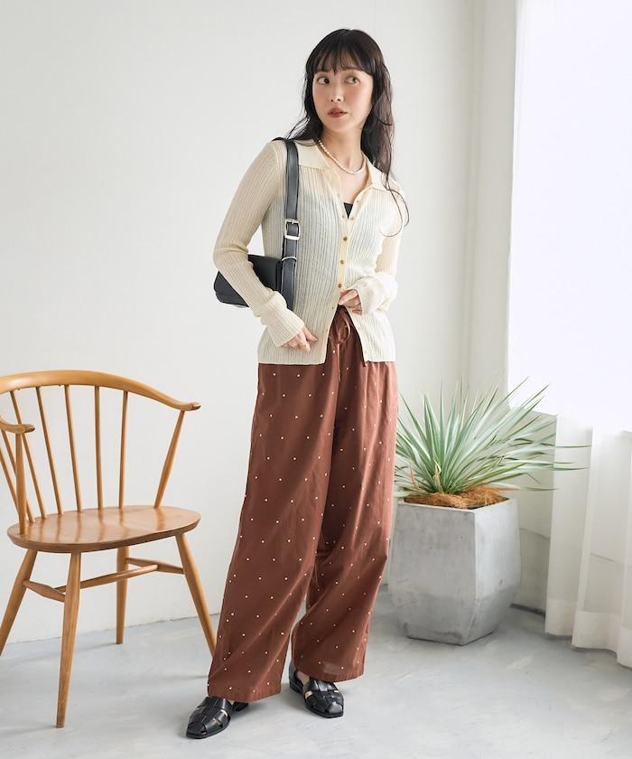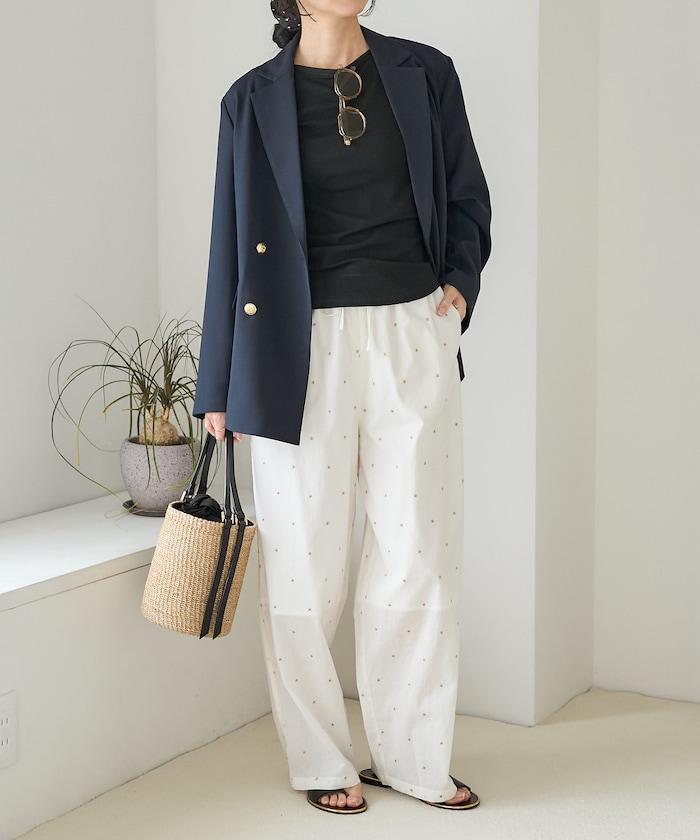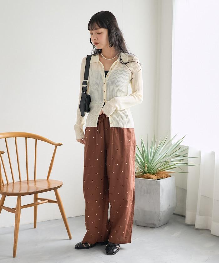 這款長褲採用淺色棉質面料,繡有蹩腳的線點,給人一種微妙的華麗感。