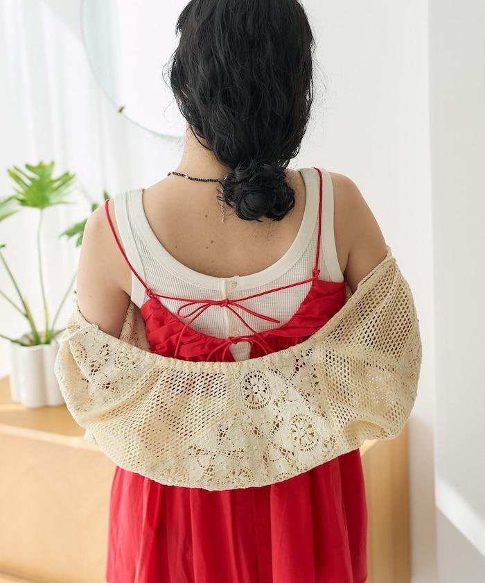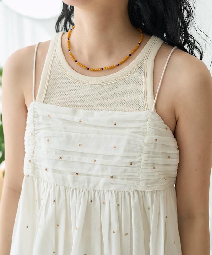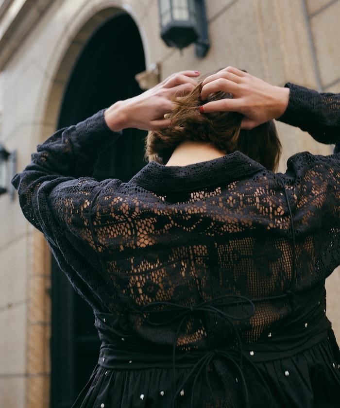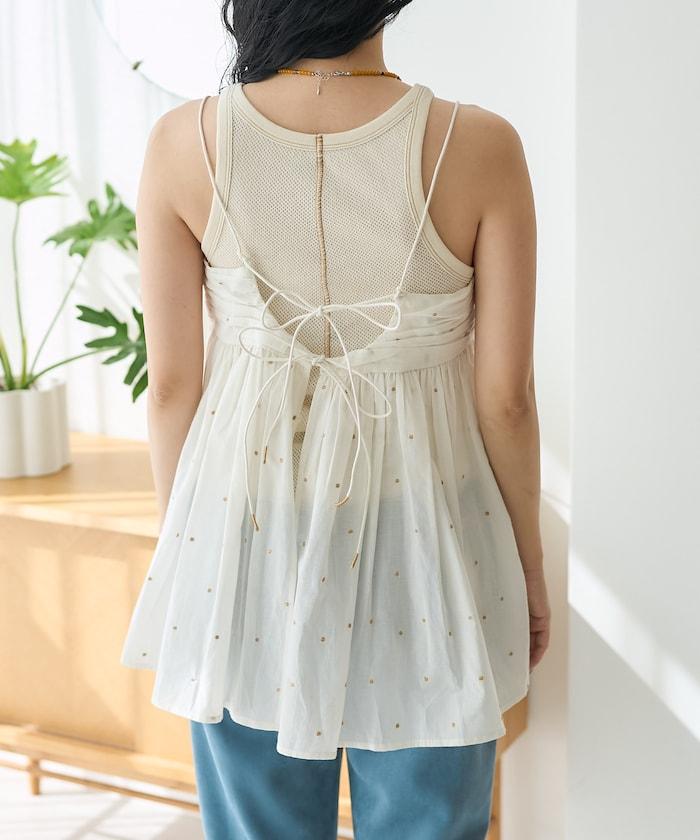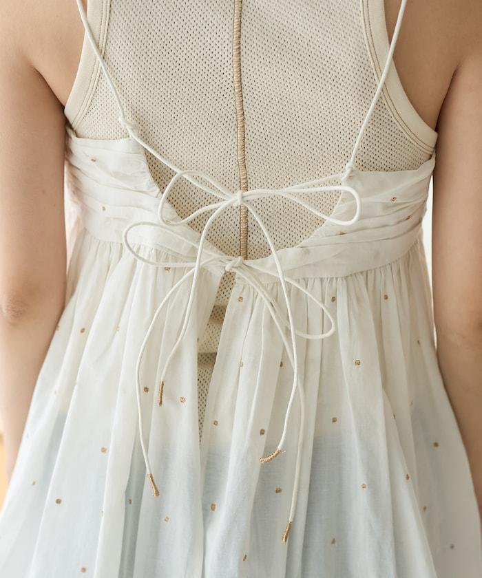 可調節肩帶和後背開口處的絲帶是用與印度產品相同的面料製成的圓繩。繩端纏繞的金銀線也是一個巧妙的點綴。