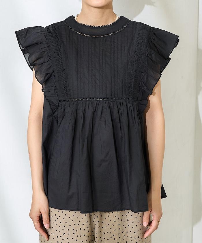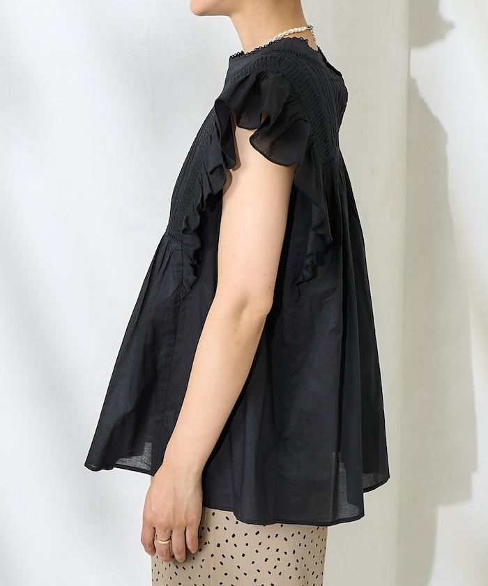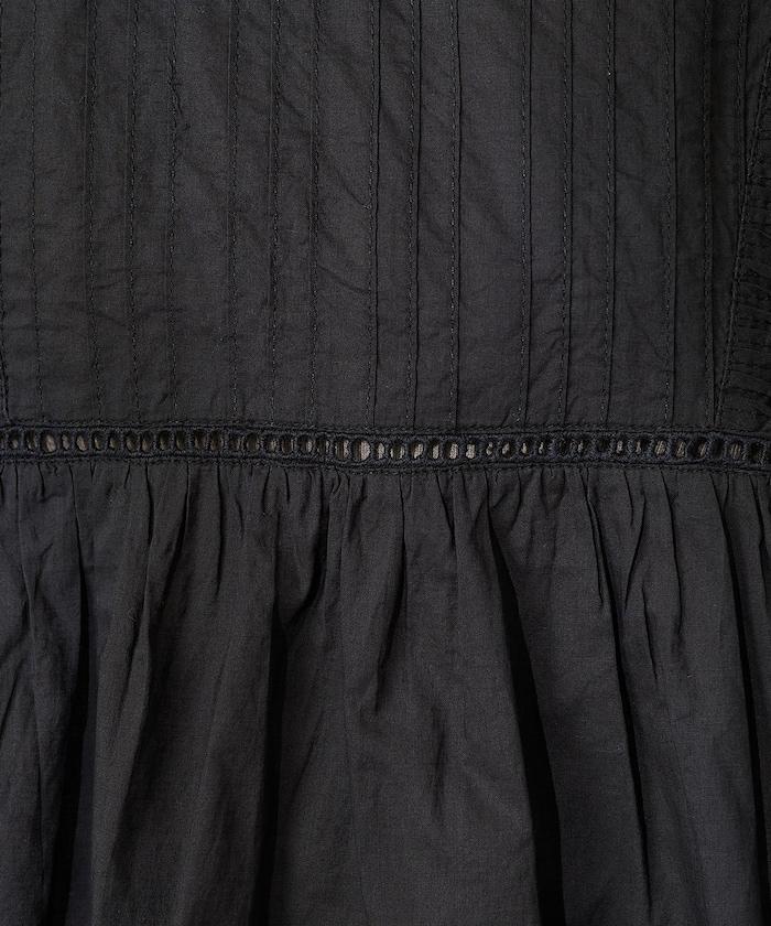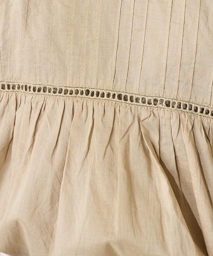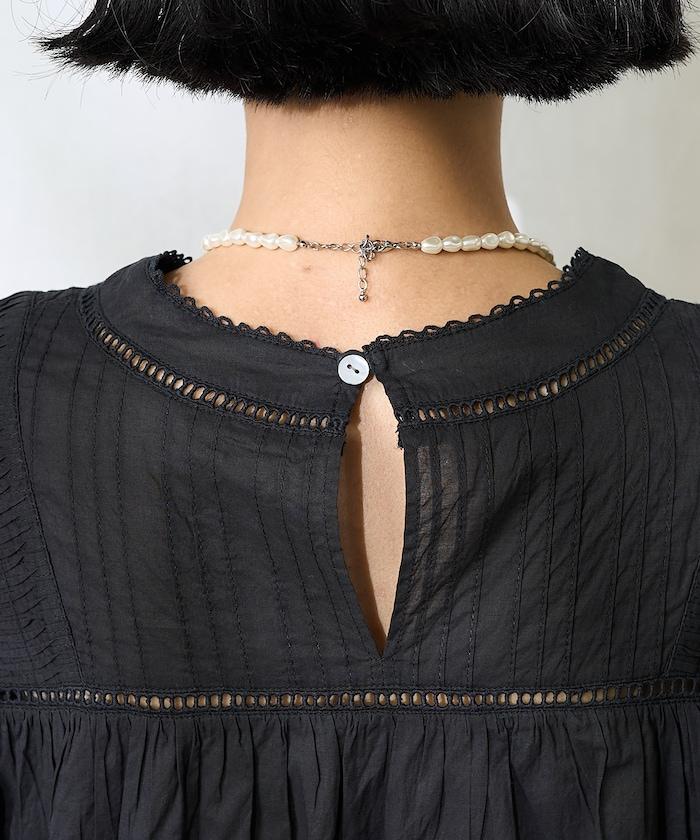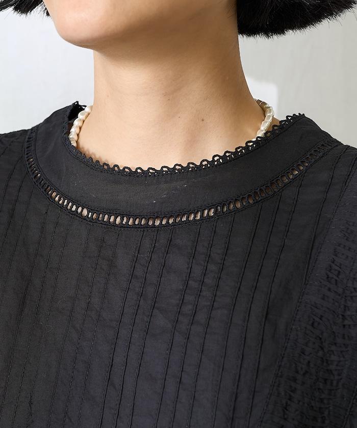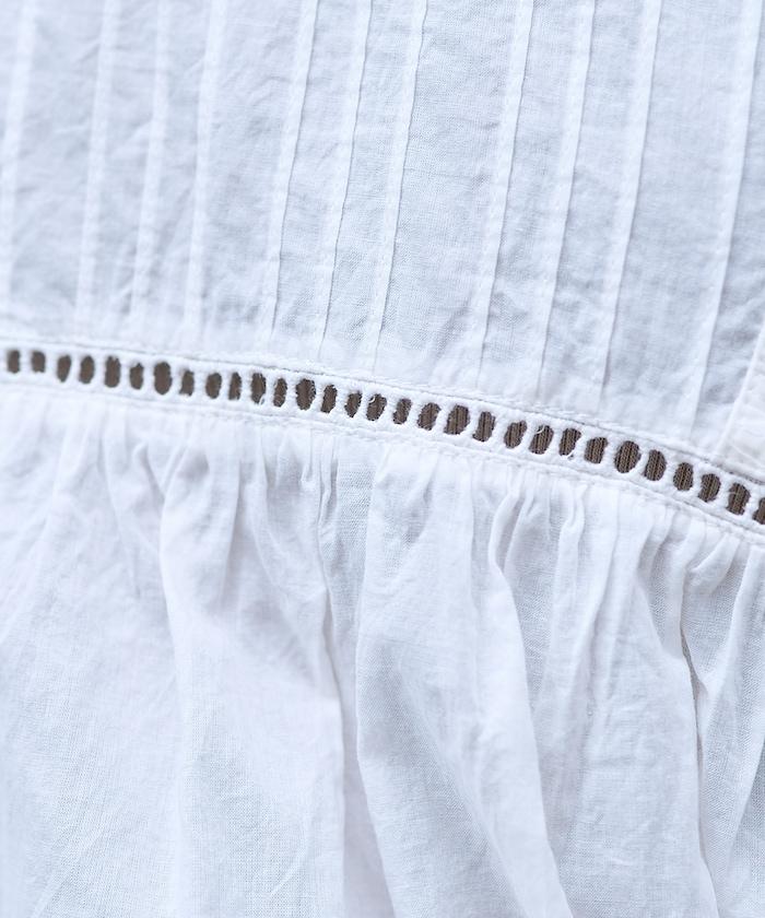 在精緻的面料和蕾絲上有大量細密針刺褶皺的上衣。