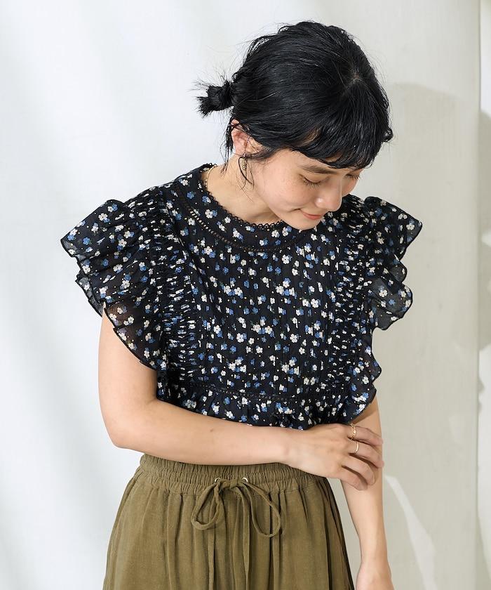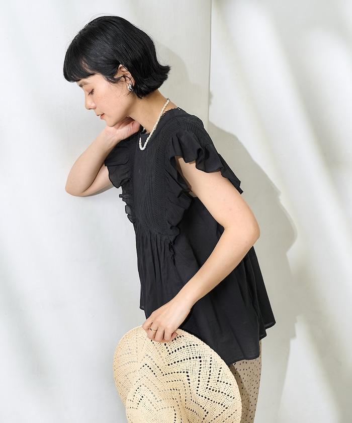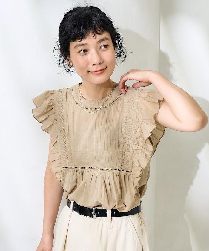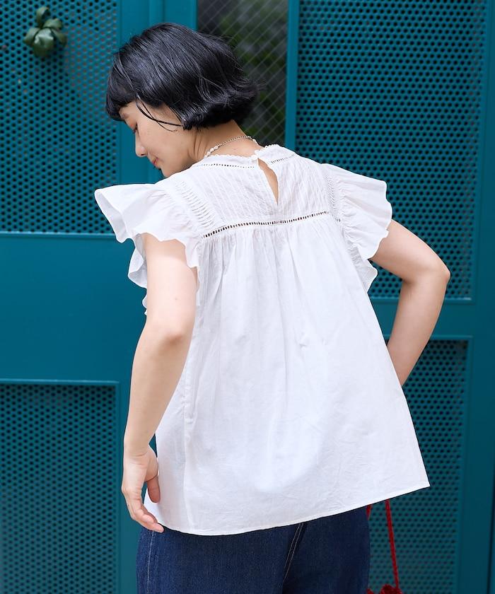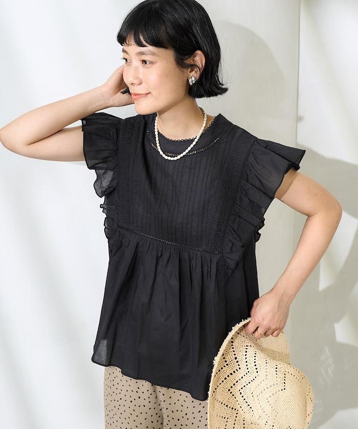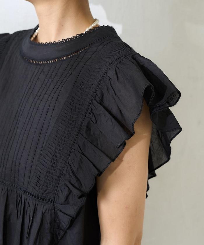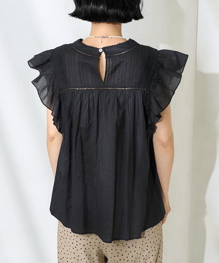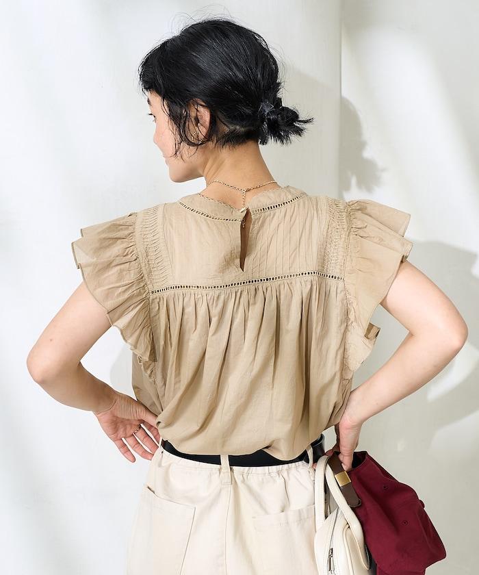 在精緻的面料和蕾絲上有大量細密針刺褶皺的上衣。