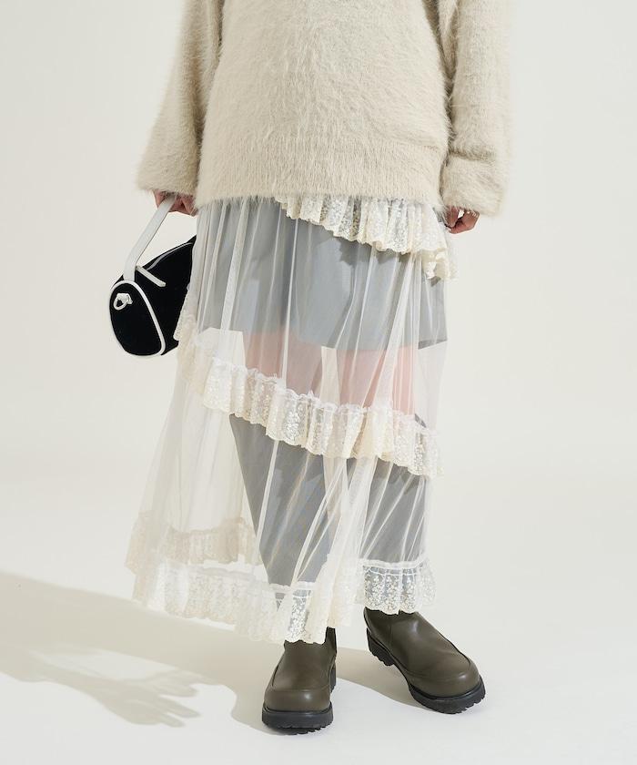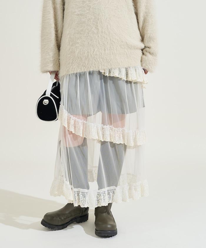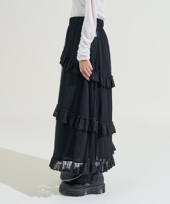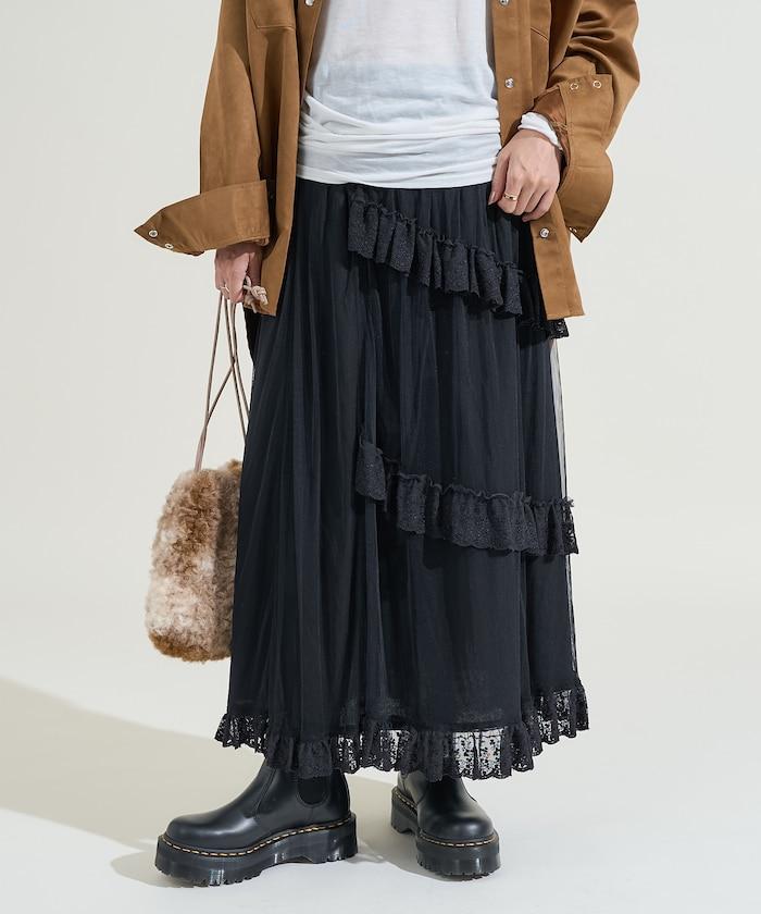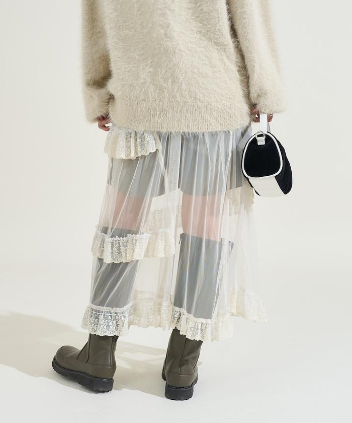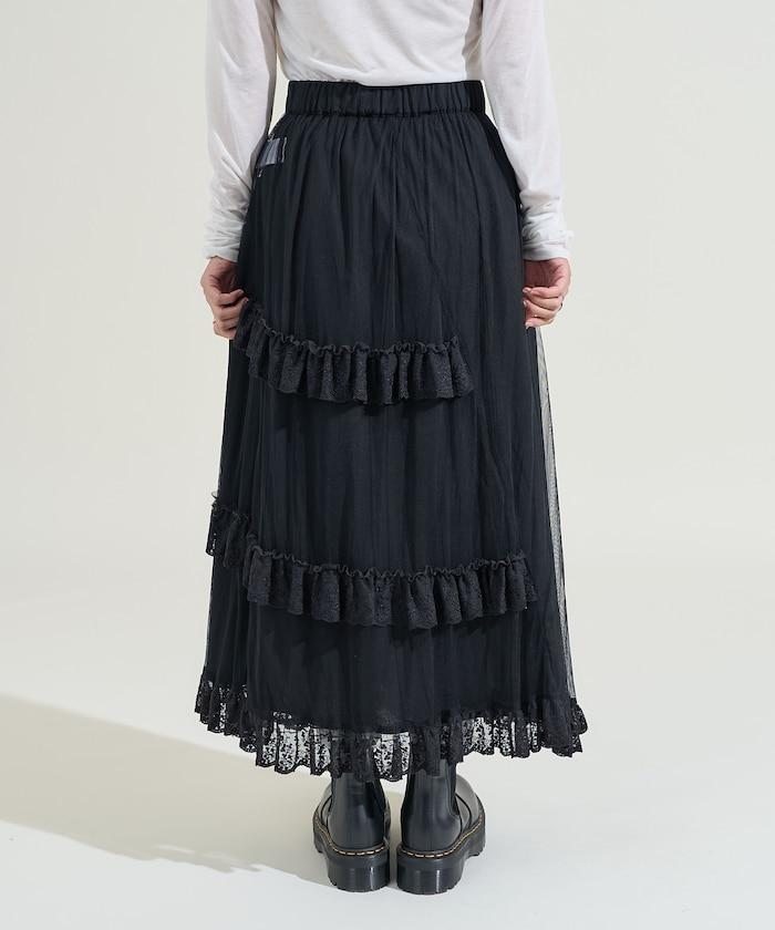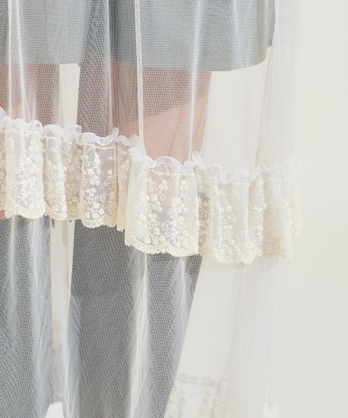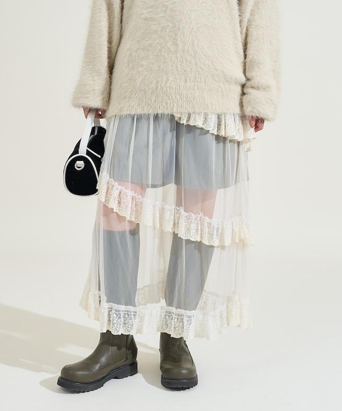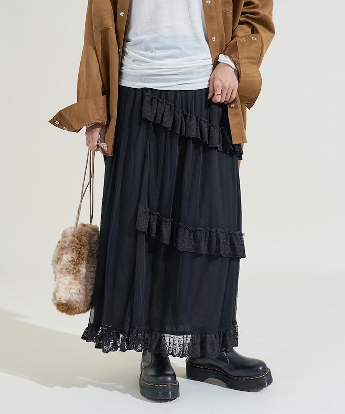 不對稱蕾絲薄紗裙。