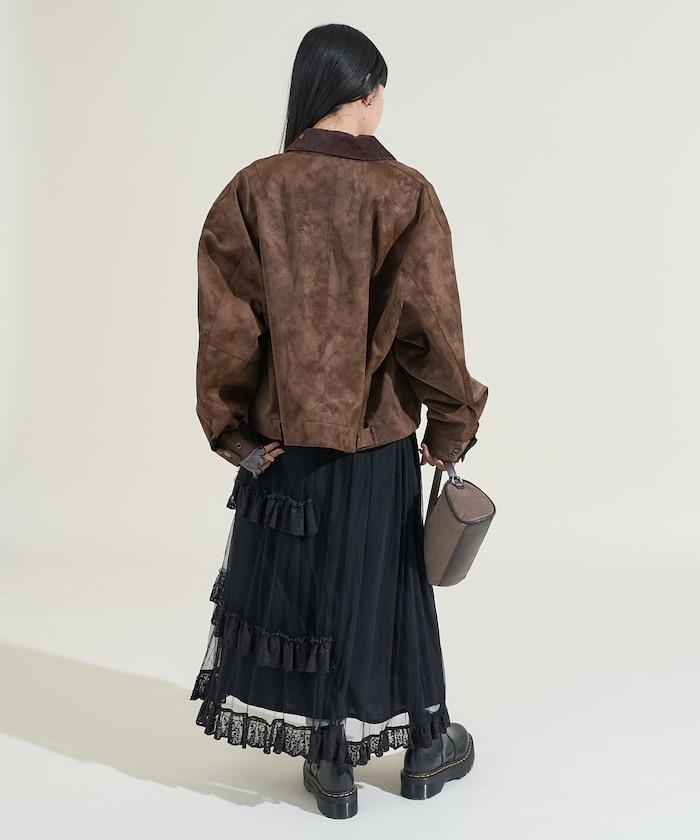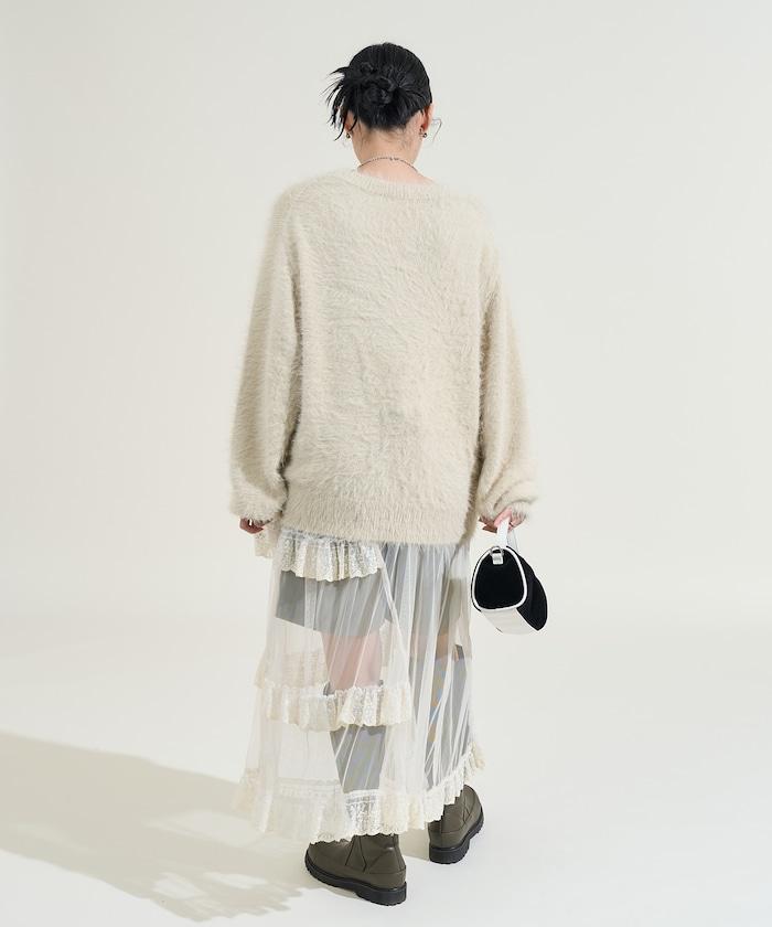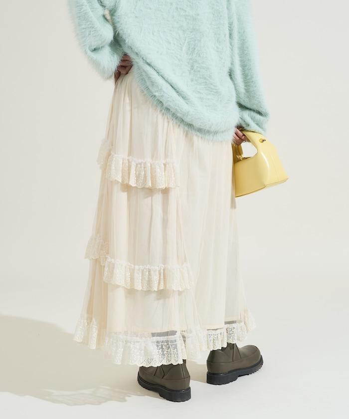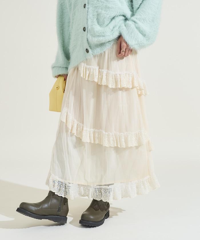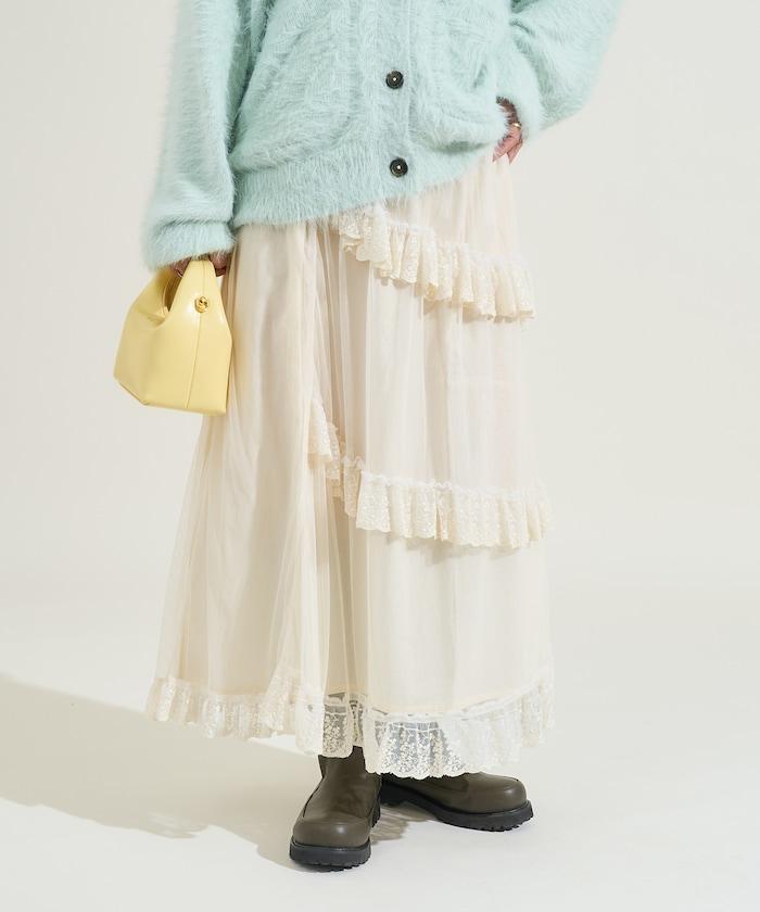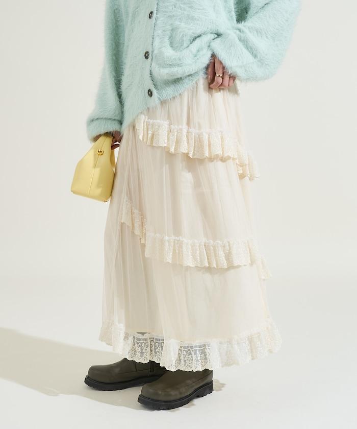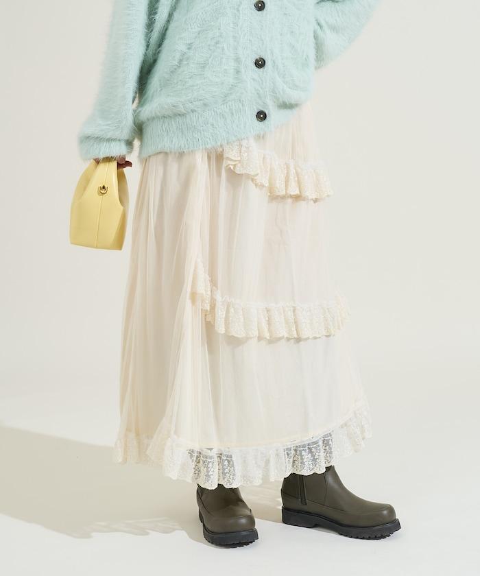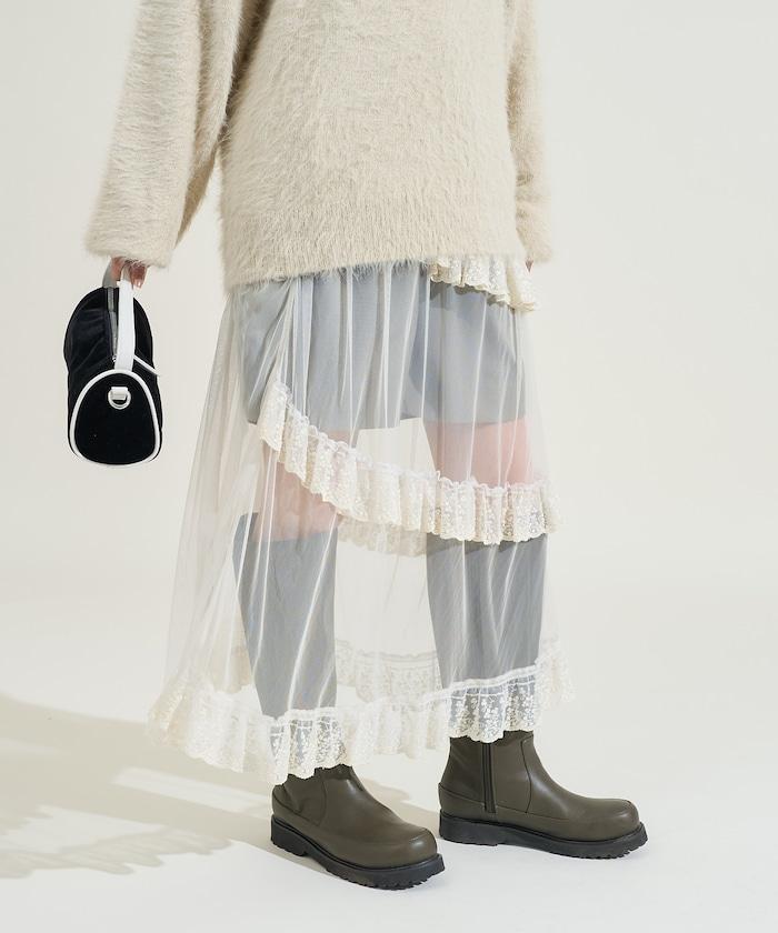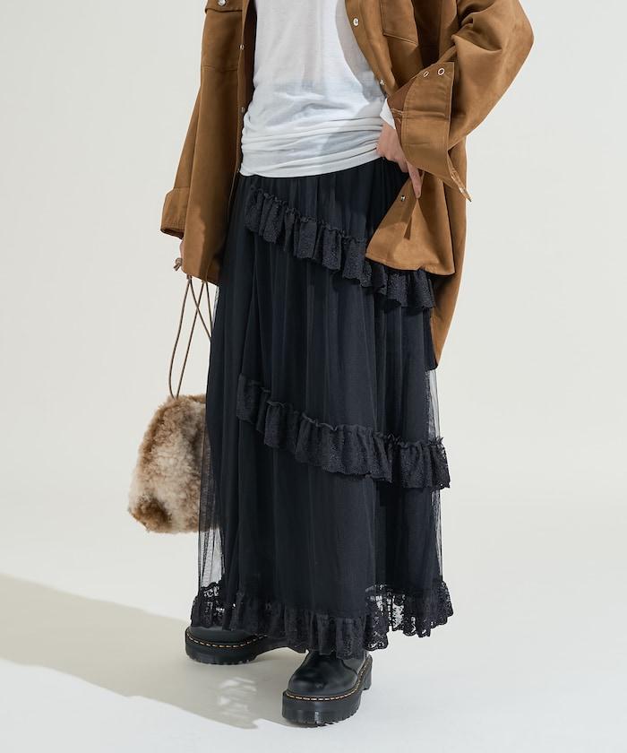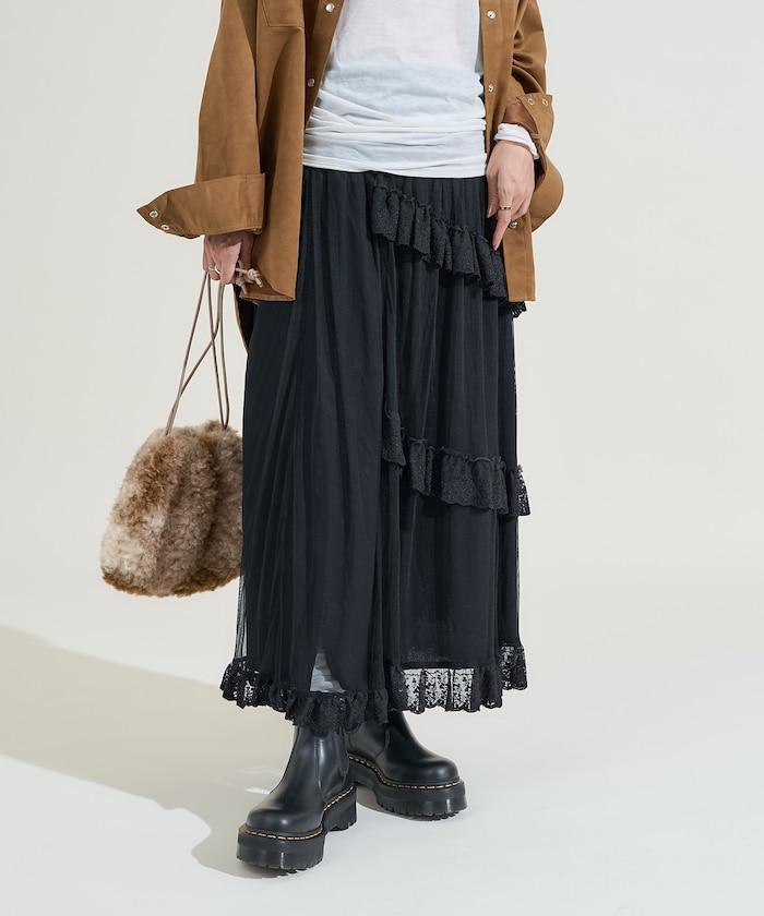 不對稱蕾絲薄紗裙。