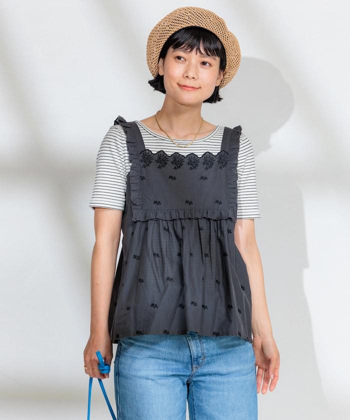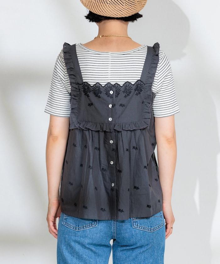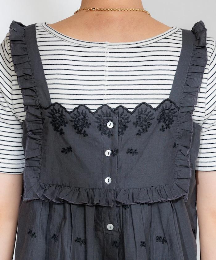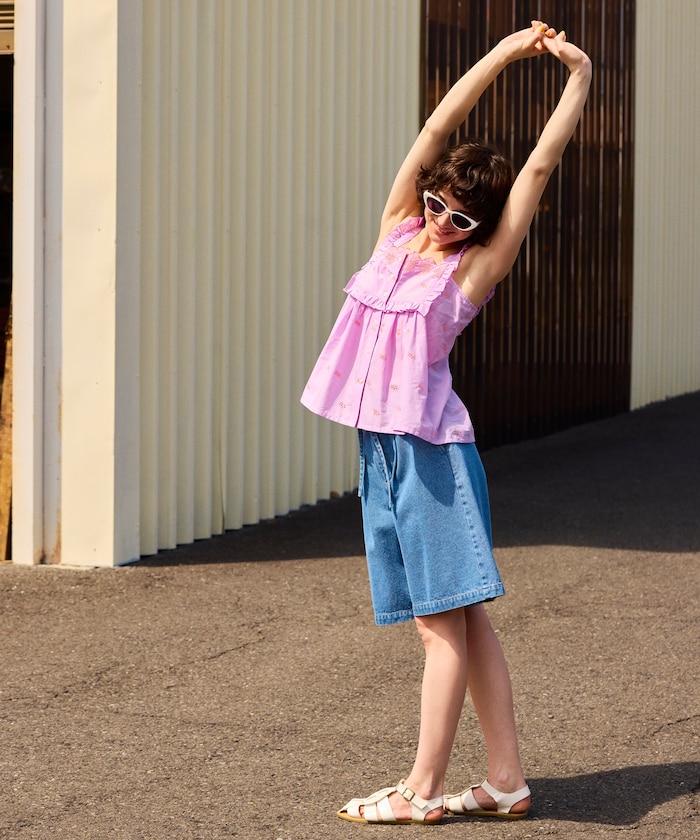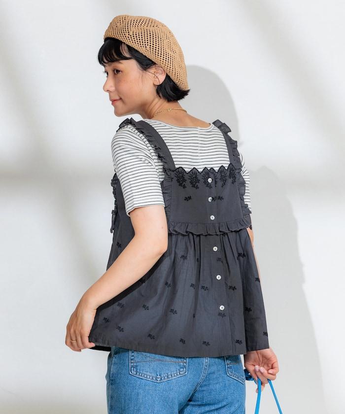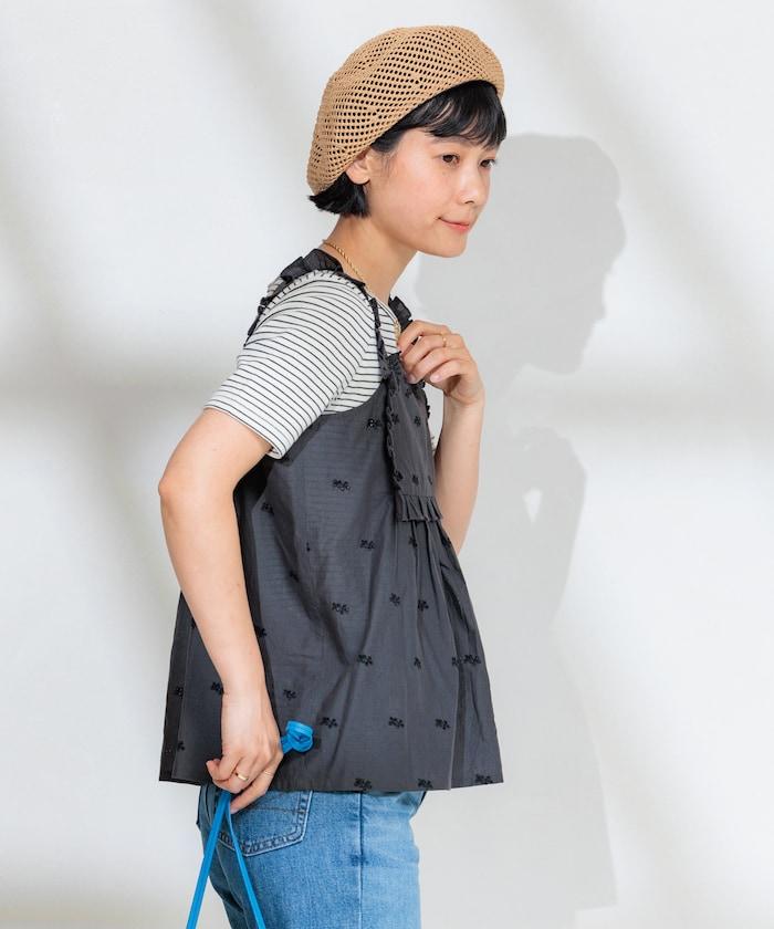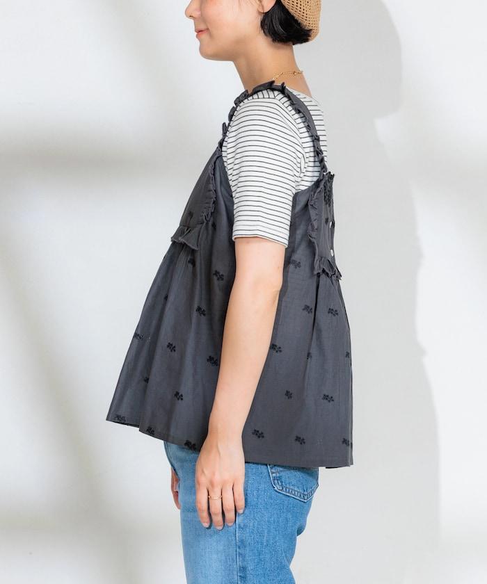 這款吊帶衫採用 Shifuri 刺繡和荷葉邊設計,彰顯女性魅力。
