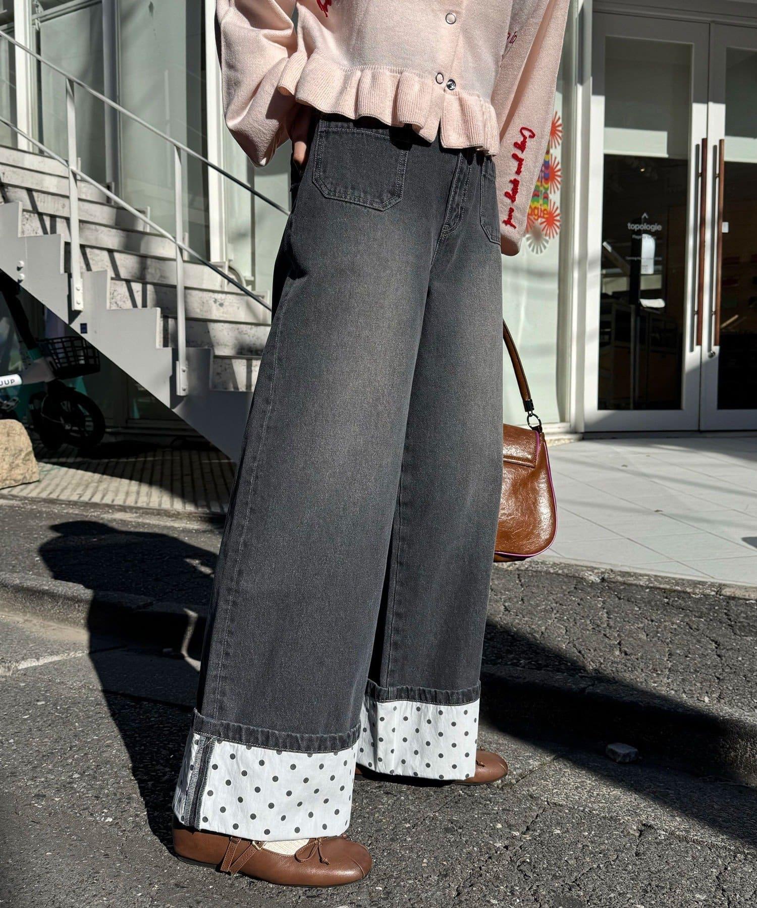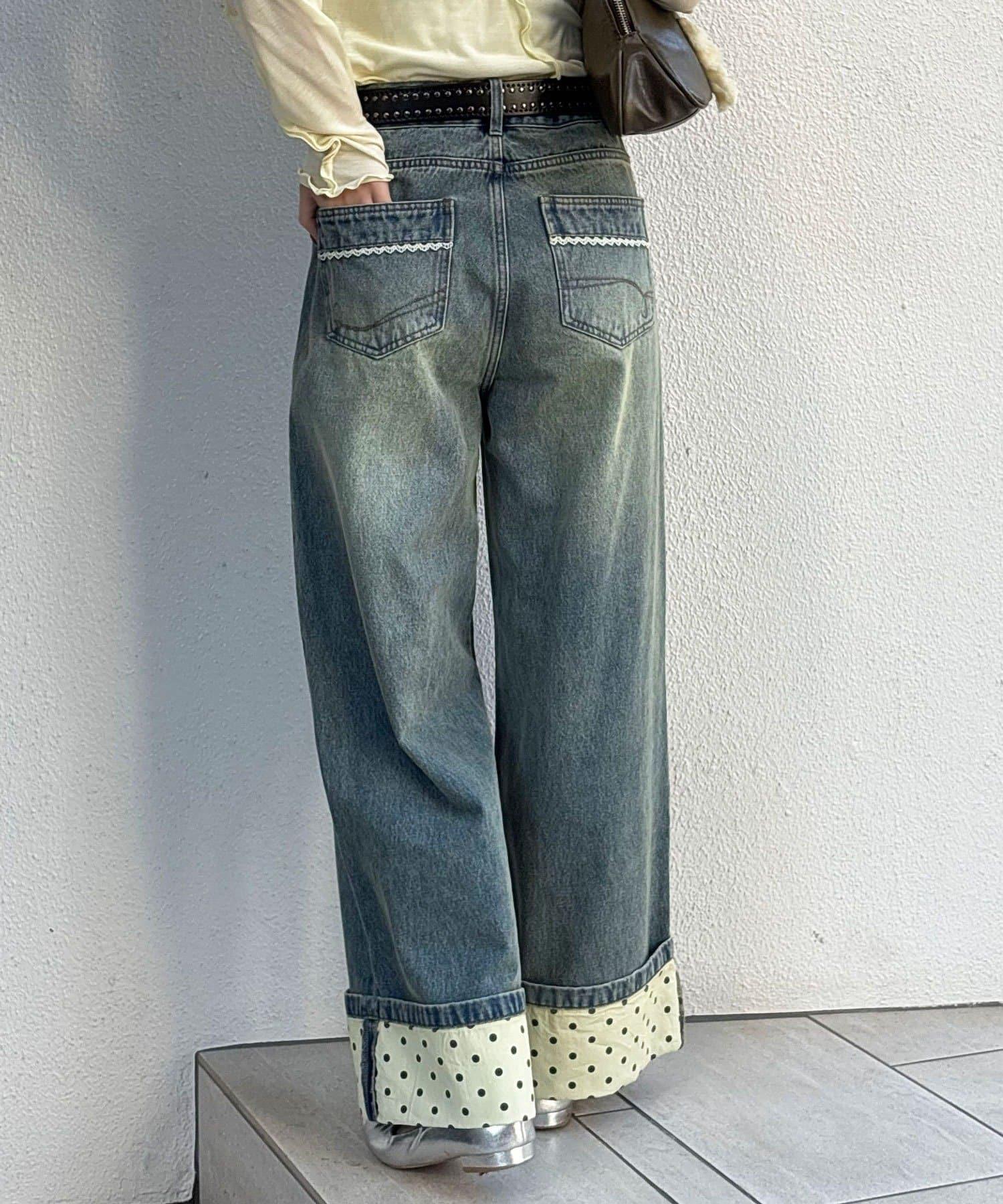 卷邊波點闊腿牛仔褲