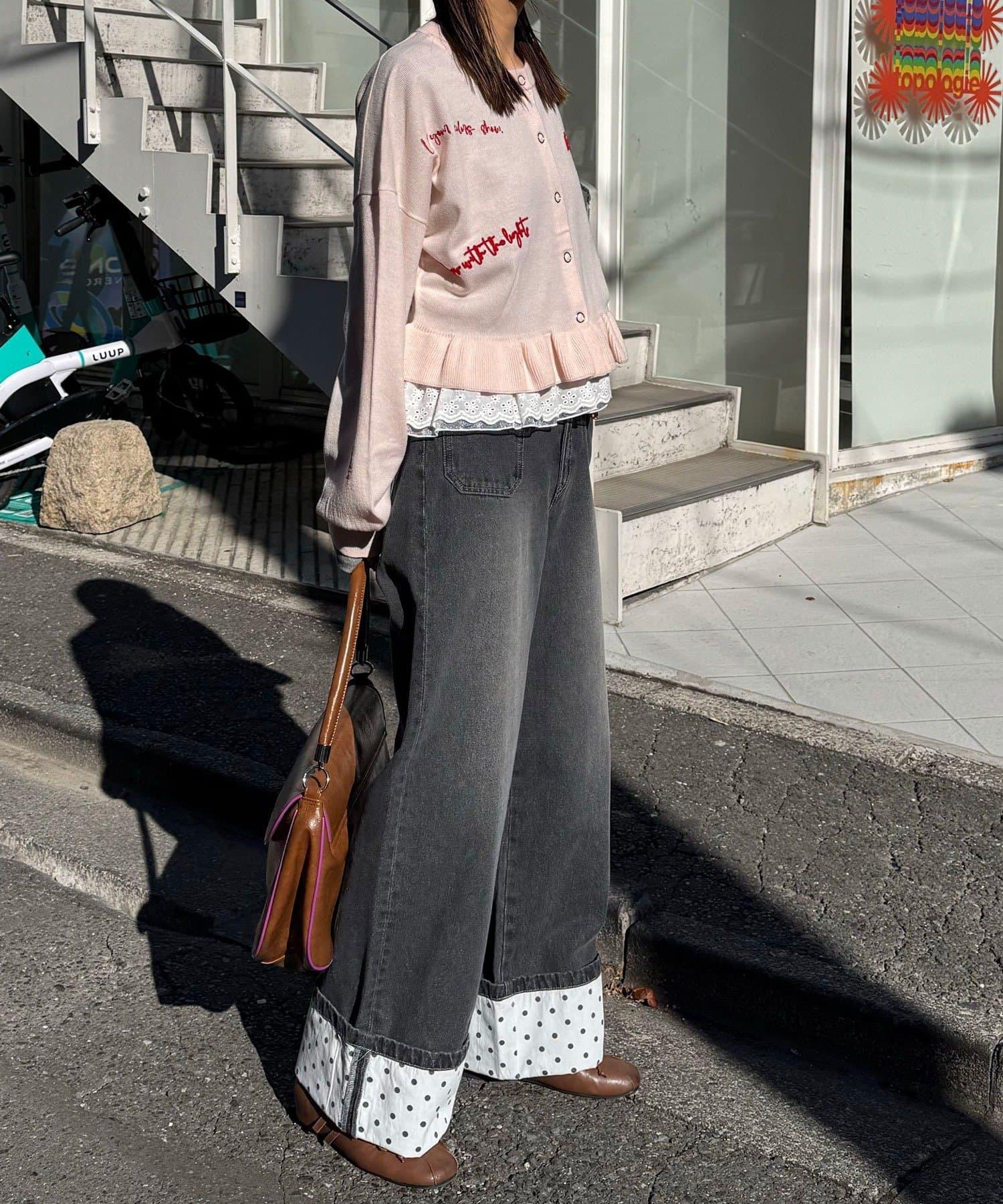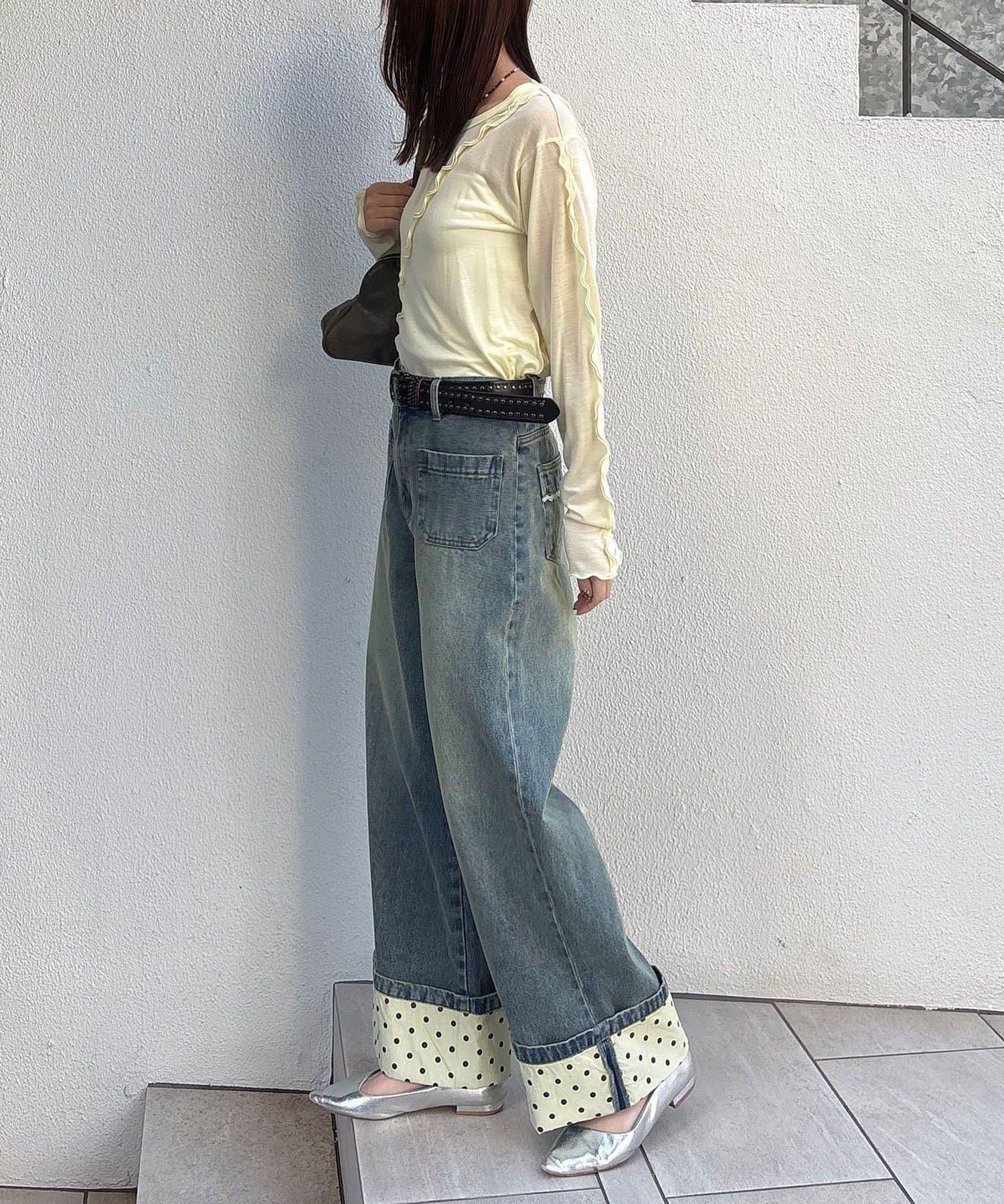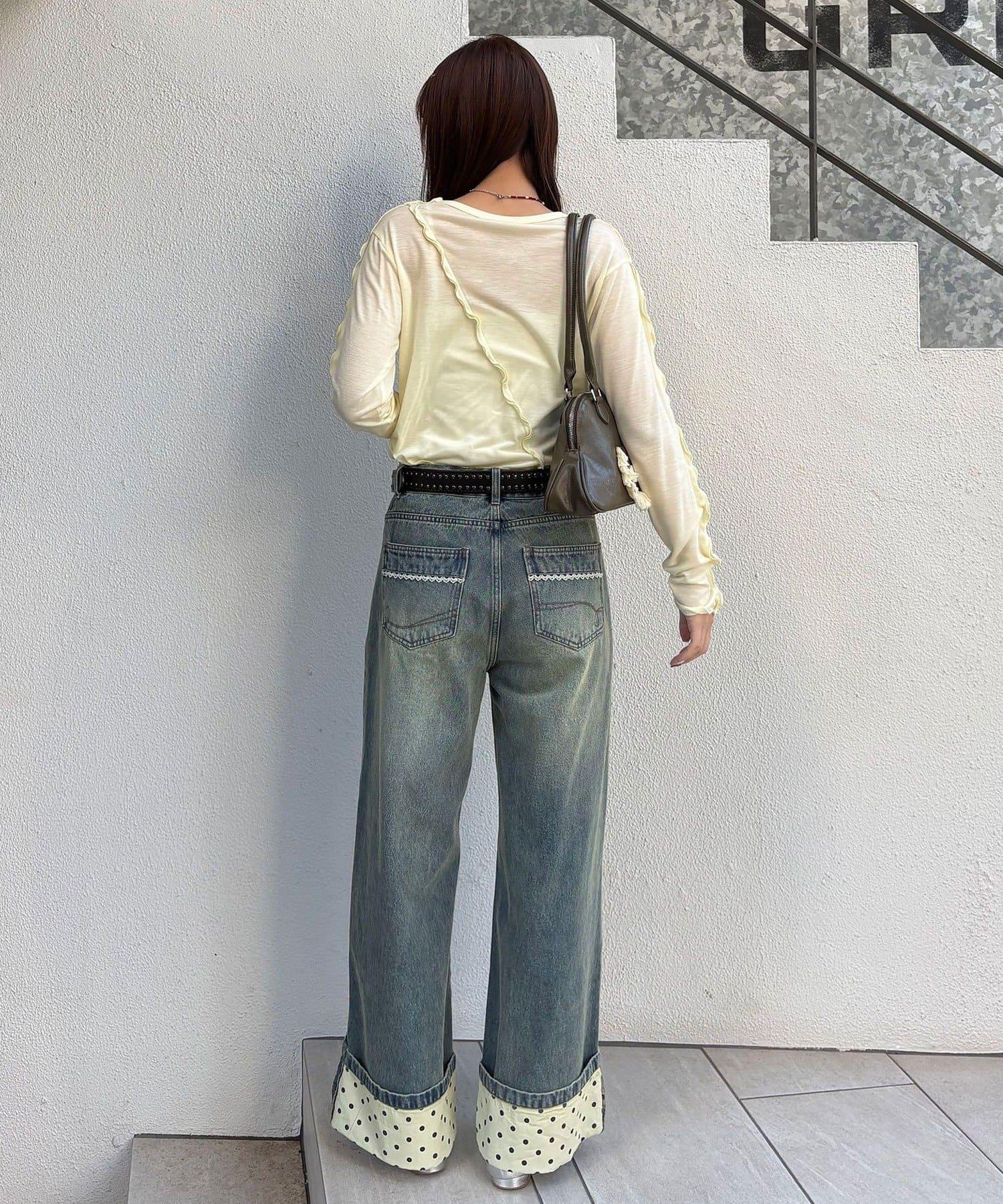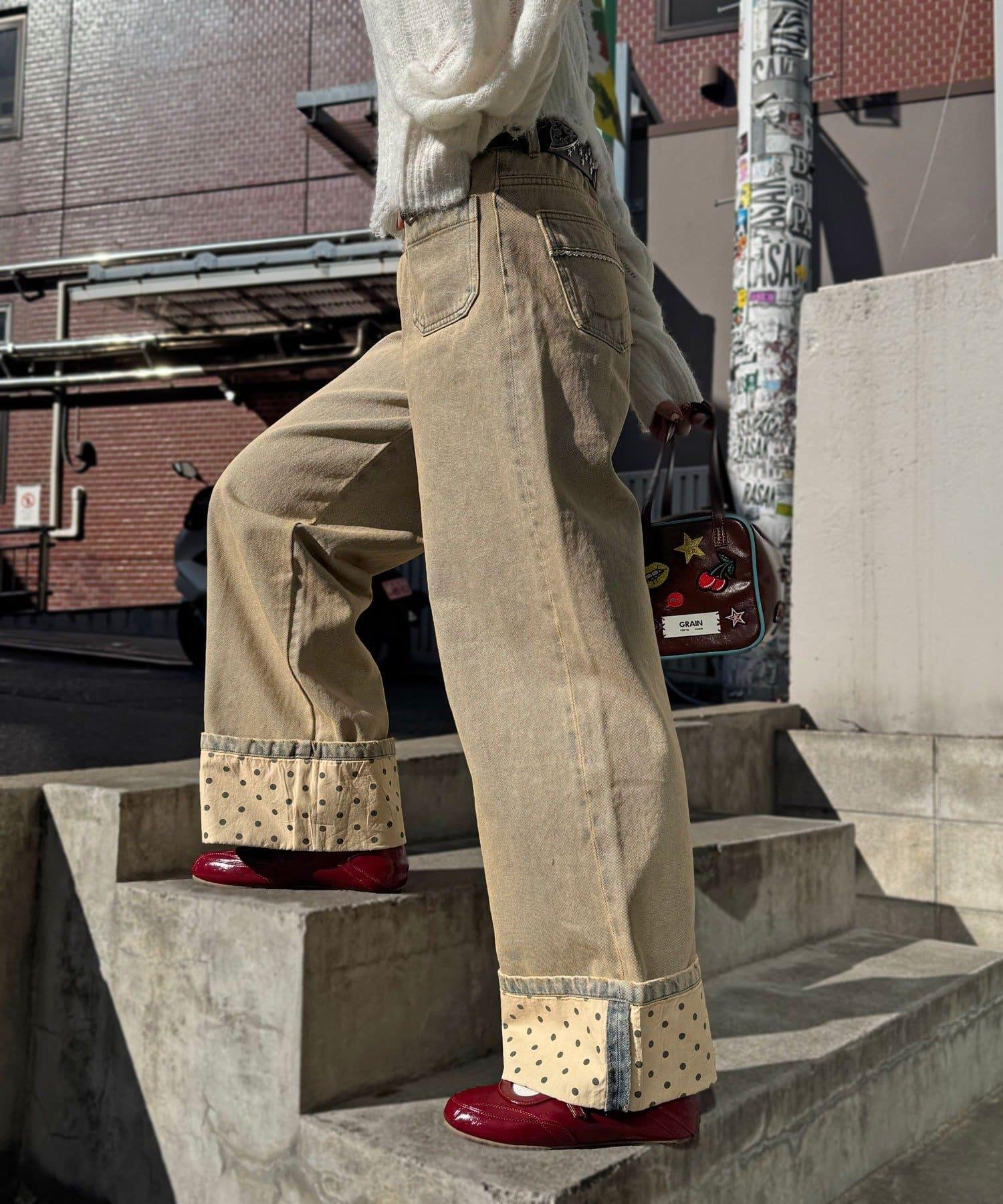 寬大的牛仔長褲,捲起的下襬露出醒目的圓點圖案。