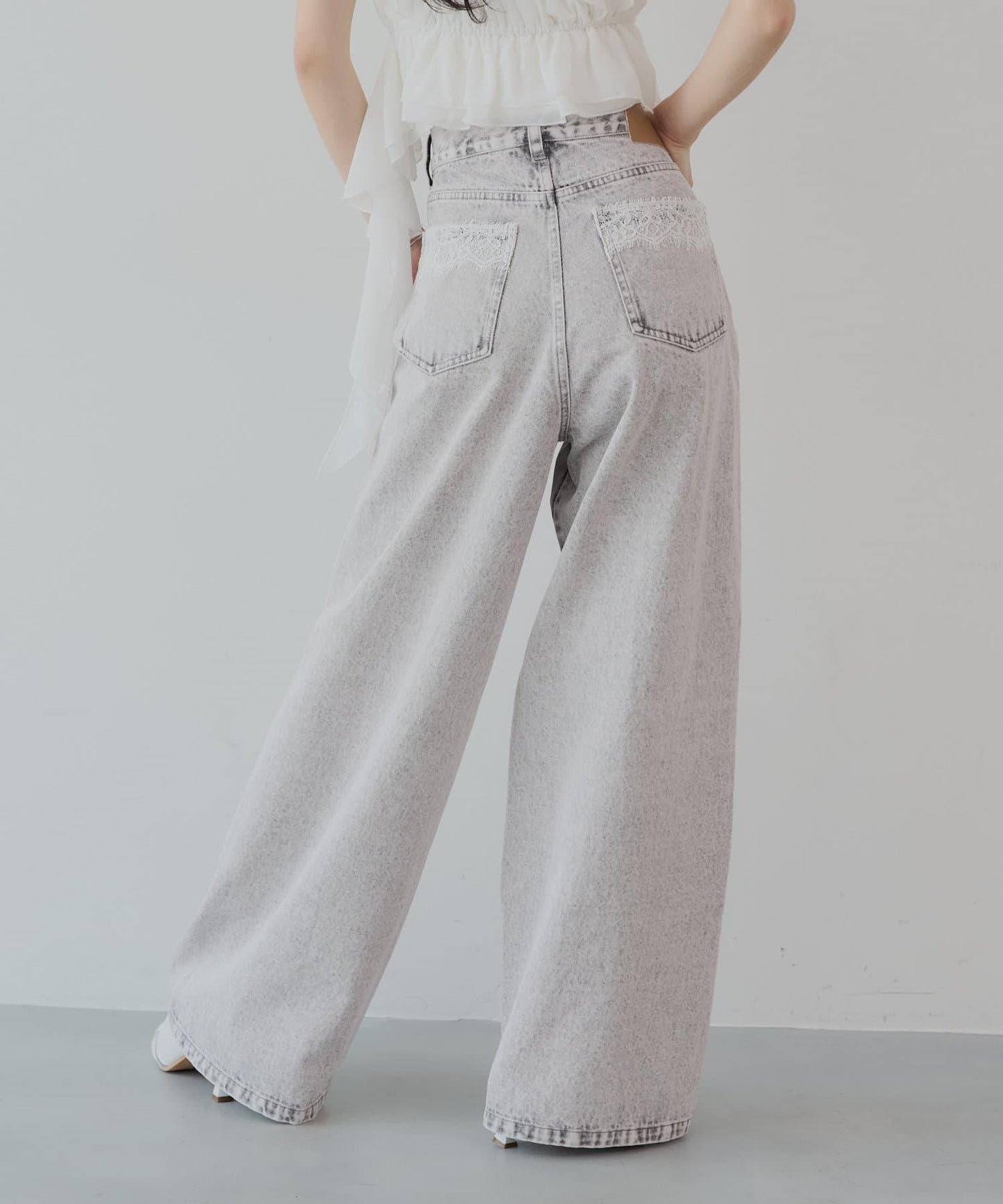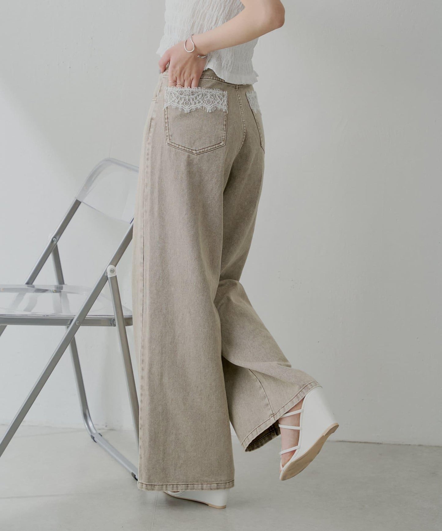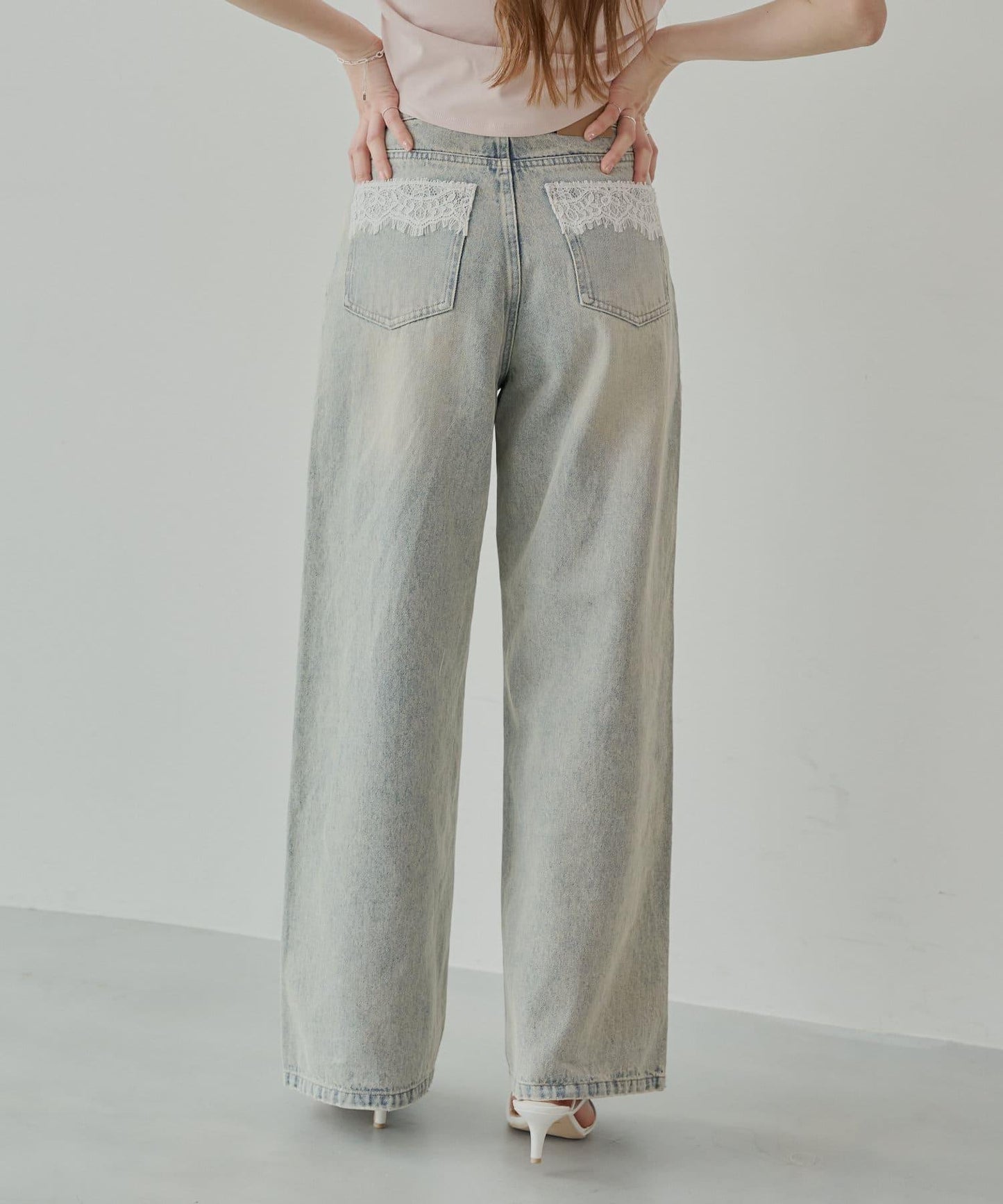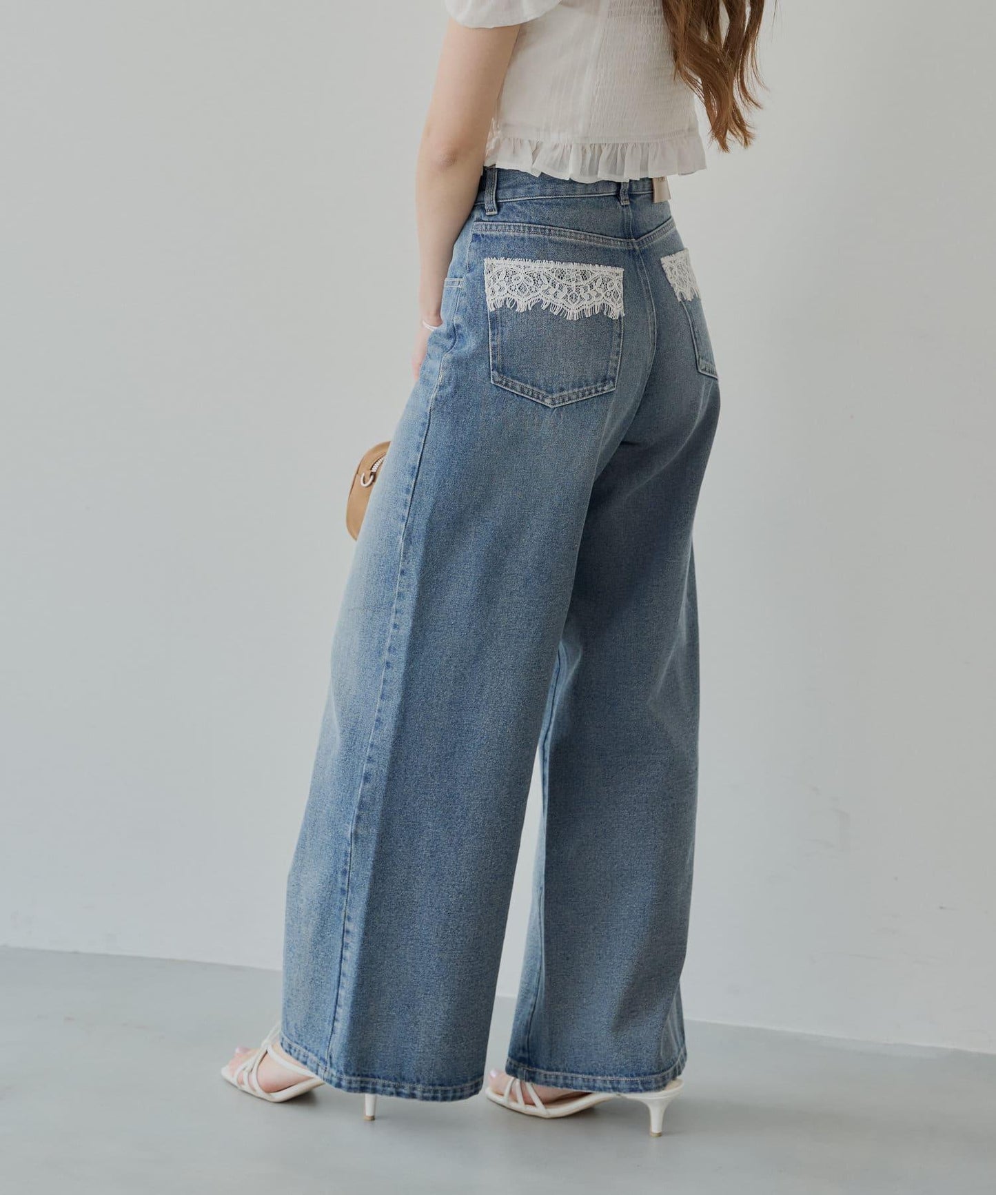 後口袋上的蕾絲花邊增添了微妙的點睛之筆,使休閒牛仔款式更顯優雅。