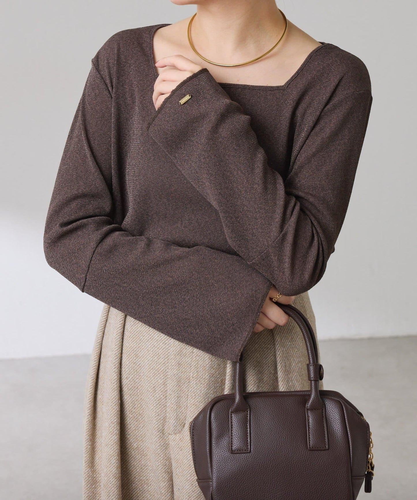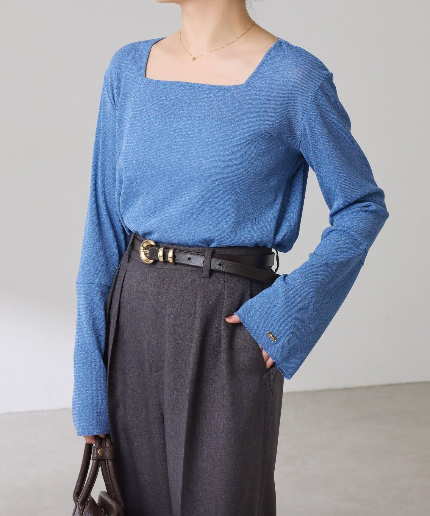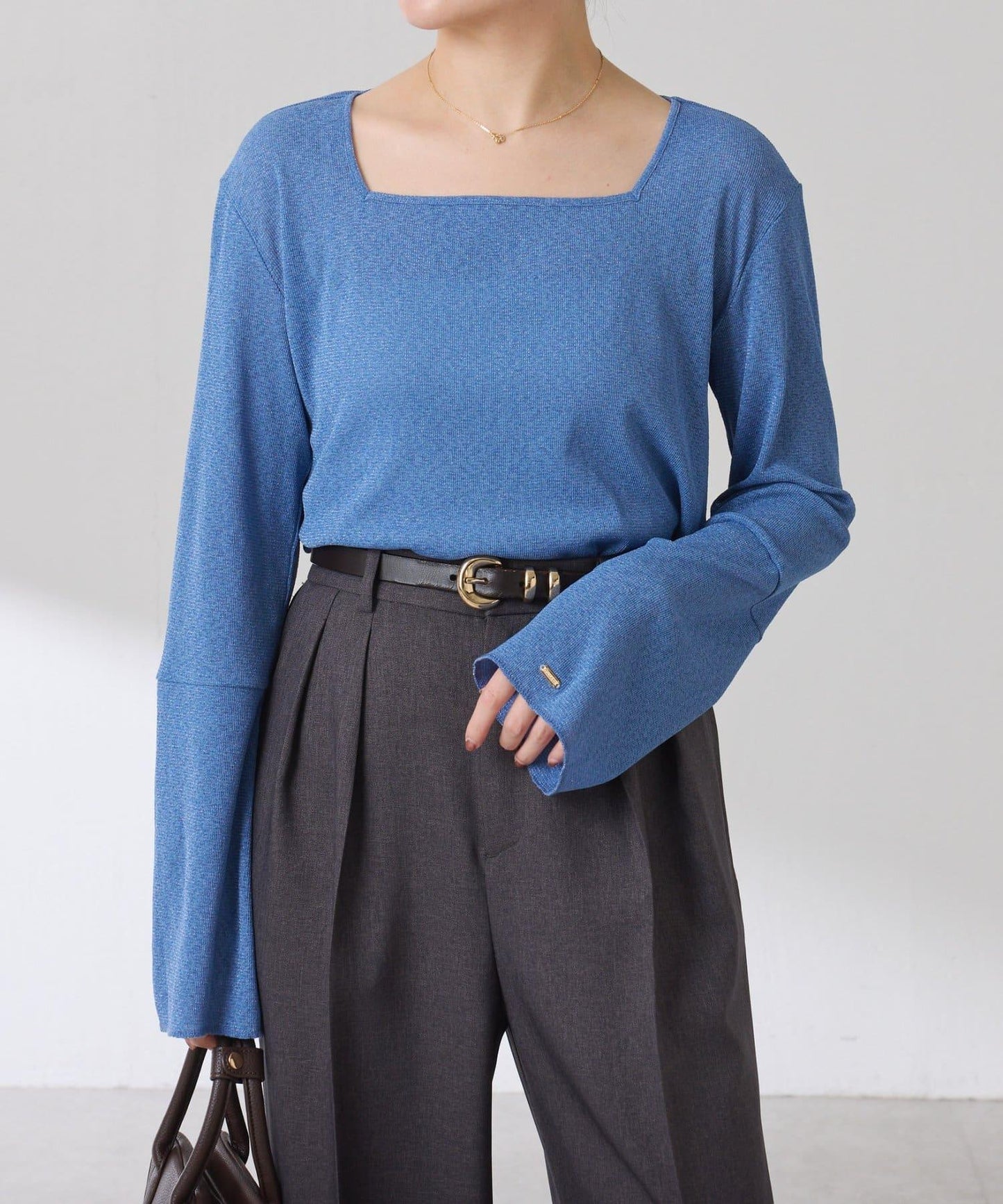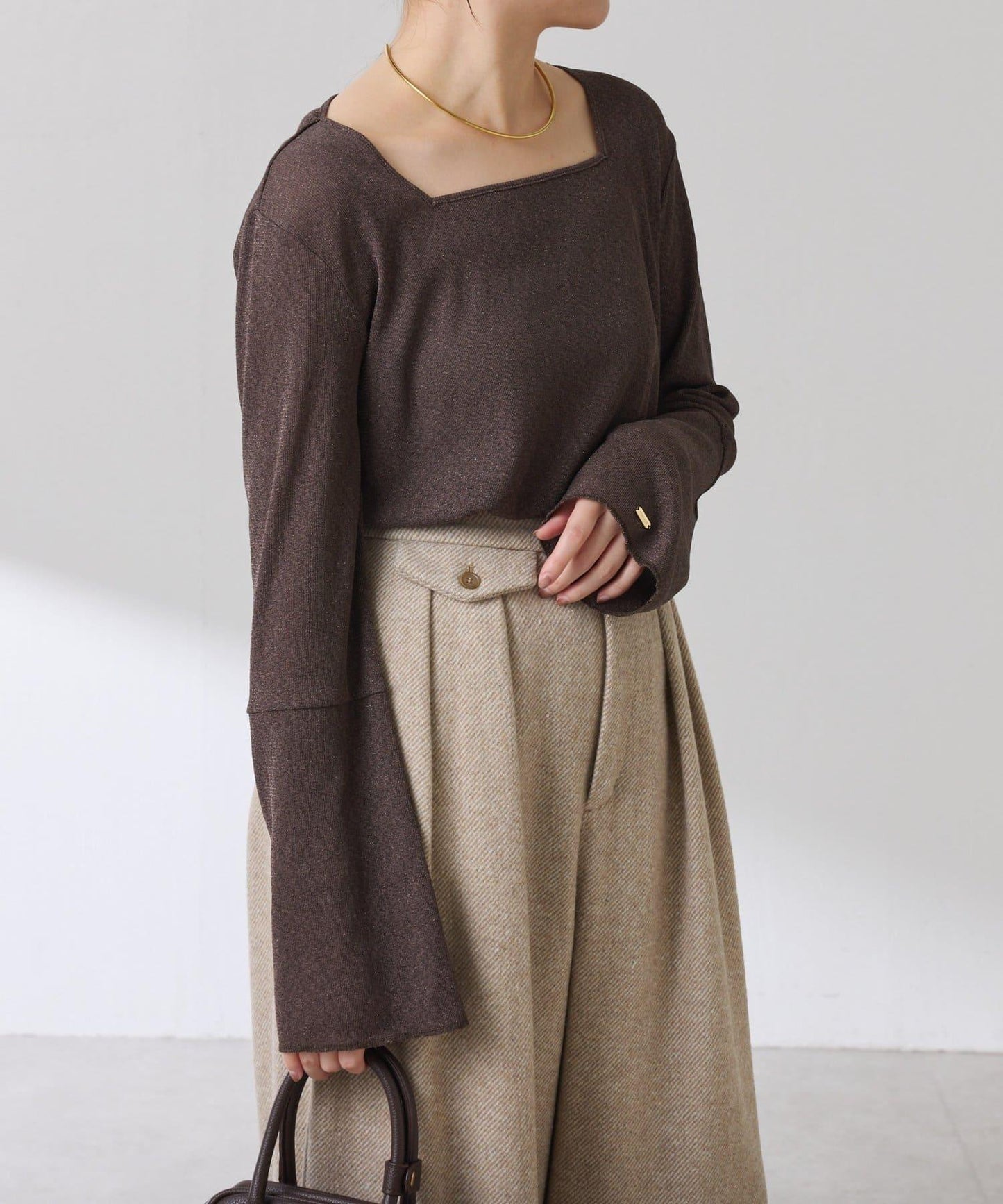 袖子採用長喇叭袖設計,與針織衫疊穿時可從袖口露出。