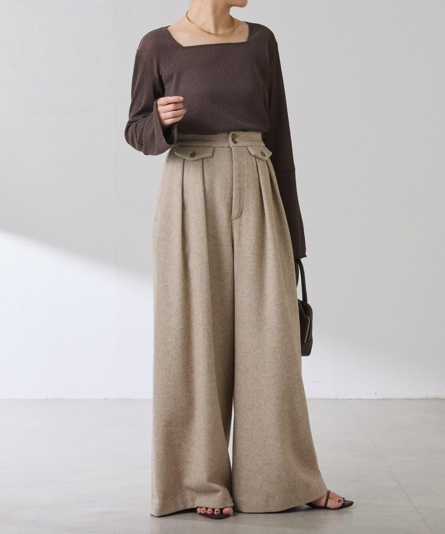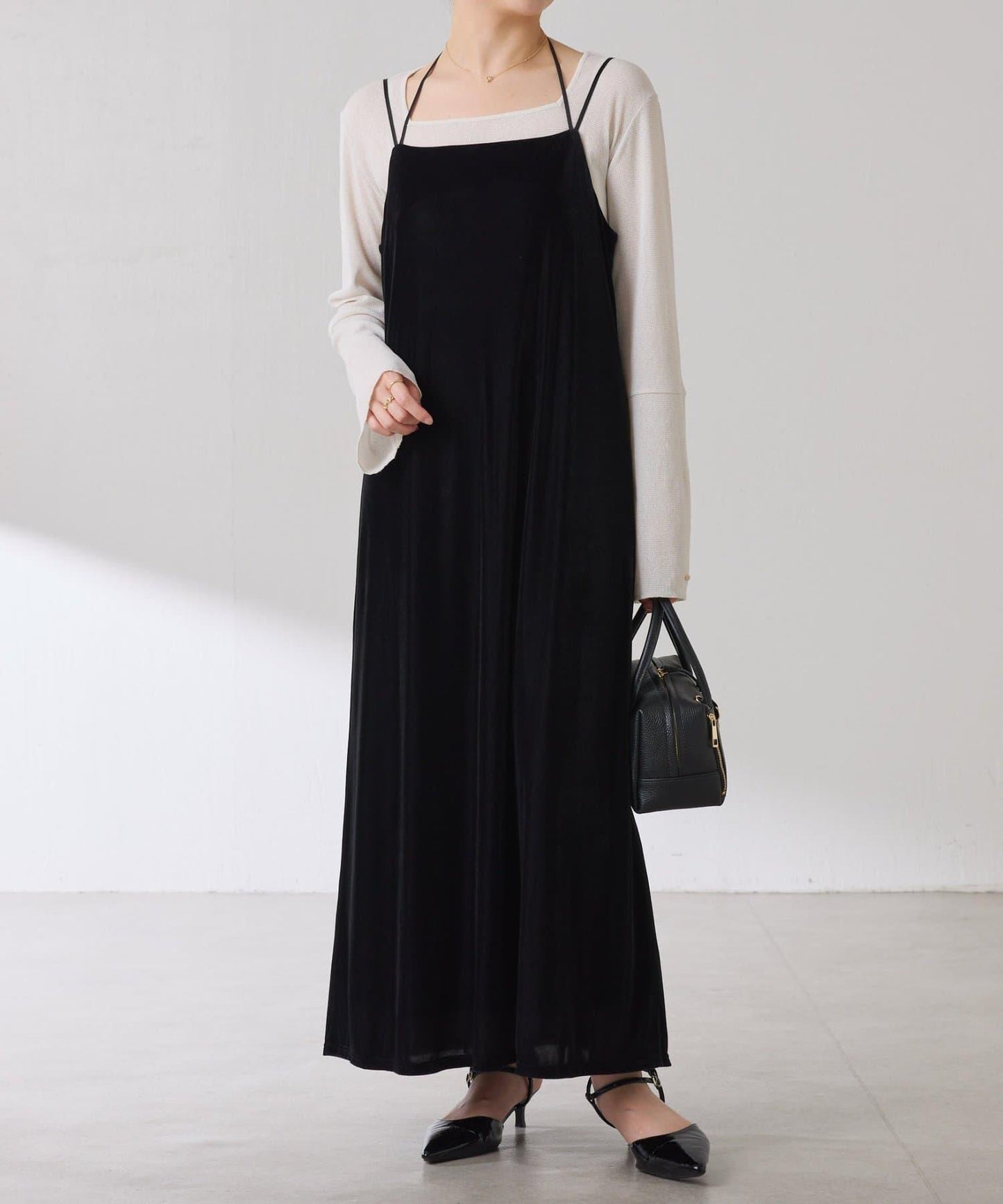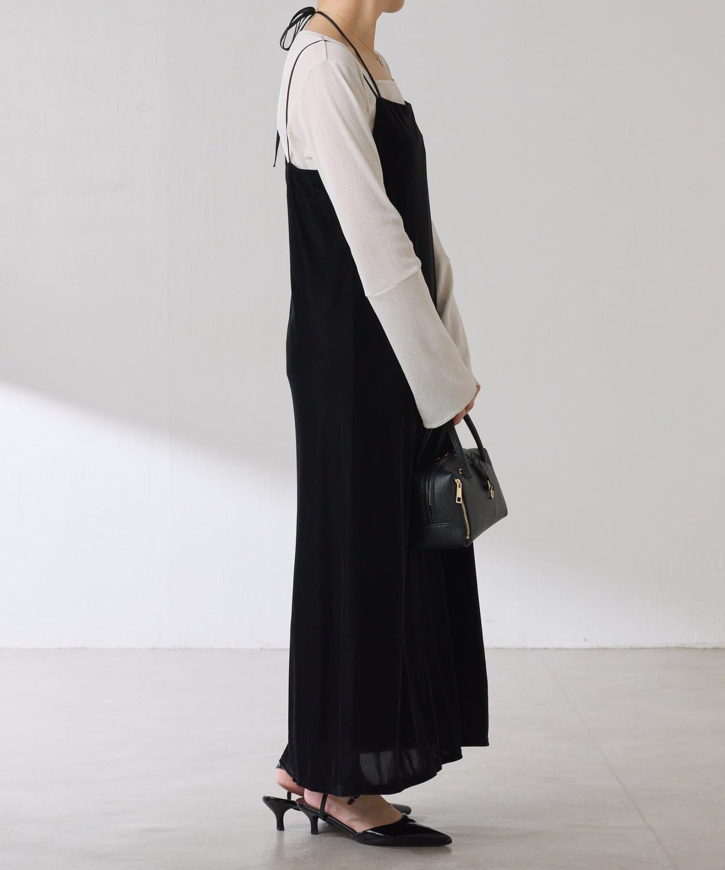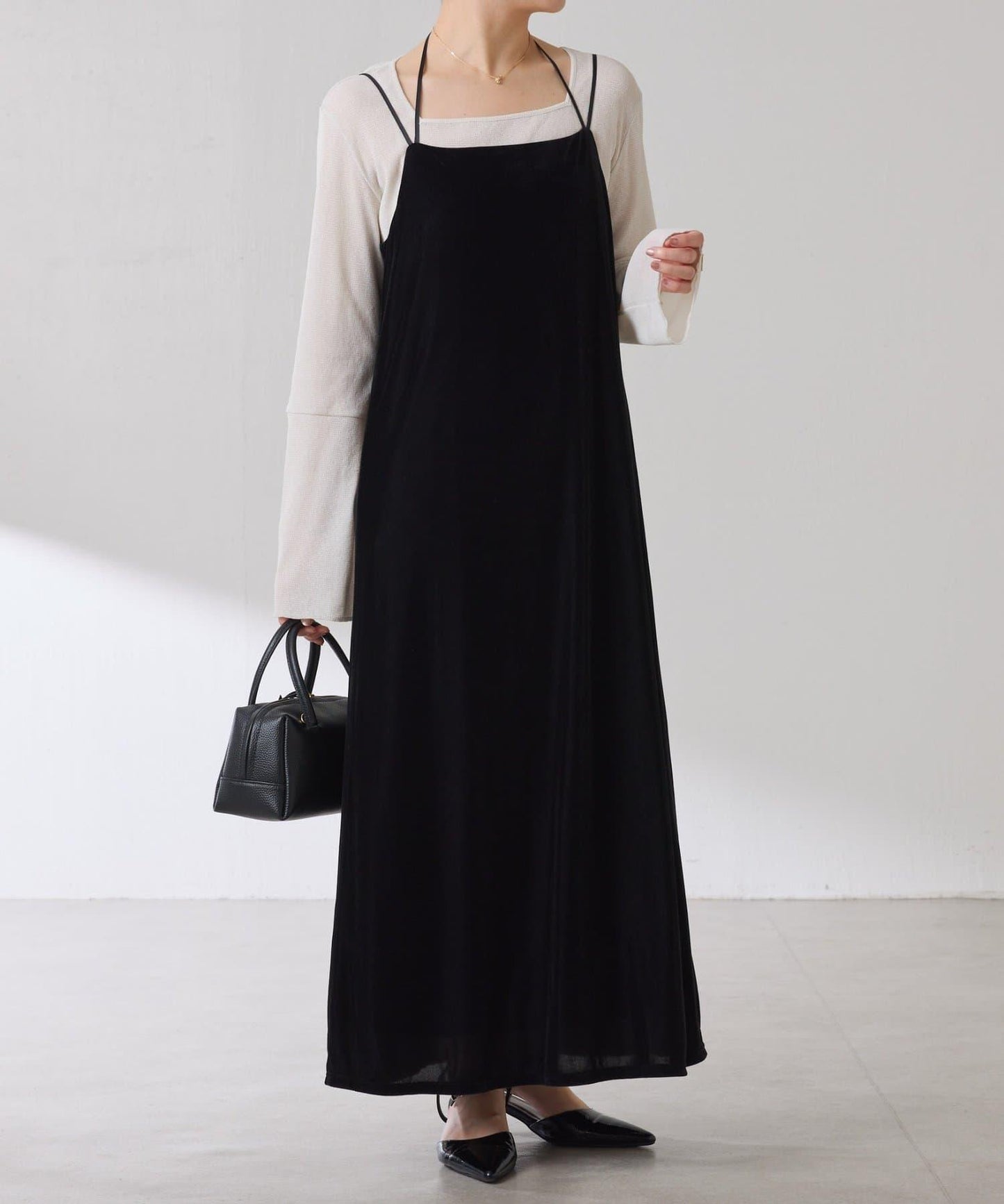 袖子採用長喇叭袖設計,與針織衫疊穿時可從袖口露出。