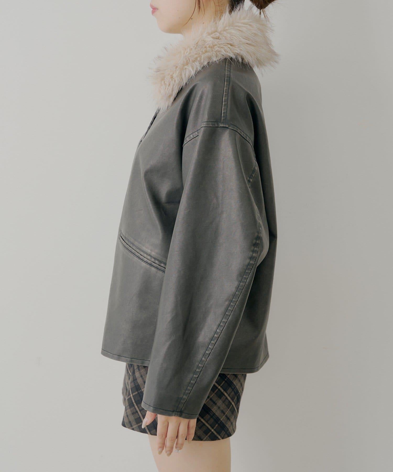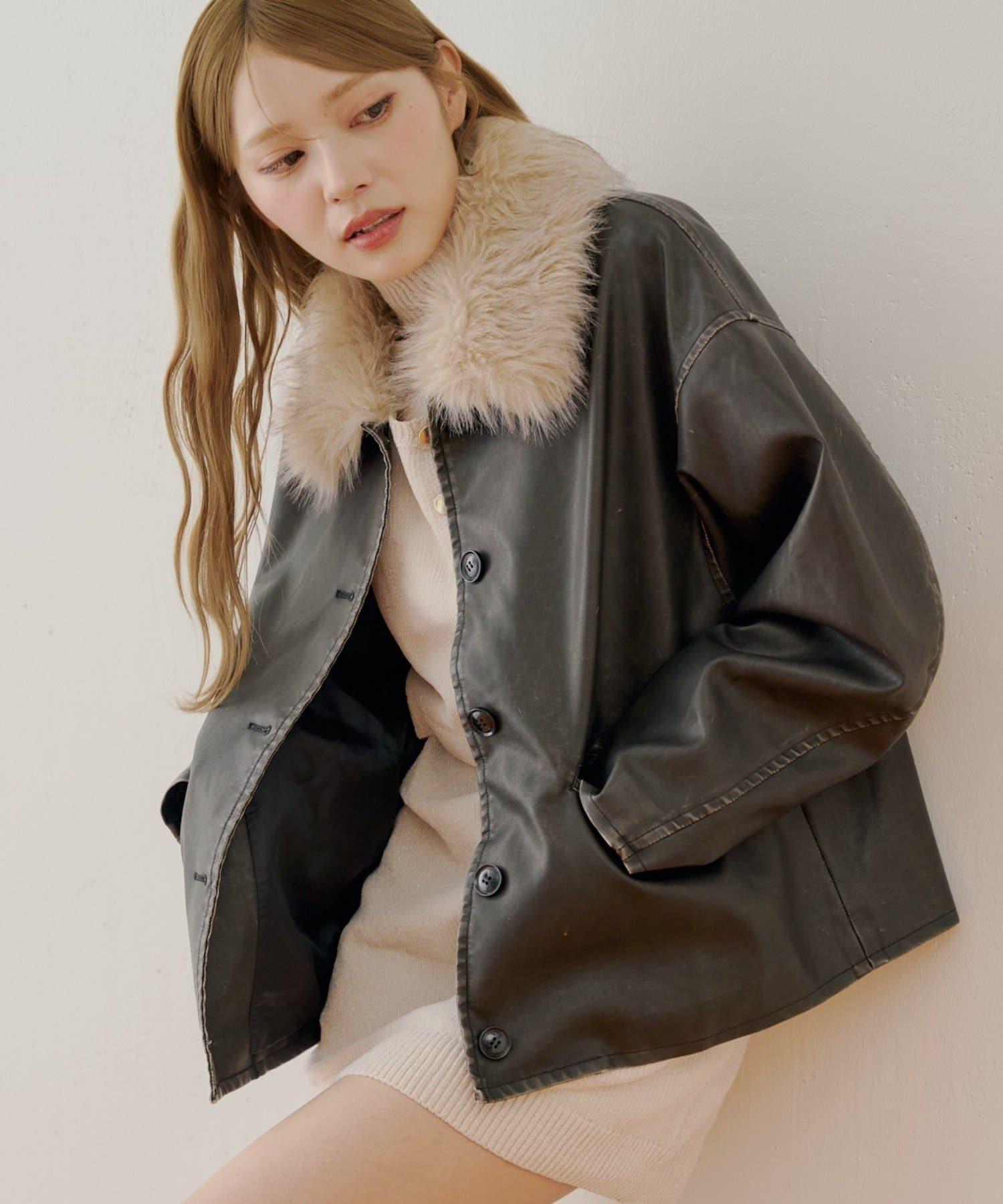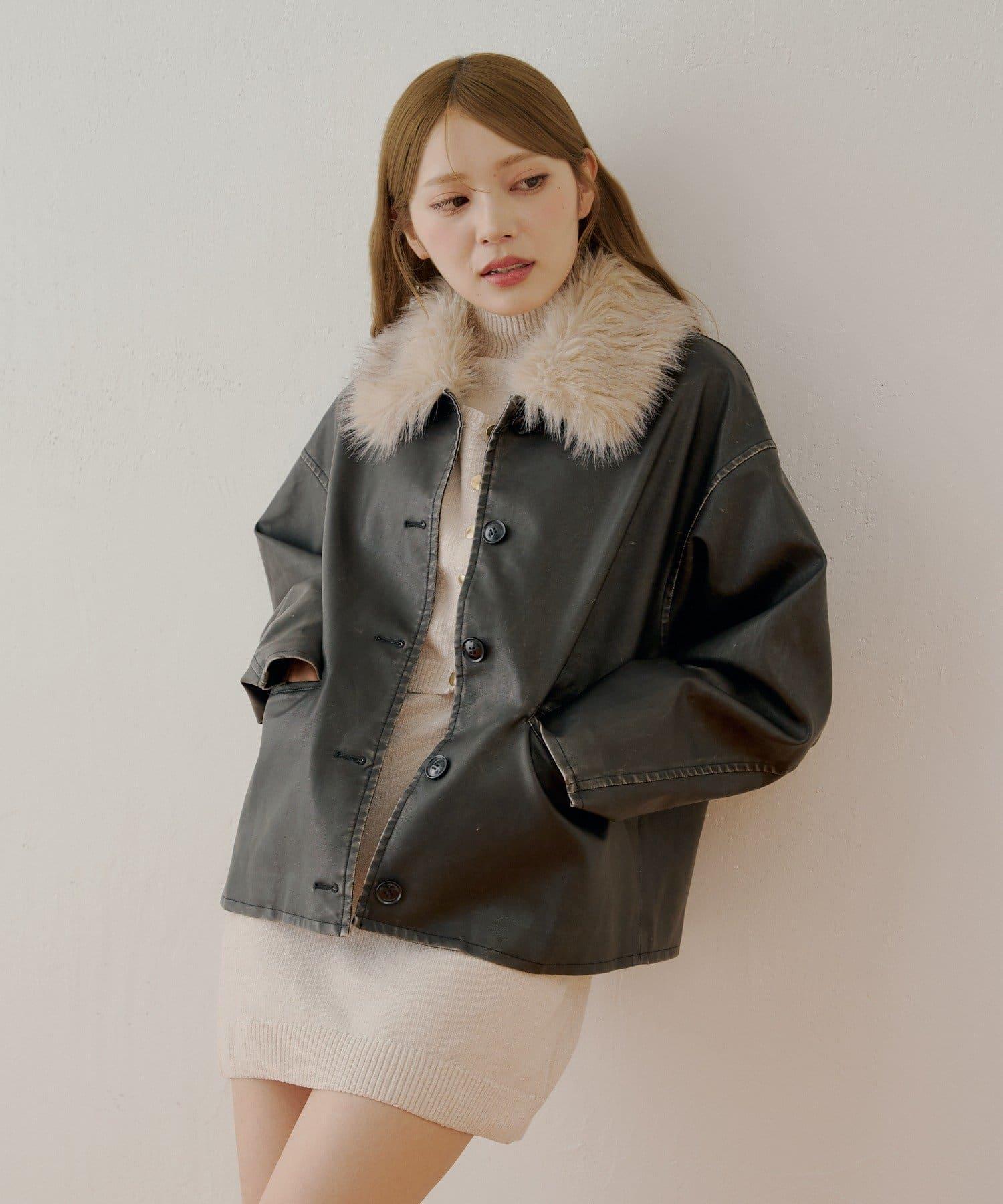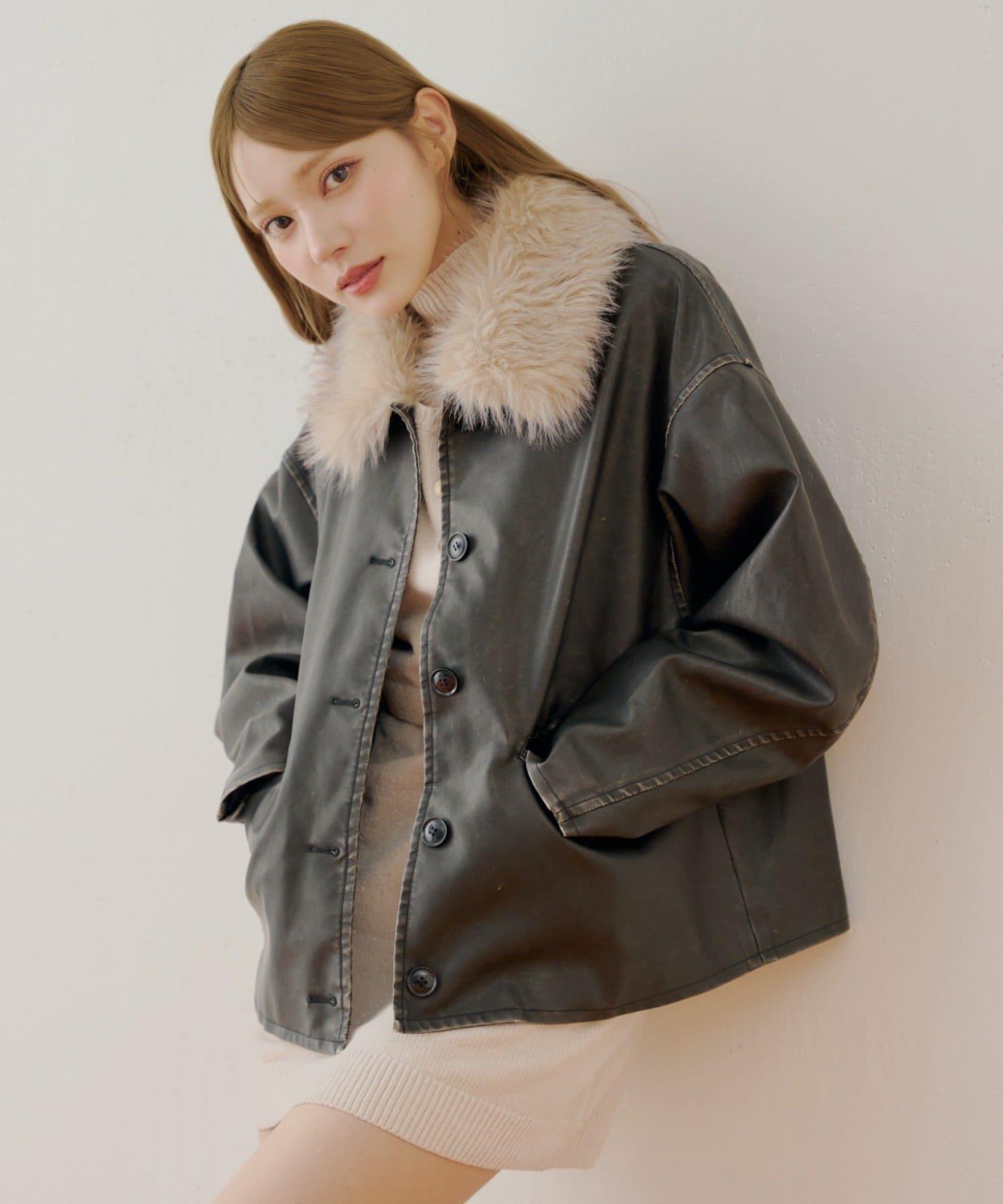 皮革寬鬆襯衫夾克,配以柔軟蓬鬆的毛領。