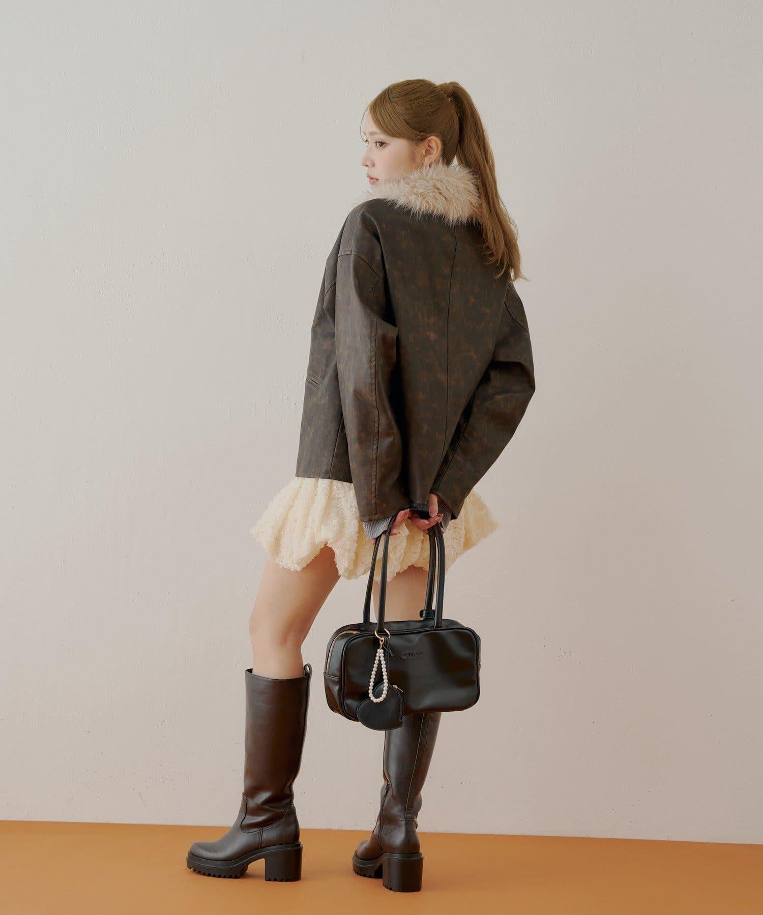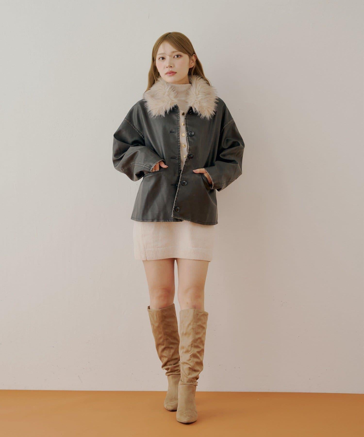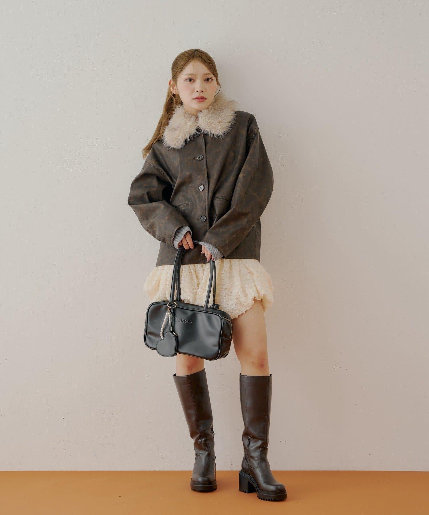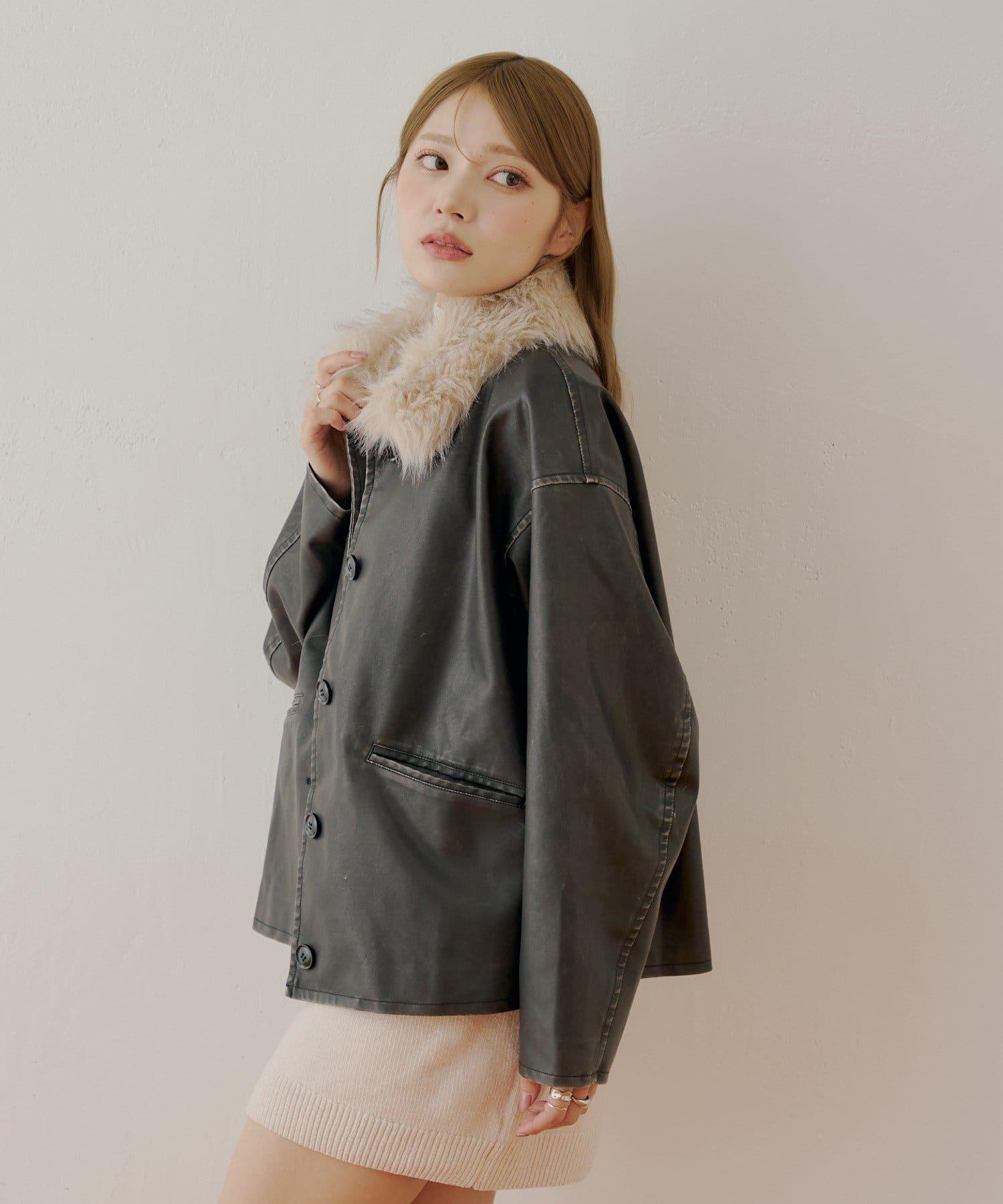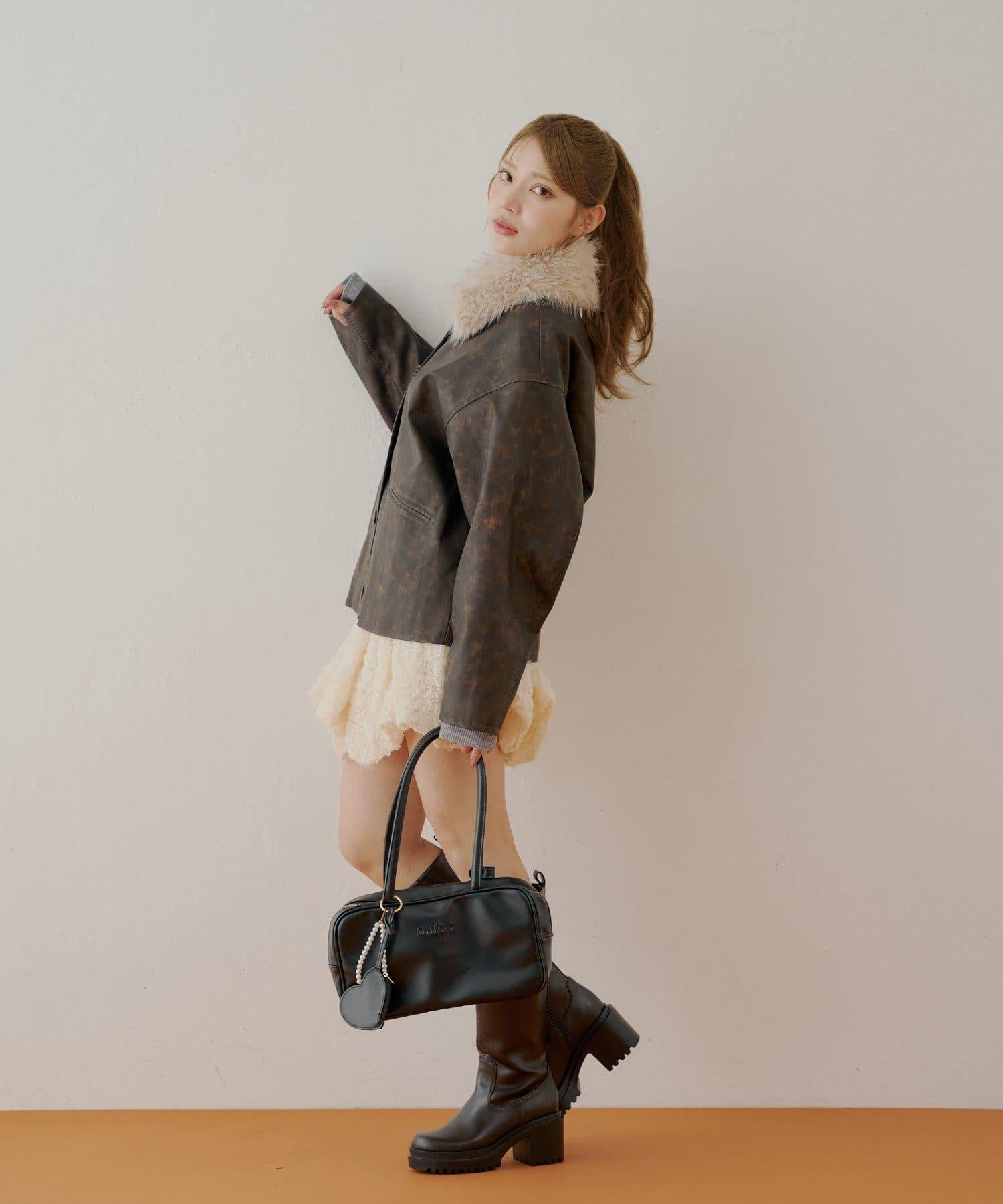 皮革寬鬆襯衫夾克,配以柔軟蓬鬆的毛領。