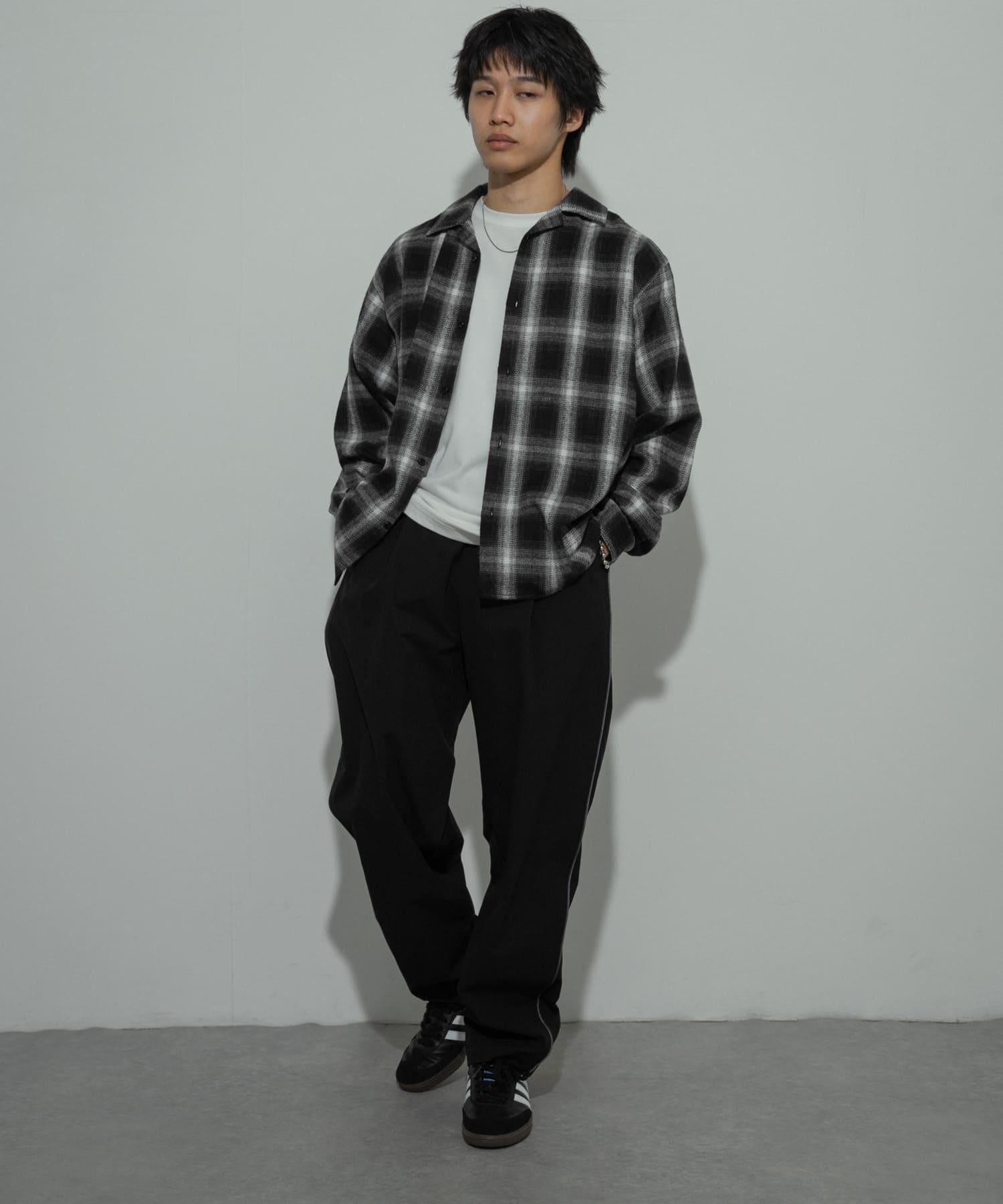 可與 AA46-17S003 Piping Stand Blouson 作為套裝穿著。雖然是運動型單品,但也建議與襯衫等美觀單品搭配。搭配皮鞋和運動鞋也能提升造型感。