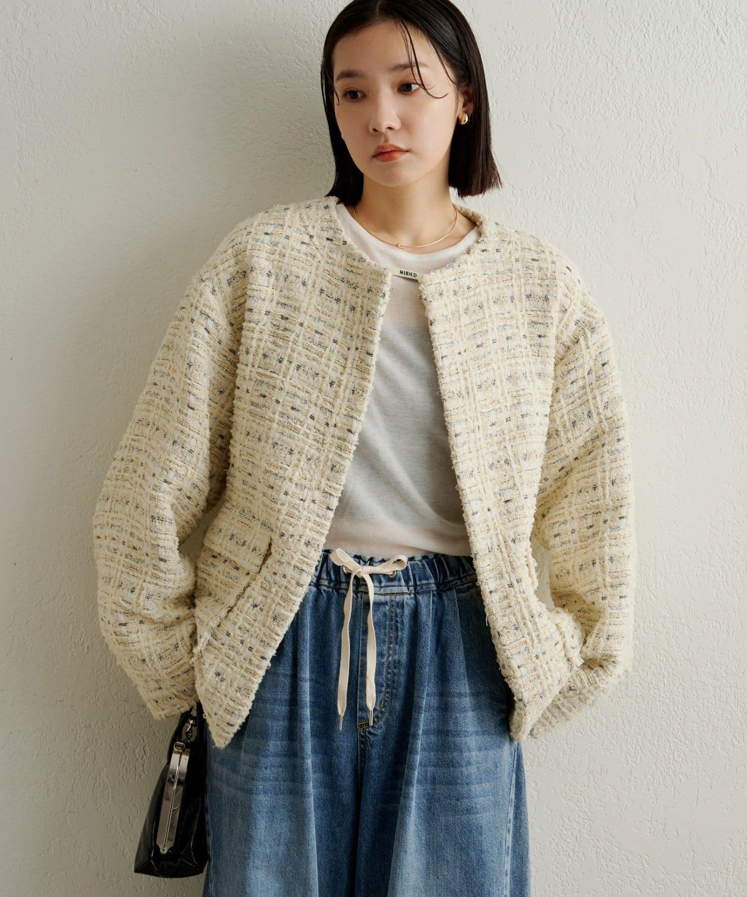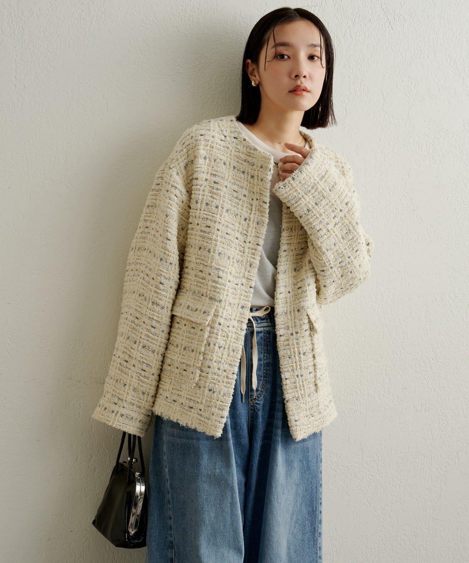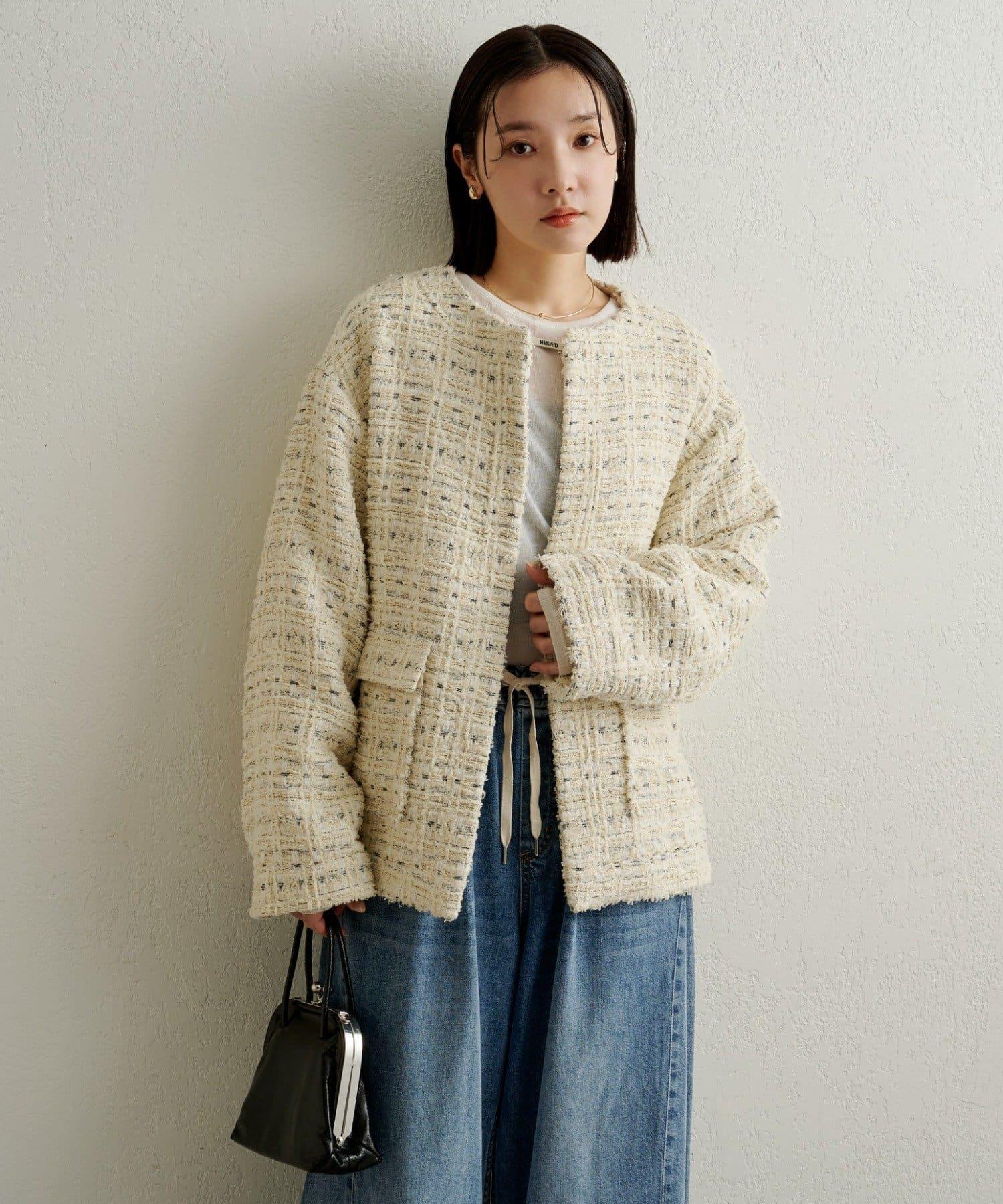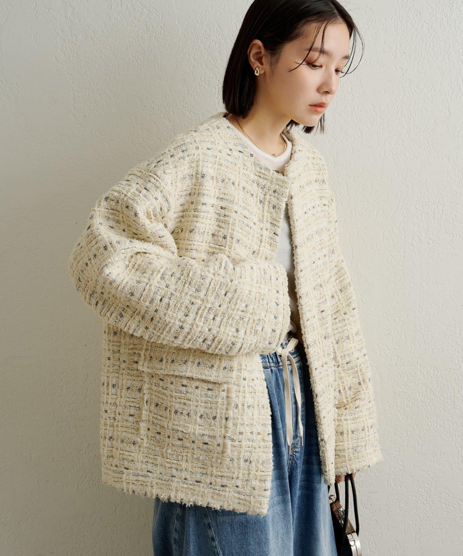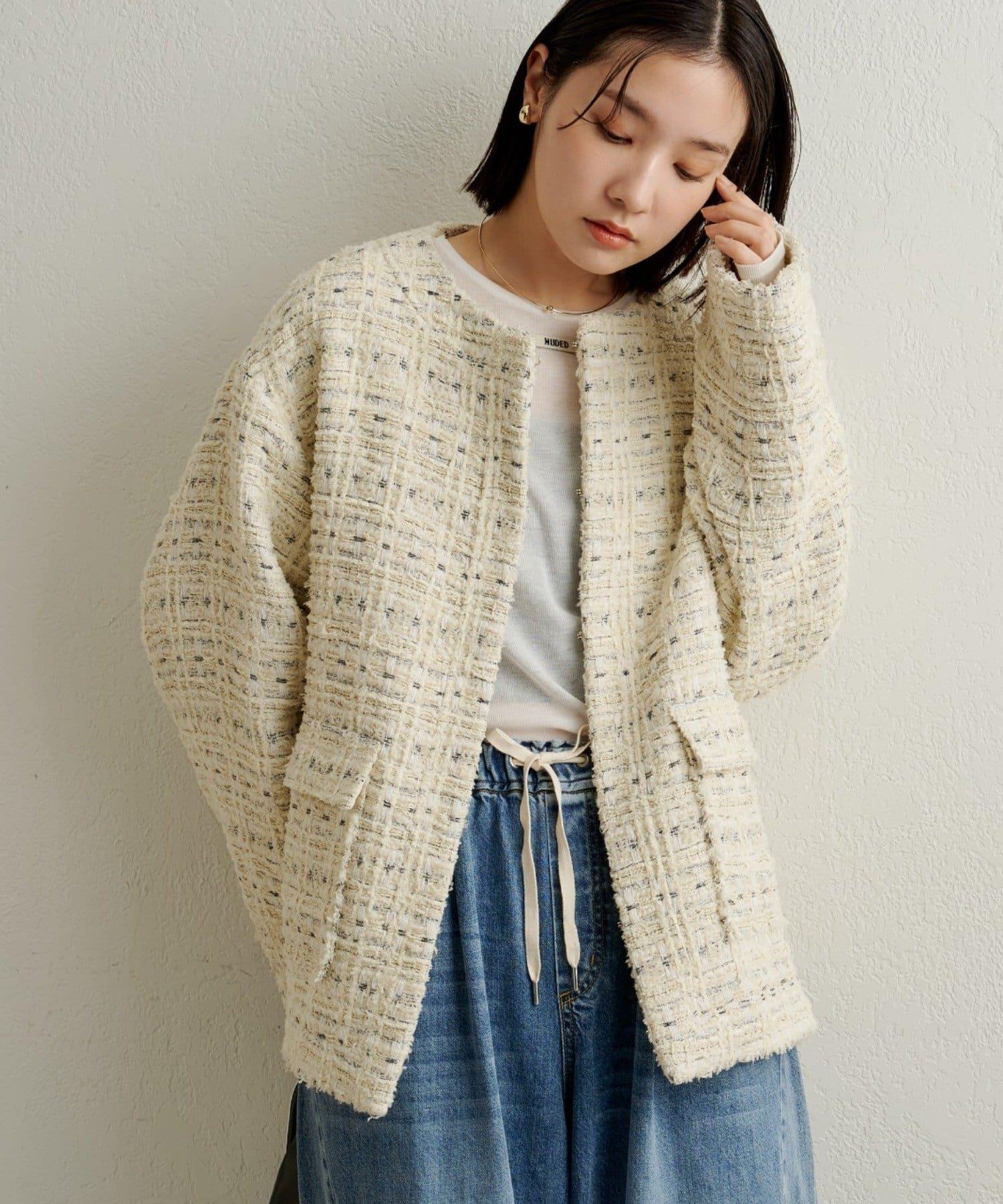 精緻編織的無領斜紋軟呢外套極具吸引力