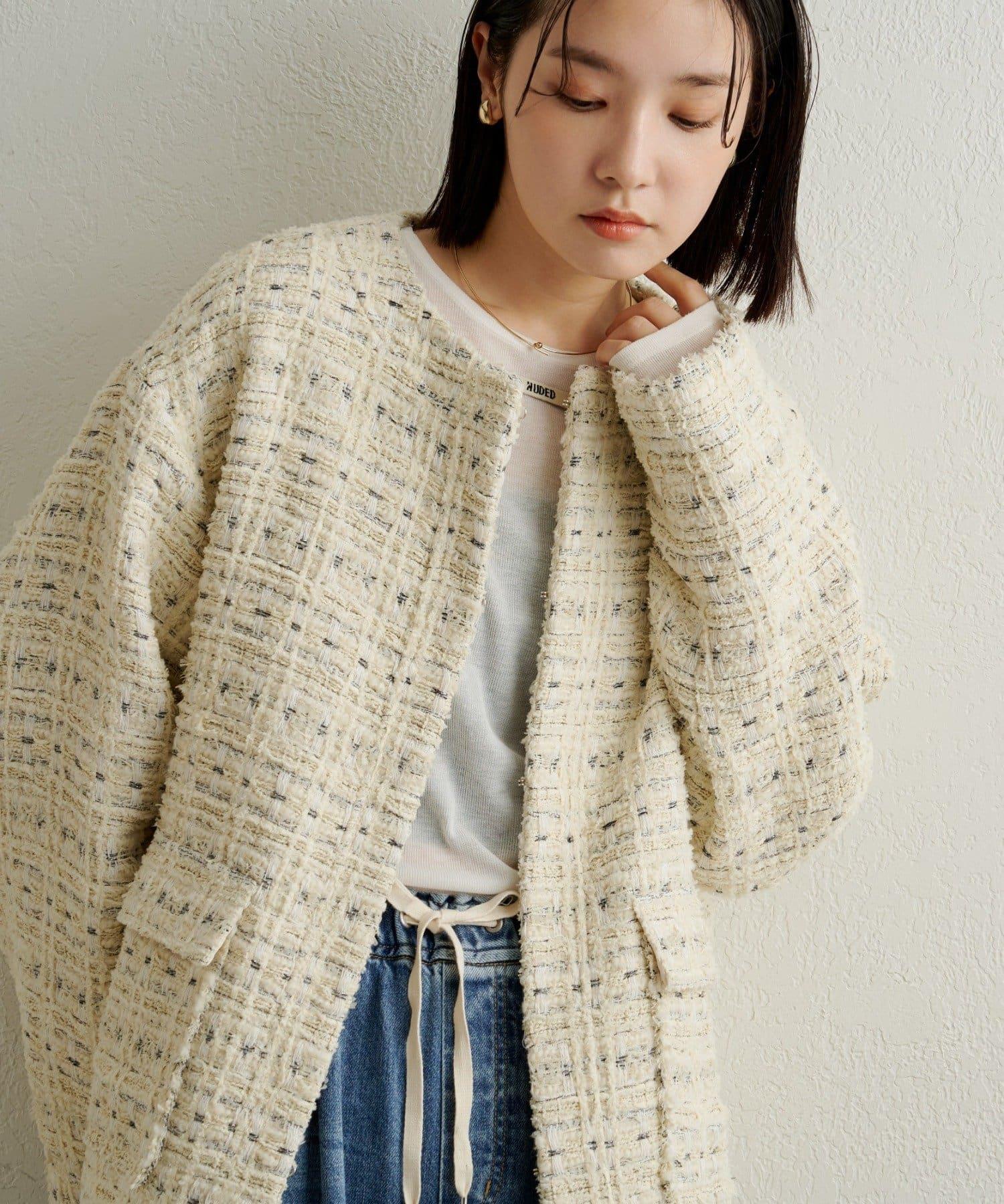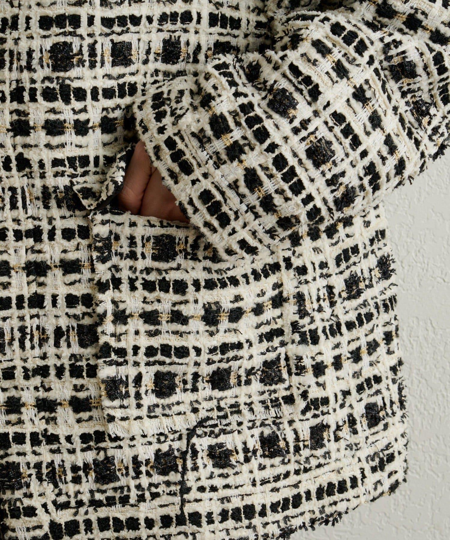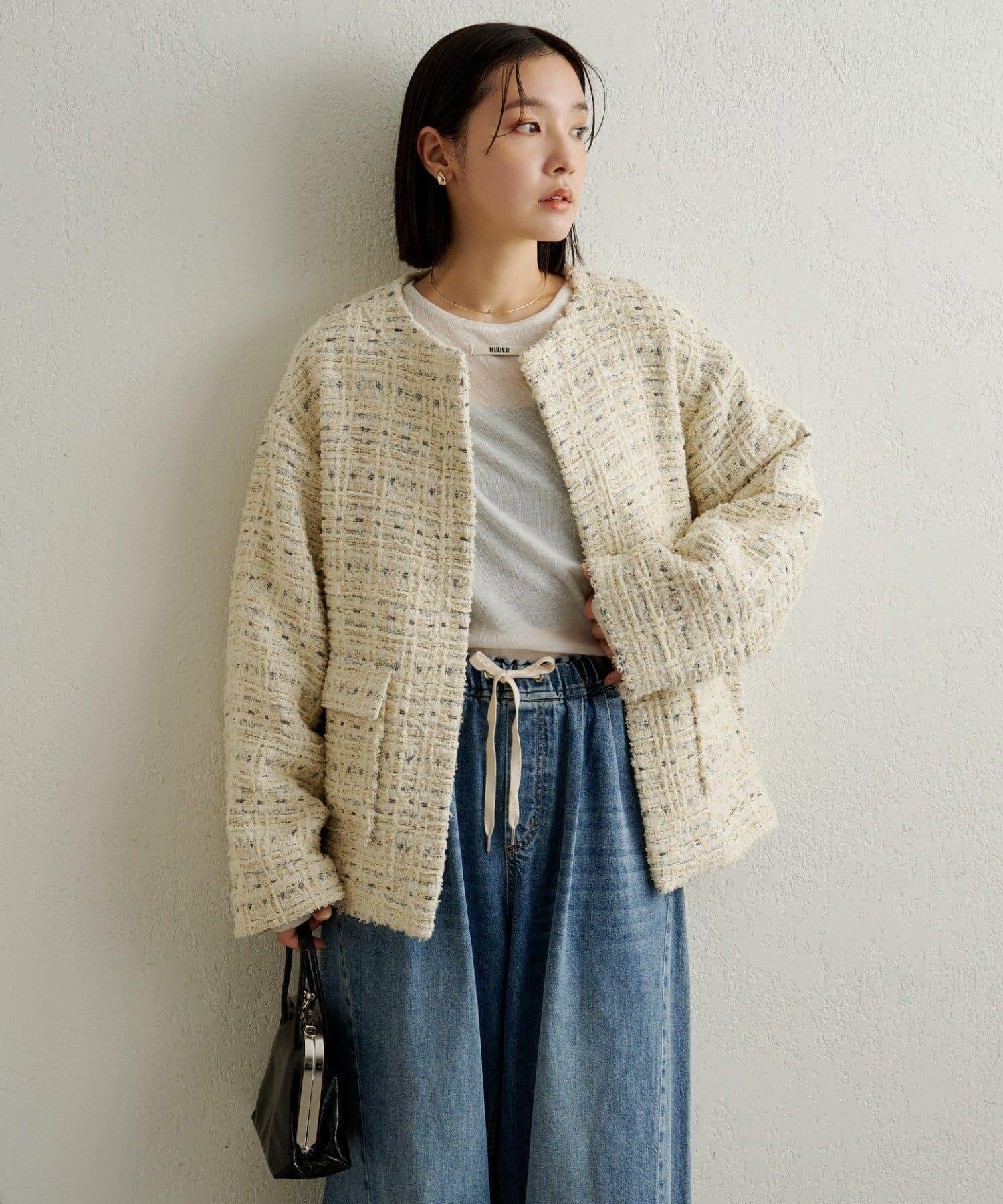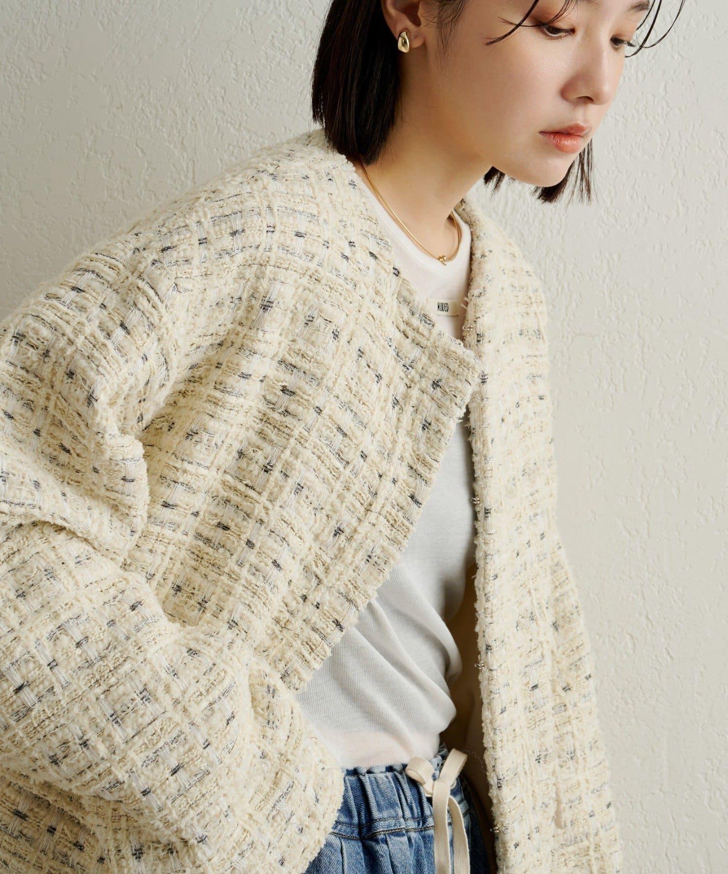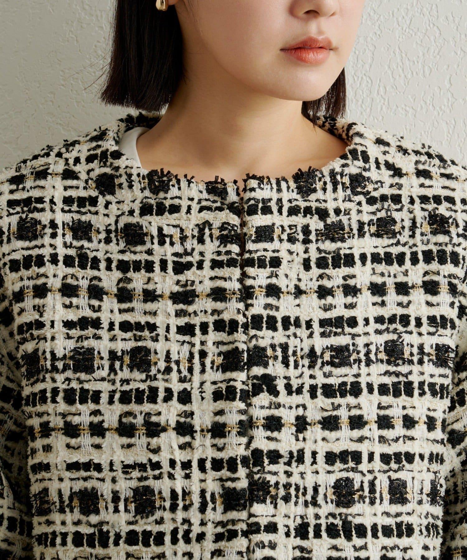 精緻編織的無領斜紋軟呢外套極具吸引力